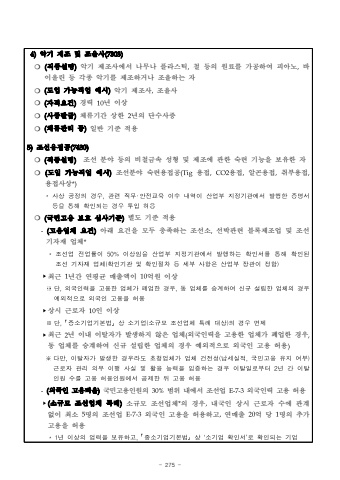 - 275 -4)%uc545%uae30 %uc81c%uc870 %ubc0f %uc870%uc728%uc0ac(7303)%u274d (%uc9c1%uc885%uc124%uba85)%uc545%uae30 %uc81c%uc870%uc0ac%uc5d0%uc11c %ub098%ubb34%ub098 %ud50c%ub77c%uc2a4%ud2f1,%ucca0 %ub4f1%uc758 %uc6d0%ub8cc%ub97c %uac00%uacf5%ud558%uc5ec %ud53c%uc544%ub178,%ubc14%uc774%uc62c%ub9b0 %ub4f1 %uac01%uc885 %uc545%uae30%ub97c %uc81c%uc870%ud558%uac70%ub098 %uc870%uc728%ud558%ub294 %uc790%u274d(%ub3c4%uc785 %uac00%ub2a5%uc9c1%uc5c5 %uc608%uc2dc)%uc545%uae30 %uc81c%uc870%uc0ac,%uc870%uc728%uc0ac%u274d (%uc790%uaca9%uc694%uac74)%uacbd%ub825 10%ub144 %uc774%uc0c1%u274d (%uc0ac%uc99d%ubc1c%uae09)%uccb4%ub958%uae30%uac04 %uc0c1%ud55c 2%ub144%uc758 %ub2e8%uc218%uc0ac%uc99d%u274d (%uccb4%ub958%uad00%ub9ac %ub4f1)%uc77c%ubc18 %uae30%uc900 %uc801%uc6a95)%uc870%uc120%uc6a9%uc811%uacf5(7430)%u274d (%uc9c1%uc885%uc124%uba85)%uc870%uc120 %ubd84%uc57c %ub4f1%uc758 %ube44%ucca0%uae08%uc18d %uc131%ud615 %ubc0f %uc81c%uc870%uc5d0 %uad00%ud55c %uc219%ub828 %uae30%ub2a5%uc744 %ubcf4%uc720%ud55c %uc790 %u274d(%ub3c4%uc785 %uac00%ub2a5%uc9c1%uc5c5 %uc608%uc2dc)%uc870%uc120%ubd84%uc57c %uc219%ub828%uc6a9%uc811%uacf5(Tig%uc6a9%uc811,CO2%uc6a9%uc811,%uc54c%uace4%uc6a9%uc811,%ucde8%ubd80%uc6a9%uc811,%uc6a9%uc811%uc0ac%uc0c1*)*%uc0ac%uc0c1%uacf5%uc815%uc758%uacbd%uc6b0,%uad00%ub828%uc9c1%ubb34%u2027%uc548%uc804%uad50%uc721%uc774%uc218%ub0b4%uc5ed%uc774%uc0b0%uc5c5%ubd80%uc9c0%uc815%uae30%uad00%uc5d0%uc11c%ubc1c%ud589%ud55c%uc99d%uba85%uc11c%ub4f1%uc744%ud1b5%ud574%ud655%uc778%ub418%ub294%uacbd%uc6b0%ud22c%uc785%ud5c8%uc6a9%u274d(%uad6d%ubbfc%uace0%uc6a9 %ubcf4%ud638 %uc2ec%uc0ac%uae30%uc900)%ubcc4%ub3c4 %uae30%uc900 %uc801%uc6a9 -(%uace0%uc6a9%uc5c5%uccb4 %uc694%uac74)%uc544%ub798 %uc694%uac74%uc744 %ubaa8%ub450 %ucda9%uc871%ud558%ub294 %uc870%uc120%uc18c,%uc120%ubc15%uad00%ub828 %ube14%ub85d%uc81c%uc870%uc5c5 %ubc0f %uc870%uc120 %uae30%uc790%uc7ac %uc5c5%uccb4**%uc870%uc120%uc5c5%uc804%uc5c5%ub960%uc77450%%uc774%uc0c1%uc784%uc744%uc0b0%uc5c5%ubd80%uc9c0%uc815%uae30%uad00%uc5d0%uc11c%ubc1c%ud589%ud558%ub294%ud655%uc778%uc11c%ub97c%ud1b5%ud574%ud655%uc778%ub41c%uc870%uc120%uae30%uc790%uc7ac%uc5c5%uccb4(%ud655%uc778%uae30%uad00%ubc0f%ud655%uc778%uc808%ucc28%ub4f1%uc138%ubd80%uc0ac%ud56d%uc740%uc0b0%uc5c5%ubd80%uc7a5%uad00%uc774%uc815%ud568)%u2023%ucd5c%uadfc 1%ub144%uac04 %uc5f0%ud3c9%uade0 %ub9e4%ucd9c%uc561%uc774 10%uc5b5%uc6d0 %uc774%uc0c1%u203b%ub2e8,%uc678%uad6d%uc778%ub825%uc744%uace0%uc6a9%ud55c%uc5c5%uccb4%uac00%ud3d0%uc5c5%ud55c%uacbd%uc6b0,%ub3d9%uc5c5%uccb4%ub97c%uc2b9%uacc4%ud558%uc5ec%uc2e0%uaddc%uc124%ub9bd%ud55c%uc5c5%uccb4%uc758%uacbd%uc6b0%uc608%uc678%uc801%uc73c%ub85c%uc678%uad6d%uc778%uace0%uc6a9%uc744%ud5c8%uc6a9%u2023%uc0c1%uc2dc %uadfc%ub85c%uc790 10%uc778 %uc774%uc0c1 %u203b%ub2e8,%uff62%uc911%uc18c%uae30%uc5c5%uae30%ubcf8%ubc95%uff63%uc0c1%uc18c%uae30%uc5c5(%uc18c%uaddc%ubaa8%uc870%uc120%uc5c5%uccb4%ud2b9%ub840%ub300%uc0c1)%uc758%uacbd%uc6b0%uba74%uc81c%u2023%ucd5c%uadfc 2%ub144 %uc774%ub0b4 %uc774%ud0c8%uc790%uac00 %ubc1c%uc0dd%ud558%uc9c0 %uc54a%uc740 %uc5c5%uccb4(%uc678%uad6d%uc778%ub825%uc744 %uace0%uc6a9%ud55c %uc5c5%uccb4%uac00 %ud3d0%uc5c5%ud55c %uacbd%uc6b0,%ub3d9 %uc5c5%uccb4%ub97c %uc2b9%uacc4%ud558%uc5ec %uc2e0%uaddc %uc124%ub9bd%ud55c %uc5c5%uccb4%uc758 %uacbd%uc6b0 %uc608%uc678%uc801%uc73c%ub85c %uc678%uad6d%uc778 %uace0%uc6a9 %ud5c8%uc6a9)%u203b%ub2e4%ub9cc,%uc774%ud0c8%uc790%uac00%ubc1c%uc0dd%ud55c%uacbd%uc6b0%ub77c%ub3c4%ucd08%uccad%uc5c5%uccb4%uac00%uc5c5%uccb4%uac74%uc804%uc131(%ub0a9%uc138%uc2e4%uc801,%uad6d%ubbfc%uace0%uc6a9%uc720%uc9c0%uc5ec%ubd80)%uadfc%ub85c%uc790%uad00%ub9ac%uc758%ubb34%uc774%ud589%uc0ac%uc2e4%ubc0f%ud65c%uc6a9%ub2a5%ub825%uc744%uc785%uc99d%ud558%ub294%uacbd%uc6b0%uc774%ud0c8%uc77c%ub85c%ubd80%ud1302%ub144%uac04%uc774%ud0c8%uc778%uc6d0%uc218%ub97c%uace0%uc6a9%ud5c8%uc6a9%uc778%uc6d0%uc5d0%uc11c%uacf5%uc81c%ud55c%ub4a4%uace0%uc6a9%ud5c8%uc6a9-(%uc678%uad6d%uc778 %uace0%uc6a9%ube44%uc728)%uad6d%ubbfc%uace0%uc6a9%uc778%uc6d0%uc758 30%%ubc94%uc704 %ub0b4%uc5d0%uc11c %uc870%uc120%uc5c5 E-7-3%uc678%uad6d%uc778%ub825 %uace0%uc6a9 %ud5c8%uc6a9%u2023(%uc18c%uaddc%ubaa8 %uc870%uc120%uc5c5%uccb4 %ud2b9%ub840)%uc18c%uaddc%ubaa8 %uc870%uc120%uc5c5%uccb4*%uc758 %uacbd%uc6b0,%ub0b4%uad6d%uc778 %uc0c1%uc2dc %uadfc%ub85c%uc790 %uc218%uc5d0 %uad00%uacc4%uc5c6%uc774 %ucd5c%uc18c 5%uba85%uc758 %uc870%uc120%uc5c5 E-7-3%uc678%uad6d%uc778 %uace0%uc6a9%uc744 %ud5c8%uc6a9%ud558%uace0,%uc5f0%ub9e4%ucd9c 20%uc5b5 %ub2f9 1%uba85%uc758 %ucd94%uac00%uace0%uc6a9%uc744 %ud5c8%uc6a9*1%ub144%uc774%uc0c1%uc758%uc5c5%ub825%uc744%ubcf4%uc720%ud558%uace0,%uff62%uc911%uc18c%uae30%uc5c5%uae30%ubcf8%ubc95%uff63%uc0c1%u2018%uc18c%uae30%uc5c5%ud655%uc778%uc11c%u2019%ub85c%ud655%uc778%ub418%ub294%uae30%uc5c5
