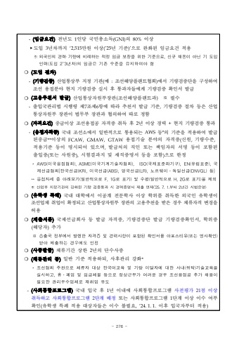 - 276 --(%uc784%uae08%uc694%uac74)%uc804%ub144%ub3c4 1%uc778%ub2f9 %uad6d%ubbfc%ucd1d%uc18c%ub4dd(GNI)%uc758 80%%uc774%uc0c1 %u2023%ub3c4%uc785 3%ub144%ucc28%uae4c%uc9c0 %u20182,515%ub9cc%uc6d0 %uc774%uc0c1(%u201925%ub144 %uae30%uc900)%u2019%uc73c%ub85c %uc644%ud654%ub41c %uc784%uae08%uc694%uac74 %uc801%uc6a9%u203b%uc678%uad6d%uc778%uc758%uacbd%ub825%u2027%uae30%ub7c9%uc5d0%ube44%ub840%ud558%ub294%uc801%uc815%uc784%uae08%ubcf4%uc7a5%uc744%uc704%ud55c%uae30%uc900%uc73c%ub85c,%uc2e0%uaddc%ucc44%uc6a9%uc774%uc544%ub2cc%uae30%ub3c4%uc785%uc778%ub825(%ub3c4%uc7852~3%ub144%ucc28)%uc758%uc784%uae08%uc740%uae30%uc874%uc218%uc900%uc744%uc720%uc9c0%ud558%uc5ec%uc57c%ud568%u274d(%ub3c4%uc785 %uc808%ucc28)-(%uae30%ub7c9%uac80%uc99d)%uc0b0%uc5c5%ud1b5%uc0c1%ubd80 %uc9c0%uc815 %uae30%uad00(%uc608 :%uc870%uc120%ud574%uc591%ud50c%ub79c%ud2b8%ud611%ud68c)%uc5d0%uc11c %uae30%ub7c9%uac80%uc99d%ub2e8%uc744 %uad6c%uc131%ud558%uc5ec%uc870%uc120 %uc6a9%uc811%ubd84%uc57c %ud604%uc9c0 %uae30%ub7c9%uac80%uc99d %uc2e4%uc2dc %ud6c4 %ud1b5%uacfc%uc790%ub4e4%uc5d0%uac8c %uae30%ub7c9%uac80%uc99d %ud655%uc778%uc11c %ubc1c%uae09%u274d (%uace0%uc6a9%ucd94%ucc9c%uc11c %ubc1c%uae09)%uc0b0%uc5c5%ud1b5%uc0c1%uc790%uc6d0%ubd80%uc7a5%uad00(%uc870%uc120%ud574%uc591%ud50c%ub79c%ud2b8%uacfc)%u203b%ud544%uc218-%ucd9c%uc785%uad6d%uad00%ub9ac%ubc95 %uc2dc%ud589%ub839 %uc81c7%uc870%uc81c6%ud56d%uc5d0 %ub530%ub77c %ucd94%ucc9c%uc11c %ubc1c%uae09 %uae30%uc900,%uae30%ub7c9%uac80%uc99d %uc808%ucc28 %ub4f1%uc740 %uc0b0%uc5c5%ud1b5%uc0c1%uc790%uc6d0%ubd80 %uc7a5%uad00%uc774 %ubc95%ubb34%ubd80 %uc7a5%uad00%uacfc %ud611%uc758%ud558%uc5ec %ub530%ub85c %uc815%ud568 %u274d (%uc790%uaca9%uc694%uac74)%uc911%uae09%uc774%uc0c1 %uc870%uc120%uc6a9%uc811%uacf5 %uc790%uaca9%uc99d %ucde8%ub4dd %ud6c4 2%ub144 %uc774%uc0c1 %uacbd%ub825 +%ud604%uc9c0 %uae30%ub7c9%uac80%uc99d %ud1b5%uacfc-(%uc6a9%uc811%uc790%uaca9%uc99d)%uad6d%ub0b4 %uc870%uc120%uc18c%uc5d0%uc11c %uc77c%ubc18%uc801%uc73c%ub85c %ud1b5%uc6a9%ub418%ub294AWS%ub4f1*%uc758 %uae30%uc900%uc744 %uc801%uc6a9%ud558%uc5ec %ubc1c%uae09%ub41c%uc911%uae09**%uc774%uc0c1%uc758FCAW,GMAW,GTAW%uc6a9%uc811%uae30%uc220 %ubd84%uc57c%uc758 %uc790%uaca9%uc99d(%uc2e0%uc6d0,%uae30%ub7c9%uc218%uc900,%uc801%uc6a9%uae30%uc900 %ub4f1%uc774 %uba85%uc2dc%ub418%uc5b4 %uc788%uc73c%uba70,%ubc1c%uae09%ucc98%uc758 %uc9c1%uc778 %ub610%ub294 %ucc45%uc784%uc790%uc758 %uc11c%uba85 %ub4f1%uc774 %ud3ec%ud568%ub41c %ucd9c%uc785%uc99d(%ub610%ub294 %uc0ac%uc6d0%uc99d),%uc2dc%ud5d8%uacb0%uacfc%uc9c0 %ubc0f %uc7ac%uc9c1%uc99d%uba85%uc11c %ub4f1%uc744 %ud3ec%ud568)%uc73c%ub85c %ud55c%uc815*AWS(%ubbf8%uad6d%uc6a9%uc811%ud611%ud68c),ASME(%ubbf8%uad6d%uae30%uacc4%uae30%uc220%uc790%ud611%ud68c),ISO(%uad6d%uc81c%ud45c%uc900%ud654%uae30%uad6c),EN(%uc720%ub7fd%ud45c%uc900),%uad6d%uc81c%uc120%ud611%ud68c[%ud55c%uad6d%uc120(KR),%ubbf8%uad6d%uc120(AS),%uc601%uc120(LR),%uc6e8%uc774%uc77c%uc120(DGL)%ub4f1]**%uc6a9%uc811%uc790%uc138%uc911%uc544%ub798%ubcf4%uae30(%uc77c%ubc18%uc801%uc73c%ub85cF,1G%ub85c%ud45c%uae30)%ubc0f%uc218%ud3c9(%uc77c%ubc18%uc801%uc73c%ub85cH,2G%ub85c%ud45c%uae30)%uc744%uc81c%uc678%u203b%uc0b0%uc5c5%ubd80%uc9c0%uc815%uae30%uad00%uc758%uac15%ud654%ub41c%uae30%ub7c9%uac80%uc99d%ud1b5%uacfc%uc2dc%uacbd%ub825%uc99d%uba85%uc11c%uc81c%ucd9c%uba74%uc81c(%u201925.7.1.%ubd80%ud1302%ub144%uac04%uc2dc%ubc94%uc6b4%uc601)%u274d (%uc720%ud559%uc0dd %ud2b9%ub840)%uad6d%ub0b4 %ub300%ud559%uc5d0%uc11c %uc774%uacf5%uacc4 %uc804%ubb38%ud559%uc0ac %uc774%uc0c1 %ud559%uc704%ub97c %ucde8%ub4dd%ud55c %uc678%uad6d%uc778 %uc720%ud559%uc0dd%uc774%uc870%uc120%uc5c5%uccb4 %ucde8%uc5c5%uc774 %ud655%uc815%ub418%uace0 %uc0b0%uc5c5%ud1b5%uc0c1%uc790%uc6d0%ubd80 %uc7a5%uad00%uc758 %uace0%uc6a9%ucd94%ucc9c%uc744 %ubc1b%uc740 %uacbd%uc6b0 %uccb4%ub958%uc790%uaca9 %ubcc0%uacbd%uc744%ud5c8%uc6a9%u274d (%uc81c%ucd9c%uc11c%ub958)%uad6d%uc81c%uc120%uae09%ud68c%uc0ac %ub4f1 %ubc1c%uae09 %uc790%uaca9%uc99d,%uae30%ub7c9%uac80%uc99d%ub2e8 %ubc1c%uae09 %uae30%ub7c9%uac80%uc99d%ud655%uc778%uc11c,%ud559%uc704%uc99d(%ud574%ub2f9%uc790)%ucd94%uac00%u203b%uc1a1%ucd9c%uad6d%uc815%ubd80%uc5d0%uc11c%ubc1c%ud589%ud55c%uc790%uaca9%uc99d%ubc0f%uacbd%ub825%uc0ac%ud56d%uc774%ud3ec%ud568%ub41c%ud655%uc778%uc11c%ub97c%uc544%ud3ec%uc2a4%ud2f0%uc720(%ub610%ub294%uc601%uc0ac%ud655%uc778)%ubc1b%uc544%uc81c%ucd9c%ud558%ub294%uacbd%uc6b0%uc5d0%ub3c4%uc778%uc815%u274d (%uc0ac%uc99d%ubc1c%uae09)%uccb4%ub958%uae30%uac04 %uc0c1%ud55c 2%ub144%uc758 %ub2e8%uc218%uc0ac%uc99d%u274d (%uccb4%ub958%uad00%ub9ac %ub4f1)%uc77c%ubc18 %uae30%uc900 %uc801%uc6a9%ud558%ub418,%uc0ac%ud6c4%uad00%ub9ac %uac15%ud654**%uc870%uc120%ud611%ud68c%uc8fc%uad00%uc73c%ub85c%uccb4%ub958%uc790%ub300%uc0c1%ud55c%uad6d%uc5b4%uad50%uc721%ubc0f%uae30%ub7c9%ubbf8%ub2ec%uc790%uc5d0%ub300%ud55c%uc0ac%ub0b4(%uc704%ud0c1)%uae30%uc220%uad50%uc721%uc744%uc2e4%uc2dc%ud558%uace0,%ud734%u2024%ud3d0%uc5c5%ubc0f%uc784%uae08%uccb4%ubd88%ub4f1%uc73c%ub85c%uc815%uc0c1%uadfc%ubb34%uac00%uc5b4%ub824%uc6b4%uacbd%uc6b0%uc870%uc120%uc6a9%uc811%uacf5%ucd94%uac00%ucc44%uc6a9%uc774%ud544%uc694%ud55c%uad00%ub9ac%uc6b0%uc218%uc5c5%uccb4%ub85c%uc7ac%ucde8%uc5c5%uc720%ub3c4-(%uc0ac%ud68c%ud1b5%ud569%ud504%ub85c%uadf8%ub7a8)%uad6d%ub0b4 %uc785%uad6d %ud6c4 1%ub144 %uc774%ub0b4%uc5d0 %uc0ac%ud68c%ud1b5%ud569%ud504%ub85c%uadf8%ub7a8 %uc0ac%uc804%ud3c9%uac00 21%uc810 %uc774%uc0c1 %ucde8%ub4dd%ud558%uace0 %uc0ac%ud68c%ud1b5%ud569%ud504%ub85c%uadf8%ub7a8 2%ub2e8%uacc4 %ubc30%uc815%ub610%ub294 %uc0ac%ud68c%ud1b5%ud569%ud504%ub85c%uadf8%ub7a8 1%ub2e8%uacc4 %uc774%uc0c1 %uc774%uc218 %uc5ec%ubd80%ud655%uc778(%uc720%ud559%uc0dd %ud2b9%ub840 %uc801%uc6a9 %ub300%uc0c1%uc790%ub4e4%uc740%uc774%uc218 %ubd88%ud544%uc694,%u201924.1.1.%uc774%ud6c4 %uc785%uad6d%uc790%ubd80%ud130 %uc801%uc6a9)