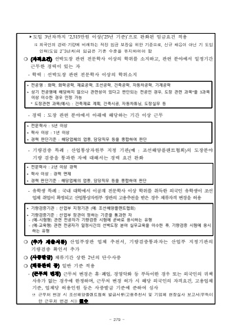 - 279 -%u2023%ub3c4%uc785 3%ub144%ucc28%uae4c%uc9c0 %u20182,515%ub9cc%uc6d0 %uc774%uc0c1(%u201925%ub144 %uae30%uc900)%u2019%uc73c%ub85c %uc644%ud654%ub41c %uc784%uae08%uc694%uac74 %uc801%uc6a9%u203b%uc678%uad6d%uc778%uc758%uacbd%ub825%u2027%uae30%ub7c9%uc5d0%ube44%ub840%ud558%ub294%uc801%uc815%uc784%uae08%ubcf4%uc7a5%uc744%uc704%ud55c%uae30%uc900%uc73c%ub85c,%uc2e0%uaddc%ucc44%uc6a9%uc774%uc544%ub2cc%uae30%ub3c4%uc785%uc778%ub825(%ub3c4%uc7852~3%ub144%ucc28)%uc758%uc784%uae08%uc740%uae30%uc874%uc218%uc900%uc744%uc720%uc9c0%ud558%uc5ec%uc57c%ud568%u274d (%uc790%uaca9%uc694%uac74)%uc120%ubc15%ub3c4%uc7a5 %uad00%ub828 %uc804%ubb38%ud559%uc0ac %uc774%uc0c1%uc758 %ud559%uc704%ub97c %uc18c%uc9c0%ud558%uace0,%uad00%ub828 %ubd84%uc57c%uc5d0%uc11c %uc77c%uc815%uae30%uac04%uadfc%ubb34%ud55c %uacbd%ub825%uc774 %uc788%ub294 %uc790-%ud559%ub825 :%uc120%ubc15%ub3c4%uc7a5 %uad00%ub828 %uc804%ubb38%ud559%uc0ac %uc774%uc0c1%uc758 %ud559%uc704%uc18c%uc9c0%u2023 %uc804%uacf5%uba85 : %ud654%ud559, %ud654%ud559%uacf5%ud559, %uc7ac%ub8cc%uacf5%ud559, %uc870%uc120%uacf5%ud559, %uac74%ucd95%uacf5%ud559, %uc790%ub3d9%ucc28%uacf5%ud559, %uae30%uacc4%uacf5%ud559%u2023 %uc0c1%uae30 %uc804%uacf5%uba85%uc5d0 %ud574%ub2f9%ud558%uc9c0 %uc54a%uc73c%ub098 %uad00%ub828%uc131%uc774 %uc788%ub2e4%uace0 %ud310%ub2e8%ub418%ub294 %uc804%uacf5%uc778 %uacbd%uc6b0, %ub3c4%uc7a5 %uad00%ub828 %uacfc%ubaa9*%uc744 3%uacfc%ubaa9 %uc774%uc0c1 %uc774%uc218%ud55c %uacbd%uc6b0 %uc778%uc815 %uac00%ub2a5* %ub3c4%uc7a5%uad00%ub828 %uacfc%ubaa9(%uc608%uc2dc) : %uac74%ucd95%uc7ac%ub8cc %uacc4%ud68d, %uac74%ucd95%uc2dc%uacf5, %uc790%ub3d9%ucc28%ud29c%ub2dd, %ub3c4%uc7a5%uc2e4%ubb34 %ub4f1-%uacbd%ub825 :%ub3c4%uc7a5 %uad00%ub828 %ubd84%uc57c%uc5d0%uc11c %uc544%ub798%uc5d0 %ud574%ub2f9%ud558%ub294 %uae30%uac04 %uc774%uc0c1 %uadfc%ubb34 %u2023 %uc804%ubb38%ud559%uc0ac : 5%ub144 %uc774%uc0c1%u2023 %ud559%uc0ac %uc774%uc0c1 : 1%ub144 %uc774%uc0c1%u2023 %uacbd%ub825 %ud310%ub2e8%uae30%uc900 : %ud574%ub2f9%uc5c5%uccb4%uc758 %uc5c5%uc885, %ub2f4%ub2f9%uc9c1%ubb34 %ub4f1%uc744 %uc885%ud569%ud558%uc5ec %ud310%ub2e8-%uae30%ub7c9%uac80%uc99d %ud2b9%ub840 :%uc0b0%uc5c5%ud1b5%uc0c1%uc790%uc6d0%ubd80 %uc9c0%uc815 %uae30%uad00(%uc608 :%uc870%uc120%ud574%uc591%ud50c%ub79c%ud2b8%ud611%ud68c)%uc758 %ub3c4%uc7a5%ubd84%uc57c %uae30%ub7c9 %uac80%uc99d%uc744 %ud1b5%uacfc%ud55c %uc790%uc5d0 %ub300%ud574%uc11c%ub294 %uacbd%ub825 %uc694%uac74 %uc644%ud654%u2023 %uc804%ubb38%ud559%uc0ac : 2%ub144 %uc774%uc0c1 %uacbd%ub825%u2023 %ud559%uc0ac %uc774%uc0c1 : %uacbd%ub825 %uba74%uc81c %u2023 %uacbd%ub825 %ud310%ub2e8%uae30%uc900 : %ud574%ub2f9%uc5c5%uccb4%uc758 %uc5c5%uc885, %ub2f4%ub2f9%uc9c1%ubb34 %ub4f1%uc744 %uc885%ud569%ud558%uc5ec %ud310%ub2e8-%uc720%ud559%uc0dd %ud2b9%ub840 :%uad6d%ub0b4 %ub300%ud559%uc5d0%uc11c %uc774%uacf5%uacc4 %uc804%ubb38%ud559%uc0ac %uc774%uc0c1 %ud559%uc704%ub97c %ucde8%ub4dd%ud55c %uc678%uad6d%uc778 %uc720%ud559%uc0dd%uc774%uc870%uc120%uc5c5%uccb4 %ucde8%uc5c5%uc774 %ud655%uc815%ub418%uace0 %uc0b0%uc5c5%ud1b5%uc0c1%uc790%uc6d0%ubd80 %uc7a5%uad00%uc758 %uace0%uc6a9%ucd94%ucc9c%uc744 %ubc1b%uc740 %uacbd%uc6b0 %uccb4%ub958%uc790%uaca9 %ubcc0%uacbd%uc744%ud5c8%uc6a9%u2023 %uae30%ub7c9%uac80%uc99d%uae30%uad00 : %uc0b0%uc5c5%ubd80 %uc9c0%uc815%uae30%uad00 (%uc608: %uc870%uc120%ud574%uc591%ud50c%ub79c%ud2b8%ud611%ud68c)%u2023 %uae30%ub7c9%uac80%uc99d%uae30%uc900 : %uc0b0%uc5c5%ubd80 %uc7a5%uad00%uc774 %uc815%ud558%ub294 %uae30%uc900%uc744 %ud1b5%uacfc%ud55c %uc790-(%uc608-%uc2dc%ud5d8%ud615) %uad00%ub828 %uc804%uacf5%uc790%uac00 %uae30%ub7c9%uac80%uc99d %uc2dc%ud5d8%uc5d0 %uace7%ubc14%ub85c %uc751%uc2dc%ud558%ub294 %uc720%ud615-(%uc608-%uad50%uc721%ud615) %uad00%ub828 %uc804%uacf5%uc790%uac00 %uc77c%uc815%uc2dc%uac04%uc758 %uc120%ubc15%ub3c4%uc7a5 %ubd84%uc57c %uc2e4%ubb34%uad50%uc721%uc744 %uc774%uc218%ud55c %ud6c4, %uae30%ub7c9%uac80%uc99d %uc2dc%ud5d8%uc5d0 %uc751%uc2dc%ud558%ub294 %uc720%ud615%u274d (%ucd94%uac00 %uc81c%ucd9c%uc11c%ub958)%uc0b0%uc5c5%ubd80%uc7a5%uad00 %uc5c5%uccb4 %ucd94%ucc9c%uc11c,%uae30%ub7c9%uac80%uc99d%ud1b5%uacfc%uc790%ub294 %uc0b0%uc5c5%ubd80 %uc9c0%uc815%uae30%uad00%uc758 %uae30%ub7c9%uac80%uc99d %ud655%uc778%uc11c %ucd94%uac00%u274d (%uc0ac%uc99d%ubc1c%uae09)%uccb4%ub958%uae30%uac04 %uc0c1%ud55c 2%ub144%uc758 %ub2e8%uc218%uc0ac%uc99d%u274d (%uccb4%ub958%uad00%ub9ac %ub4f1)%uc77c%ubc18 %uae30%uc900 %uc801%uc6a9-(%uadfc%ubb34%ucc98 %ubcc0%uacbd)%uadfc%ubb34%ucc98 %ubcc0%uacbd%uc740 %ud734%u2027%ud3d0%uc5c5,%uacbd%uc601%uc545%ud654 %ub4f1 %ubd80%ub4dd%uc774%ud55c %uacbd%uc6b0 %ub610%ub294 %uc678%uad6d%uc778%uc758 %uadc0%ucc45%uc0ac%uc720%uac00 %uc5c6%ub294 %uacbd%uc6b0%uc5d0 %ud55c%uc815%ud558%uba70,%uadfc%ubb34%ucc98 %ubcc0%uacbd %ud5c8%uac00 %uc2dc %ud574%ub2f9 %uc678%uad6d%uc778%uc758 %uc790%uaca9%uc694%uac74,%uace0%uc6a9%uc5c5%uccb4%uae30%uc900,%uc5c5%uccb4%ub2f9 %ud5c8%uc6a9%uc778%uc6d0 %ub4f1%uc740 %uc0ac%uc99d%ubc1c%uae09 %uae30%uc900%uc5d0 %uc900%ud558%uc5ec %uc2ec%uc0ac%u203b%uadfc%ubb34%ucc98%ubcc0%uacbd%uc2dc%uc870%uc120%ud574%uc591%ud50c%ub79c%ud2b8%ud611%ud68c%ubc1c%uae09%uc11c%ub958(%uace0%uc6a9%ucd94%ucc9c%uc11c%ubc0f%uae30%uc5c5%uccb4%ud604%uc7a5%uc2e4%uc0ac%ubcf4%uace0%uc11c(%ubd80%ub4dd%uc774%ud55c%uadfc%ubb34%ucc98%ubcc0%uacbd%uc2dc))%ud544%uc218