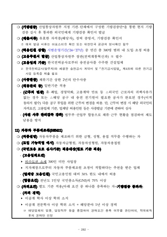 - 282 -%u274d(%uae30%ub7c9%uac80%uc99d)%uc0b0%uc5c5%ud1b5%uc0c1%uc790%uc6d0%ubd80 %uc9c0%uc815 %uae30%uad00%u2027%ub2e8%uccb4%uc5d0%uc11c %uad6c%uc131%ud55c %uae30%ub7c9%uac80%uc99d%ub2e8*%uc744 %ud1b5%ud55c %ud604%uc9c0 %uae30%ub7c9%uac80%uc99d %uc2e4%uc2dc %ud6c4 %ud1b5%uacfc%ud55c %uc678%uad6d%uc778%uc5d0%uac8c %uae30%ub7c9%uac80%uc99d %ud655%uc778%uc11c %ubc1c%uae09 %u274d(%uc81c%ucd9c%uc11c%ub958)%uc720%ud6a8%ud55c %uc790%uaca9%uc99d(%ud574%ub2f9%uc790),%uacbd%ub825 %uc99d%uba85%uc11c,%uae30%ub7c9%uac80%uc99d %ud655%uc778%uc11c%u203b%ud574%uc678%ubc1c%uae09%uc11c%ub958%ub294%uc544%ud3ec%uc2a4%ud2f0%uc720%ud655%uc778%ub610%ub294%ub300%ud55c%ubbfc%uad6d%uacf5%uad00%uc758%uc601%uc0ac%ud655%uc778%ud544%uc218%u274d(%ud5c8%uc6a9%uc778%uc6d0 %uc0c1%ud55c)%uc2dc%ubc94%uc6b4%uc601%uae30%uac04(%u201924~%u201927%ub144)%uc911 %uc5f0%uac04 %ucd1d 300%uba85 %ubc94%uc704 %ub0b4 %ub3c4%uc785%u2027%ucd08%uccad %ud5c8%uc6a9 %u274d(%uace0%uc6a9%ucd94%ucc9c%uc11c %ubc1c%uae09)%uc0b0%uc5c5%ud1b5%uc0c1%uc790%uc6d0%ubd80 %uc7a5%uad00(%uc804%ub825%uacc4%ud1b5%ud601%uc2e0%uacfc)%u203b%ud544%uc218%u274d(%uace0%uc6a9%uc5c5%uccb4 %uae30%uc900)%ud55c%uad6d%uc804%ub825%uacf5%uc0ac%ub85c%ubd80%ud130 %uc1a1%uc804%uacf5%uc0ac%ub97c %uc218%uc8fc%ud55c %uac74%uc124%uc5c5%uccb4 %u203b%ud55c%uad6d%uc804%ub825%uacf5%uc0ac(%ubc1c%uc8fc%uc790)%uc640%uccb4%uacb0%ud55c%uc1a1%uc804%uacf5%uc0ac%uacc4%uc57d%uc11c%ubc0f%uff62%uc804%uae30%uacf5%uc0ac%uc5c5%ubc95%uff63%uc81c4%uc870%uc5d0%ub530%ub978%uc804%uae30%uacf5%uc0ac%uc5c5%ub4f1%ub85d%uc99d%uc81c%ucd9c%ud544%uc694%u274d(%uc0ac%uc99d%ubc1c%uae09)%uccb4%ub958%uae30%uac04 %uc0c1%ud55c 2%ub144%uc758 %ub2e8%uc218%uc0ac%uc99d%u274d(%uccb4%ub958%uad00%ub9ac %ub4f1)%uc77c%ubc18%uae30%uc900 %uc801%uc6a9-(%uadfc%ubb34%ucc98 %ubcc0%uacbd)%ud734%u2027%ud3d0%uc5c5,%uacbd%uc601%uc545%ud654,%uace0%uc6a9%uacc4%uc57d %ub9cc%ub8cc %ub4f1 %u25b3%uc678%uad6d%uc778 %uadfc%ub85c%uc790%uc758 %uadc0%ucc45%uc0ac%uc720%uac00 %uc5c6%ub294 %uacbd%uc6b0 %ub610%ub294 %u25b3%ud574%ub2f9 %uacf5%uad6c %ub0b4 %uc1a1%uc804 %uc804%uae30%uc6d0%uc774 %ud544%uc694%ud55c %uacf5%uc0ac%uac00 %uc644%ub8cc%ub41c %uacbd%uc6b0(%uc774%uc801%ub3d9%uc758%uc11c %ud544%uc218)%ub2e4%uc74c %uacf5%uad6c %ud22c%uc785%uc744 %uc704%ud55c %uadfc%ubb34%ucc98 %ubcc0%uacbd%uc744 %ud5c8%uc6a9.%ub2e8,%uadfc%ubb34%ucc98 %ubcc0%uacbd %uc2dc %ud574%ub2f9 %uc678%uad6d%uc778%uc758 %uc790%uaca9%uc694%uac74,%uace0%uc6a9%uc5c5%uccb4 %uae30%uc900,%uc5c5%uccb4%ub2f9 %ud5c8%uc6a9%uc778%uc6d0 %ub4f1%uc740 %uc0ac%uc99d%ubc1c%uae09 %uae30%uc900%uc5d0 %uc900%ud558%uc5ec %uc2ec%uc0ac-(%uc0ac%uc804%u2027%uc0ac%ud6c4 %uad00%ub9ac%uac10%ub3c5 %uac15%ud654)%ubc95%ubb34%ubd80%u2027%uc0b0%uc5c5%ubd80 %ud569%ub3d9%uc73c%ub85c %uccb4%ub958%u2027%uadfc%ubb34 %ud604%ud669%uc744 %uc810%uac80%ud558%uc5ec %uc81c%ub3c4%ub0a8%uc6a9%uc744 %ubc29%uc9c011)%uc790%ub3d9%ucc28 %ubd80%ud488%uc81c%uc870%uc6d0(S85411)%u274d(%uc9c1%uc885%uc124%uba85)%uc790%ub3d9%ucc28%ubd80%ud488%uc744 %uc81c%uc870%ud558%uae30 %uc704%ud55c %uae08%ud615,%uc131%ud615,%uc6a9%uc811 %uc9c1%ubb34%ub97c %uc218%ud589%ud558%ub294 %uc790 %u274d (%ub3c4%uc785 %uac00%ub2a5%uc9c1%uc5c5 %uc608%uc2dc)%uc790%ub3d9%ucc28%uae08%ud615%uc6d0,%uc790%ub3d9%ucc28%uc131%ud615%uc6d0,%uc790%ub3d9%ucc28%uc6a9%uc811%uc6d0 %u274d (%uad6d%ubbfc%uace0%uc6a9 %ubcf4%ud638 %uc2ec%uc0ac%uae30%uc900)%uc801%uc6a9%ub300%uc0c1(%ubcc4%ub3c4 %uae30%uc900 %uc801%uc6a9)-(%uace0%uc6a9%uc5c5%uccb4%uc694%uac74)%u2023%ube44%uc218%ub3c4%uad8c %uc18c%uc7ac300%uc778 %ubbf8%ub9cc %uc0ac%uc5c5%uc7a5 %u2023%uc9c0%uc790%uccb4%uc7a5%uc73c%ub85c%ubd80%ud130 %uc790%ub3d9%ucc28 %ubd80%ud488%uc81c%uc870%uc6d0 %ucd08%uccad%uc774 %uc801%ud569%ud558%ub2e4%ub294 %ucd94%ucc9c%uc744 %ubc1b%uc740 %uc5c5%uccb4-(%uc5c5%uccb4%ub2f9 %uace0%uc6a9%uc778%uc6d0)%uad6d%ubbfc%uace0%uc6a9%uc778%uc6d0 %ub300%ube44 30%%ud55c%ub3c4 %ub0b4%uc5d0%uc11c %ud5c8%uc6a9-(%uc784%uae08%uc694%uac74)%uc804%ub144%ub3c4 1%uc778%ub2f9 %uad6d%ubbfc%ucd1d%uc18c%ub4dd(GNI)%uc758 70%%uc774%uc0c1%u274d(%uc790%uaca9%uc694%uac74)%ubcc4%ub3c4 %uae30%uc900 %uc801%uc6a9(%uc544%ub798 %uc694%uac74 %uc911 %ud558%ub098%ub97c %ucda9%uc871%ud558%ub294 %uc790+%uae30%ub7c9%uac80%uc99d %ud1b5%uacfc%uc790)-(%uc790%uaca9%u2027%uacbd%ub825)%u2023%uc774%uacf5%uacc4 %ud559%uc0ac %uc774%uc0c1 %ud559%uc704 %uc18c%uc9c0%u2023%uc774%uacf5%uacc4 %uc804%ubb38%ud559%uc0ac %uc774%uc0c1 %ud559%uc704 %uc18c%uc9c0 +%ud574%ub2f9%ubd84%uc57c 1%ub144 %uc774%uc0c1 %uacbd%ub825%u203b%ud574%ub2f9%uc5c5%uccb4%uc758%uc5c5%uc885,%ub2f4%ub2f9%uc9c1%ubb34%ub4f1%uc744%uc885%ud569%ud558%uc5ec%uacbd%ub825%uc694%uac74%ucda9%uc871%uc5ec%ubd80%ub97c%ud310%ub2e8%ud558%ub418,%ud559%uc704%ucde8%ub4dd%ud6c4%uc758%uacbd%ub825%ub9cc%uc778%uc815