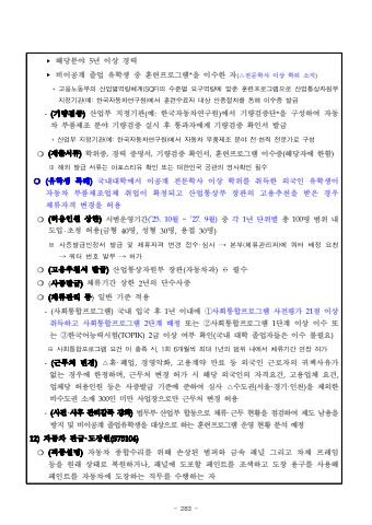- 283 -%u2023%ud574%ub2f9%ubd84%uc57c 5%ub144 %uc774%uc0c1 %uacbd%ub825%u2023%ube44%uc774%uacf5%uacc4 %uc878%uc5c5 %uc720%ud559%uc0dd %uc911 %ud6c8%ub828%ud504%ub85c%uadf8%ub7a8*%uc744 %uc774%uc218%ud55c %uc790(%u25b3%uc804%ubb38%ud559%uc0ac %uc774%uc0c1 %ud559%uc704 %uc18c%uc9c0)*%uace0%uc6a9%ub178%ub3d9%ubd80%uc758%uc0b0%uc5c5%ubcc4%uc5ed%ub7c9%uccb4%uacc4(SQF)%uc758%uc218%uc900%ubcc4%uc694%uad6c%uc5ed%ub7c9%uc5d0%ub9de%ucd98%ud6c8%ub828%ud504%ub85c%uadf8%ub7a8%uc73c%ub85c%uc0b0%uc5c5%ud1b5%uc0c1%uc790%uc6d0%ubd80%uc9c0%uc815%uae30%uad00(%uc608:%ud55c%uad6d%uc790%ub3d9%ucc28%uc5f0%uad6c%uc6d0)%uc5d0%uc11c%ud6c8%ub828%uc218%ub8cc%uc790%ub300%uc0c1%uc778%uc99d%uc808%ucc28%ub97c%ud1b5%ud574%uc774%uc218%uc99d%ubc1c%uae09-(%uae30%ub7c9%uac80%uc99d)%uc0b0%uc5c5%ubd80 %uc9c0%uc815%uae30%uad00(%uc608:%ud55c%uad6d%uc790%ub3d9%ucc28%uc5f0%uad6c%uc6d0)%uc5d0%uc11c %uae30%ub7c9%uac80%uc99d%ub2e8*%uc744 %uad6c%uc131%ud558%uc5ec %uc790%ub3d9%ucc28 %ubd80%ud488%uc81c%uc870 %ubd84%uc57c %uae30%ub7c9%uac80%uc99d %uc2e4%uc2dc %ud6c4 %ud1b5%uacfc%uc790%uc5d0%uac8c %uae30%ub7c9%uac80%uc99d %ud655%uc778%uc11c %ubc1c%uae09*%uc0b0%uc5c5%ubd80%uc9c0%uc815%uae30%uad00(%uc608:%ud55c%uad6d%uc790%ub3d9%ucc28%uc5f0%uad6c%uc6d0)%uc5d0%uc11c%uc790%ub3d9%ucc28%ubd80%ud488%uc81c%uc870%ubd84%uc57c%uc804%u00b7%ud604%uc9c1%uc804%ubb38%uac00%ub85c%uad6c%uc131%u274d(%uc81c%ucd9c%uc11c%ub958)%ud559%uc704%uc99d,%uacbd%ub825 %uc99d%uba85%uc11c,%uae30%ub7c9%uac80%uc99d %ud655%uc778%uc11c,%ud6c8%ub828%ud504%ub85c%uadf8%ub7a8 %uc774%uc218%uc99d(%ud574%ub2f9%uc790%uc5d0 %ud55c%ud568)%u203b%ud574%uc678%ubc1c%uae09%uc11c%ub958%ub294%uc544%ud3ec%uc2a4%ud2f0%uc720%ud655%uc778%ub610%ub294%ub300%ud55c%ubbfc%uad6d%uacf5%uad00%uc758%uc601%uc0ac%ud655%uc778%ud544%uc218%u274d (%uc720%ud559%uc0dd %ud2b9%ub840)%uad6d%ub0b4%ub300%ud559%uc5d0%uc11c %uc774%uacf5%uacc4 %uc804%ubb38%ud559%uc0ac %uc774%uc0c1 %ud559%uc704%ub97c %ucde8%ub4dd%ud55c %uc678%uad6d%uc778 %uc720%ud559%uc0dd%uc774 %uc790%ub3d9%ucc28 %ubd80%ud488%uc81c%uc870%uc5c5%uccb4 %ucde8%uc5c5%uc774 %ud655%uc815%ub418%uace0 %uc0b0%uc5c5%ud1b5%uc0c1%ubd80 %uc7a5%uad00%uc758 %uace0%uc6a9%ucd94%ucc9c%uc744 %ubc1b%uc740 %uacbd%uc6b0 %uccb4%ub958%uc790%uaca9%ubcc0%uacbd%uc744 %ud5c8%uc6a9%u274d(%ud5c8%uc6a9%uc778%uc6d0 %uc0c1%ud55c)%uc2dc%ubc94%uc6b4%uc601%uae30%uac04(%u201925.10%uc6d4 ~%u201927.9%uc6d4)%uc911 %uac01 1%ub144 %ub2e8%uc704%ubcc4%ucd1d 100%uba85 %ubc94%uc704 %ub0b4%ub3c4%uc785%u2027%ucd08%uccad %ud5c8%uc6a9(%uae08%ud615 40%uba85,%uc131%ud615 30%uba85,%uc6a9%uc811 30%uba85)%u203b%uc0ac%uc99d%ubc1c%uae09%uc778%uc815%uc11c%ubc1c%uae09%ubc0f%uccb4%ub958%uc790%uaca9%ubcc0%uacbd%uc811%uc218%u2027%uc2ec%uc0ac%u2192%ubcf8%ubd80(%uccb4%ub958%uad00%ub9ac%uacfc)%uc5d0%ucffc%ud130%ubc30%uc815%uc694%uccad%u2192%ucffc%ud130%ubc88%ud638%ubc1c%ubd80%u2192%ud5c8%uac00%u274d%uace0%uc6a9%ucd94%ucc9c%uc11c %ubc1c%uae09%uc0b0%uc5c5%ud1b5%uc0c1%uc790%uc6d0%ubd80 %uc7a5%uad00%uc790%ub3d9%ucc28%uacfc%ud544%uc218%u274d(%uc0ac%uc99d%ubc1c%uae09)%uccb4%ub958%uae30%uac04 %uc0c1%ud55c 2%ub144%uc758 %ub2e8%uc218%uc0ac%uc99d%u274d(%uccb4%ub958%uad00%ub9ac %ub4f1)%uc77c%ubc18 %uae30%uc900 %uc801%uc6a9-(%uc0ac%ud68c%ud1b5%ud569%ud504%ub85c%uadf8%ub7a8)%uad6d%ub0b4 %uc785%uad6d %ud6c4 1%ub144 %uc774%ub0b4%uc5d0 %u2460%uc0ac%ud68c%ud1b5%ud569%ud504%ub85c%uadf8%ub7a8 %uc0ac%uc804%ud3c9%uac00 21%uc810 %uc774%uc0c1 %ucde8%ub4dd%ud558%uace0 %uc0ac%ud68c%ud1b5%ud569%ud504%ub85c%uadf8%ub7a8 2%ub2e8%uacc4 %ubc30%uc815%ub610%ub294 %u2461%uc0ac%ud68c%ud1b5%ud569%ud504%ub85c%uadf8%ub7a8 1%ub2e8%uacc4 %uc774%uc0c1 %uc774%uc218 %ub610%ub294 %u2462%ud55c%uad6d%uc5b4%ub2a5%ub825%uc2dc%ud5d8(TOPIK)2%uae09 %uc774%uc0c1 %uc5ec%ubd80 %ud655%uc778(%uad6d%ub0b4 %ub300%ud559 %uc878%uc5c5%uc790%ub4e4%uc740 %uc774%uc218 %ubd88%ud544%uc694)%u203b%uc0ac%ud68c%ud1b5%ud569%ud504%ub85c%uadf8%ub7a8%uc694%uac74%ubbf8%ucda9%uc871%uc2dc,1%ud68c6%uac1c%uc6d4%uc529%ucd5c%ub3001%ub144%uc758%ubc94%uc704%ub0b4%uc5d0%uc11c%uccb4%ub958%uae30%uac04%uc5f0%uc7a5%ud5c8%uac00-(%uadfc%ubb34%ucc98 %ubcc0%uacbd)%u25b3%ud734%u2027%ud3d0%uc5c5,%uacbd%uc601%uc545%ud654,%uace0%uc6a9%uacc4%uc57d %ub9cc%ub8cc %ub4f1 %uc678%uad6d%uc778 %uadfc%ub85c%uc790%uc758 %uadc0%ucc45%uc0ac%uc720%uac00 %uc5c6%ub294 %uacbd%uc6b0%uc5d0 %ud55c%uc815%ud558%uba70,%uadfc%ubb34%ucc98 %ubcc0%uacbd %ud5c8%uac00 %uc2dc %ud574%ub2f9 %uc678%uad6d%uc778%uc758 %uc790%uaca9%uc694%uac74,%uace0%uc6a9%uc5c5%uccb4 %uc694%uac74,%uc5c5%uccb4%ub2f9 %ud5c8%uc6a9%uc778%uc6d0 %ub4f1%uc740 %uc0ac%uc99d%ubc1c%uae09 %uae30%uc900%uc5d0 %uc900%ud558%uc5ec %uc2ec%uc0ac %u25b3%uc218%ub3c4%uad8c(%uc11c%uc6b8%u00b7%uacbd%uae30%u00b7%uc778%ucc9c)%uc744 %uc81c%uc678%ud55c %ube44%uc218%ub3c4%uad8c %uc18c%uc7ac 300%uc778 %ubbf8%ub9cc %uc0ac%uc5c5%uc7a5%uc73c%ub85c%ub9cc %uadfc%ubb34%ucc98 %ubcc0%uacbd %ud5c8%uc6a9 -(%uc0ac%uc804%u2027%uc0ac%ud6c4 %uad00%ub9ac%uac10%ub3c5 %uac15%ud654)%ubc95%ubb34%ubd80%u2027%uc0b0%uc5c5%ubd80 %ud569%ub3d9%uc73c%ub85c %uccb4%ub958%u2027%uadfc%ubb34 %ud604%ud669%uc744 %uc810%uac80%ud558%uc5ec %uc81c%ub3c4 %ub0a8%uc6a9%uc744 %ubc29%uc9c0 %ubc0f %ube44%uc774%uacf5%uacc4 %uc878%uc5c5%uc720%ud559%uc0dd%uc744 %ub300%uc0c1%uc73c%ub85c %ud558%ub294 %ud6c8%ub828%ud504%ub85c%uadf8%ub7a8 %uc6b4%uc601 %ud604%ud669 %ubd84%uc11d %uc608%uc81512)%uc790%ub3d9%ucc28 %ud310%uae08%u00b7%ub3c4%uc7a5%uc6d0(S75104)%u274d(%uc9c1%uc885%uc124%uba85)%uc790%ub3d9%ucc28 %uc885%ud569%uc218%ub9ac%ub97c %uc704%ud574 %uc190%uc0c1%ub41c %ubc94%ud37c%uc640 %uae08%uc18d %ud328%ub110 %uadf8%ub9ac%uace0 %ucc28%uccb4 %ud504%ub808%uc784 %ub4f1%uc744 %uc6d0%ub798 %uc0c1%ud0dc%ub85c %ubcf5%uc6d0%ud558%uac70%ub098,%ud328%ub110%uc5d0 %ub3c4%ud3ec%ud560 %ud398%uc778%ud2b8%ub97c %uc870%uc0c9%ud558%uace0 %ub3c4%uc7a5 %uc6a9%uad6c%ub97c %uc0ac%uc6a9%ud574%ud398%uc778%ud2b8%ub97c %uc790%ub3d9%ucc28%uc5d0 %ub3c4%uc7a5%ud558%ub294 %uc9c1%ubb34%ub97c %uc218%ud589%ud558%ub294 %uc790