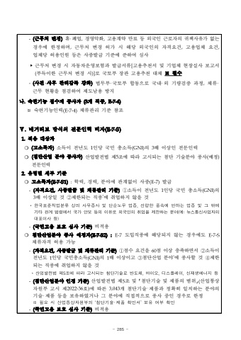 - 285 --(%uadfc%ubb34%ucc98 %ubcc0%uacbd)%ud734%u2027%ud3d0%uc5c5,%uacbd%uc601%uc545%ud654,%uace0%uc6a9%uacc4%uc57d %ub9cc%ub8cc %ub4f1 %uc678%uad6d%uc778 %uadfc%ub85c%uc790%uc758 %uadc0%ucc45%uc0ac%uc720%uac00 %uc5c6%ub294%uacbd%uc6b0%uc5d0 %ud55c%uc815%ud558%uba70,%uadfc%ubb34%ucc98 %ubcc0%uacbd %ud5c8%uac00 %uc2dc %ud574%ub2f9 %uc678%uad6d%uc778%uc758 %uc790%uaca9%uc694%uac74,%uace0%uc6a9%uc5c5%uccb4 %uc694%uac74,%uc5c5%uccb4%ub2f9%ud5c8%uc6a9%uc778%uc6d0 %ub4f1%uc740 %uc0ac%uc99d%ubc1c%uae09 %uae30%uc900%uc5d0 %uc900%ud558%uc5ec %uc2ec%uc0ac%u2023%uadfc%ubb34%ucc98 %ubcc0%uacbd %uc2dc %uc790%ub3d9%ucc28%uc6b4%uc601%ubcf4%ud5d8%uacfc %ubc1c%uae09%uc11c%ub958[%uace0%uc6a9%ucd94%ucc9c%uc11c %ubc0f %uae30%uc5c5%uccb4 %ud604%uc7a5%uc2e4%uc0ac %ubcf4%uace0%uc11c(%ubd80%ub4dd%uc774%ud55c %uadfc%ubb34%ucc98 %ubcc0%uacbd %uc2dc)]%ub85c %uad6d%ud1a0%ubd80 %uc7a5%uad00 %uace0%uc6a9%ucd94%ucc9c %ub300%uccb4 %u203b%ud544%uc218-(%uc0ac%uc804%u2027%uc0ac%ud6c4 %uad00%ub9ac%uac10%ub3c5 %uac15%ud654)%ubc95%ubb34%ubd80%u2027%uad6d%ud1a0%ubd80 %ud569%ub3d9%uc73c%ub85c %uad6d%ub0b4%u2027%uc678 %uae30%ub7c9%uac80%uc99d %uacfc%uc815,%uccb4%ub958%u2027%uadfc%ubb34 %ud604%ud669%uc744 %uc810%uac80%ud558%uc5ec %uc81c%ub3c4%ub0a8%uc6a9 %ubc29%uc9c0%ub098.%uc219%ub828%uae30%ub2a5 %uc810%uc218%uc81c %uc885%uc0ac%uc790 (3%uac1c %uc9c1%uc885,E-7-4)%u203b%uc219%ub828%uae30%ub2a5%uc778%ub825(E-7-4)%uccb4%ub958%uad00%ub9ac %uae30%uc900 %ucc38%uc870%u2164.%ub124%uac70%ud2f0%ube0c %ubc29%uc2dd%uc758 %uc804%ubb38%uc778%ub825 %ube44%uc790(E-7-S)1.%uc801%uc6a9 %ub300%uc0c1%uc790 %u274d (%uace0%uc18c%ub4dd%uc790)%uc18c%ub4dd%uc774 %uc804%ub144%ub3c4 1%uc778%ub2f9 %uad6d%ubbfc %ucd1d%uc18c%ub4dd(GNI)%uc758 3%ubc30 %uc774%uc0c1%uc778 %uc804%ubb38%uc778%ub825%u274d (%ucca8%ub2e8%uc0b0%uc5c5 %ubd84%uc57c %uc885%uc0ac%uc790)%uc0b0%uc5c5%ubc1c%uc804%ubc95 %uc81c5%uc870%uc5d0 %ub530%ub77c %uace0%uc2dc%ub418%ub294 %ucca8%ub2e8 %uae30%uc220%ubd84%uc57c %uc885%uc0ac(%uc608%uc815)%uc804%ubb38%uc778%ub825 %uc720%ud615%ubcc4 %uc138%ubd80 %uae30%uc900%u274d %uace0%uc18c%ub4dd%uc790(E-7-S1)%ud559%ub825%uacbd%ub825%ubd84%uc57c%uc5d0 %uad00%uacc4%uc5c6%uc774 %uc0ac%uc99d%ubc1c%uae09-(%uc790%uaca9%uc694%uac74,%uc0ac%uc99d%ubc1c%uae09 %ubc0f %uccb4%ub958%uad00%ub9ac %uae30%uc900)%u2460%uc18c%ub4dd%uc774 %uc804%ub144%ub3c4 1%uc778%ub2f9 %uad6d%ubbfc %ucd1d%uc18c%ub4dd(GNI)%uc758 3%ubc30 %uc774%uc0c1%uc77c %uac83%u2461%uc81c%ud55c%ub418%ub294 %uc9c1%uc885*%uc5d0 %ucde8%uc5c5%ud558%uc9c0 %uc54a%uc744 %uac83 *%ud55c%uad6d%ud45c%uc900%uc9c1%uc5c5%ubd84%ub958%uc0c1%uc758%uc0ac%ubb34%uc885%uc0ac%ubc0f%ub2e8%uc21c%ub178%ubb34%uc5c5%uc885,%uc120%ub7c9%ud55c%ud48d%uc18d%uc5d0%ubc18%ud558%ub294%uc5c5%uc885%ubc0f%uadf8%ubc16%uc5d0%uae30%ud0c0%uad00%uacc4%ubc95%ub839%uc5d0%uc11c%uad6d%uac00%uc548%ubcf4%ub4f1%uc758%uc774%uc720%ub85c%uc678%uad6d%uc778%uc758%ucde8%uc5c5%uc744%uc81c%ud55c%ud558%ub294%ubd84%uc57c(%uc608:%ub274%uc2a4%ud1b5%uc2e0%uc0ac%uc5c5%uc790%uc758%ub300%ud45c%uc774%uc0ac%ub4f1)-(%uad6d%ubbfc%uace0%uc6a9 %ubcf4%ud638 %uc2ec%uc0ac %uae30%uc900)%ube44%uc801%uc6a9 %u274d%ucca8%ub2e8%uc0b0%uc5c5%ubd84%uc57c %uc885%uc0ac %uc608%uc815%uc790(E-7-S2):E-7%ub3c4%uc785%uc9c1%uc885%uc5d0 %ud574%ub2f9%ub418%uc9c0 %uc54a%ub294 %uacbd%uc6b0%uc5d0%ub3c4 E-7-S%uccb4%ub958%uc790%uaca9 %ud5c8%uc6a9 %uac00%ub2a5-(%uc790%uaca9%uc694%uac74,%uc0ac%uc99d%ubc1c%uae09 %ubc0f %uccb4%ub958%uad00%ub9ac %uae30%uc900)%u2460%uc810%uc218 %uc694%uac74%uc744 60%uc810 %uc774%uc0c1 %ucda9%uc871%ud558%uba74%uc11c%u2461%uc18c%ub4dd%uc774%uc804%ub144%ub3c4 1%uc778%ub2f9 %uad6d%ubbfc%ucd1d%uc18c%ub4dd(GNI)%uc758 1%ubc30 %uc774%uc0c1%uc774%uace0 %u2462%ucca8%ub2e8%uc0b0%uc5c5 %ubd84%uc57c*%uc5d0 %uc885%uc0ac%ud560 %uac83 %u2463%uc81c%ud55c%ub418%ub294 %uc9c1%uc885%uc5d0 %ucde8%uc5c5%ud558%uc9c0 %uc54a%uc744 %uac83*%uc0b0%uc5c5%ubc1c%uc804%ubc95%uc81c5%uc870%uc5d0%ub530%ub77c%uace0%uc2dc%ub418%ub294%ucca8%ub2e8%uae30%uc220%ub85c%ubc18%ub3c4%uccb4,%ubc14%uc774%uc624,%ub514%uc2a4%ud50c%ub808%uc774,%uc2e0%uc7ac%uc0dd%uc5d0%ub108%uc9c0%ub4f1-(%ucca8%ub2e8%uc0b0%uc5c5%ubd84%uc57c %uc778%uc815 %uae30%uc900)%uc0b0%uc5c5%ubc1c%uc804%ubc95 %uc81c5%uc870 %ubc0f %uff62%ucca8%ub2e8%uae30%uc220 %ubc0f %uc81c%ud488%uc758 %ubc94%uc704%uff63(%uc0b0%uc5c5%ud1b5%uc0c1%uc790%uc6d0%ubd80 %uace0%uc2dc %uc81c2022-36%ud638)%uc5d0 %ub530%ub978 3,043%uac1c %ucca8%ub2e8%uae30%uc220%u2027%uc81c%ud488%uacfc %uc815%ud655%ud788 %uc77c%uce58%ud558%ub294 %ubd84%uc57c%uc758 %uae30%uc220%u2027%uc81c%ud488 %ub4f1%uc744 %ubcf4%uc720%ud558%uc600%uac70%ub098 %uadf8 %ubd84%uc57c%uc5d0 %uc9c1%uc811%uc801%uc73c%ub85c %uc885%uc0ac %uc911%uc778 %uacbd%uc6b0%ub85c %ud55c%uc815 %u203b%ud544%uc694%uc2dc%uc0b0%uc5c5%ud1b5%uc0c1%uc790%uc6d0%ubd80%uc758%u2018%ucca8%ub2e8%uae30%uc220%u2027%uc81c%ud488%ud655%uc778%uc11c%u2019%ubcf4%uc720%uc5ec%ubd80%ud655%uc778-(%uad6d%ubbfc%uace0%uc6a9 %ubcf4%ud638 %uc2ec%uc0ac %uae30%uc900)%ube44%uc801%uc6a9