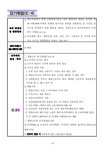 - 29 -%ub2e8%uae30%ucde8%uc5c5(C-4)%uc790%uaca9%ud574%ub2f9%uc790%ubc0f%ud65c%ub3d9%ubc94%uc704%ubc95%ubb34%ubd80%uc7a5%uad00%uc774 %uad00%uacc4 %uc911%uc559%ud589%uc815%uae30%uad00%uc758 %uc7a5%uacfc %ud611%uc758%ud558%uc5ec %uc815%ud558%ub294 %ub18d%uc791%ubb3c %uc7ac%ubc30%u00b7%uc218%ud655(%uc7ac%ubc30%u00b7%uc218%ud655%uacfc %uc5f0%uacc4%ub41c %uc6d0%uc2dc%uac00%uacf5 %ubd84%uc57c%ub97c %ud3ec%ud568%ud55c%ub2e4)%ubc0f %uc218%uc0b0%ubb3c %uc6d0%uc2dc%uac00%uacf5 %ubd84%uc57c%uc5d0%uc11c %ucde8%uc5c5 %ud65c%ub3d9%uc744 %ud558%ub824%ub294 %uc0ac%ub78c%uc73c%ub85c%uc11c %ubc95%ubb34%ubd80%uc7a5%uad00%uc774 %uc778%uc815%ud558%ub294 %uc0ac%ub78c(C-4-1~4)%uc77c%uc2dc%ud765%ud589,%uad11%uace0%u2024%ud328%uc158%ubaa8%ub378,%uac15%uc758%u2024%uac15%uc5f0,%uc5f0%uad6c,%uae30%uc220%uc9c0%ub3c4 %ub4f1 %uc218%uc775%uc744 %ubaa9%uc801%uc73c%ub85c %ub2e8%uae30%uac04 %ucde8%uc5c5%ud65c%ub3d9%uc744 %ud558%ub824%ub294 %uc790(C-4-5)1%ud68c%uc5d0%ubd80%uc5ec%ud560%uc218%uc788%ub294%uccb4%ub958%uae30%uac04%uc0c1%ud55c90%uc77c%uadfc%ubb34%ucc98%uc758%ubcc0%uacbd%u2024%ucd94%uac00%uf000%ubaa9%ucc28%u25a1%uacc4%uc808%uadfc%ub85c %ub2e8%uae30%ucde8%uc5c5(C-4-1~4)%uadfc%ubb34%ucc98%uc758 %ucd94%uac00%ub294 %ubd88%uac00%uadfc%ubb34%ucc98 %ubcc0%uacbd%uc2dc %uc9c0%uc790%uccb4 %ub2f4%ub2f9%uc790 %ub3d9%ubc18 %ud544%uc694%uadfc%ubb34%ucc98 %ubcc0%uacbd %uc0ac%uc720%u2460%uac01%uc885 %uc870%uac74 %uc704%ubc18 %uace0%uc6a9%uc8fc%uac00 %uc2dc%uc815%uc744 %ud558%uc9c0 %uc54a%uc740 %uacbd%uc6b0%u2461%uacc4%uc808%uadfc%ub85c%uc790%uc758 %uadc0%ucc45%uc0ac%uc720 %uc5c6%uc774 %uadfc%ub85c%ub97c %uacc4%uc18d%ud560 %uc218 %uc5c6%ub294 %uacbd%uc6b0%u2462%uc0ac%ud68c%ud1b5%ub150%uc0c1 %uc678%uad6d%uc778 %uacc4%uc808%uadfc%ub85c%uc790%uac00 %ucd5c%ucd08 %uacc4%uc57d%ud55c %uace0%uc6a9%uc8fc%uc758 %uc791%uc5c5%uc7a5%uc5d0%uc11c %uadfc%ubb34%ub97c %ud560 %uc218 %uc5c6%ub294 %uacbd%uc6b0 %ub4f1%uc81c%ucd9c%uc11c%ub958%u2460%ud1b5%ud569%uc2e0%uccad%uc11c,%uc5ec%uad8c %u203b%uadfc%ubb34%ucc98%ubcc0%uacbd%uc218%uc218%ub8cc%uba74%uc81c%u2461%uac70%uc8fc/%uc219%uc18c %uc81c%uacf5 %ud655%uc778%uc11c%u2462%ud45c%uc900%uadfc%ub85c%uacc4%uc57d%uc11c %uc0ac%ubcf8 %u2463%uc0b0%uc5c5%uc7ac%ud574%ubcf4%ud5d8%uac00%uc785 %uc99d%uba85%uc6d0 %ub610%ub294 %ub18d%u00b7%uc5b4%uc5c5%uc778 %uc548%uc804%ubcf4%ud5d8 %uc99d%uc11c%u203b %uc0c8%ub85c %ubcc0%uacbd%ub41c %uace0%uc6a9%uc8fc%ub85c %ubcc0%uacbd, %uc2e0%uccad %uc785%uc99d%uc11c%ub958 %uc81c%ucd9c %uac00%ub2a5%u2464%uac74%uac15%ubcf4%ud5d8 %uac00%uc785%uc99d%uba85%uc6d0 %ub610%ub294 %uc2e0%uccad %uc785%uc99d%uc11c%ub958(%ud574%ub2f9%uc790%ub9cc %uc81c%ucd9c)%u2465%uacc4%uc808%uadfc%ub85c%uc790 %ubc30%uce58 %ub300%uc0c1 %uace0%uc6a9%uc8fc %ud655%uc778%uc11c(%uc9c0%uc790%uccb4%uc5d0%uc11c %uc0c8 %uace0%uc6a9%uc8fc%uc5d0%uac8c %ubc1c%uae09)%u203b %uc804 %uace0%uc6a9%uc8fc%ub294 %ucd9c%uc785%uad6d%uad00%uc11c %ubc0f %uc9c0%uc790%uccb4%uc5d0 %uace0%uc6a9%ubcc0%ub3d9%uc2e0%uace0%uc11c %uc81c%ucd9c%u25a1%uacc4%uc808%uadfc%ub85c%uc678 %ub2e8%uae30%ucde8%uc5c5(C-4-5)%ub2e8%uae30%ucde8%uc5c5(C-4)%uc18c%uc9c0%uc790%uc758 %uadfc%ubb34%ucc98%ubcc0%uacbd%u2024%ucd94%uac00%ud5c8%uac00 %uad8c%ud55c%uc744 %uccad(%uc0ac%ubb34%uc18c%u00b7%ucd9c%uc7a5%uc18c)%uc7a5%uc5d0%uac8c %uc704%uc784%uadfc%ubb34%ucc98 %ubcc0%uacbd %uc2dc %uc8fc%ubb34%ubd80%ucc98 %uc7a5%uc758 %uace0%uc6a9%ucd94%ucc9c%uc11c %ubd88%ud544%uc694