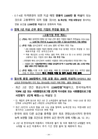 - 291 -- E-7-4%ub85c %uc790%uaca9%ubcc0%uacbd%uc774 %ub418%uba74 %uc9c0%uae09 %uc608%uc815 %uc5f0%ubd09%uc774 2,600%ub9cc %uc6d0 %uc774%uc0c1%uc774%ub418%ub294 %uac83%uc73c%ub85c %uace0%uc6a9%uacc4%uc57d%uc774 %ub418%uc5b4 %uc788%uc744 %uac83(%ub2e4%ub9cc, %ub18d%u2024%ucd95%uc0b0%uc5c5, %uc5b4%uc5c5%u2024%ub0b4%ud56d%uc0c1%uc120%uc885%uc0ac%uc790%ub294%uc5f0%ubd09 %uc694%uac74%uc744 2,500%ub9cc%uc6d0 %uc774%uc0c1%uc73c%ub85c %uc644%ud654%ud558%uc5ec %uc801%uc6a9)%u2462 %ud604%uc7ac 1%ub144 %uc774%uc0c1 %uadfc%ubb34 %uc911%uc778 %uae30%uc5c5%uc758 %ucd94%ucc9c%uc744 %ubc1b%uc740 %uc790<%uace0%uc6a9%uae30%uc5c5 %ucd94%ucc9c %uc81c%ub3c4>%u25cb (%uac1c%uc694) %ud574%ub2f9 %uc678%uad6d%uc778%uc774 %ud604%uc7ac 1%ub144 %uc774%uc0c1 %uadfc%ubb34 %uc911%uc778 %uae30%uc5c5%uc758 %ub300%ud45c%uac00 %ucd94%ucc9c(%ubd99%uc7845 %ucd94%ucc9c%uc11c %ubc1c%uae09)%u2192 %u201c%uace0%uc6a9%uae30%uc5c5 %ucd94%ucc9c%u201d%uc740 K-point E74 %uc804%ud658 %uc2dc %ud544%uc218%uc694%uac74%uc774%uba74%uc11c %uac00%uc810 %ud56d%ubaa9%uc784%u25cb (%ucd94%ucc9c %uae30%uc900) %uc0c1%uc2dc%uadfc%ub85c%uc790*%uc218%uc758 20% %ubc94%uc704 %ub0b4**%uc5d0%uc11c %ucd94%ucc9c %uac00%ub2a5* 4%ub300 %uc0ac%ud68c%ubcf4%ud5d8 %uc0ac%uc5c5%uc7a5 %uac00%uc785%uc790 %uba85%ubd80%uc5d03%uac1c%uc6d4 %uc774%uc0c1 %ub4f1%uc7ac%ub41c %uad6d%ubbfc%uacfc%ucde8%uc5c5%ud560 %uc218 %uc788%ub294%uccb4%ub958%uc790%uaca9%uc744 %uac00%uc9c4 %uc678%uad6d%uc778%uadfc%ub85c%uc790** %ud5c8%uc6a9 %uacc4%uc0b0%uac12%uc758 %uc18c%uc218%uc810 %uc774%ud558%ub294 %uc62c%ub9bc %ud558%uba70, %ud604%uc7ac E-9 %ubc0f E-10 %uc678%uad6d%uc778 %uadfc%ub85c%uc790%ub97c %uace0%uc6a9%ud558%uace0 %uc788%ub294 %uae30%uc5c5%uc758%uacbd%uc6b0 %ucd5c%uc18c 1%uba85 %ucd94%ucc9c %uac00%ub2a5- (%ucd94%ucc9c%ubc94%uc704 %uc608%uc2dc) %uc0c1%uc2dc%uadfc%ub85c%uc790 100%uba85%uc778 %uc0ac%uc5c5%uc7a5%uc740 %ucd5c%ub300 20%uac1c(20%uba85)%uc758 %ucd94%ucc9c%uad8c %ud589%uc0ac %uac00%ub2a5%u261e %uac74%uc124%uc5c5%uc758 %uacbd%uc6b0 %u201c%uc2dc%uacf5%ub2a5%ub825%ud3c9%uac00%uc561%uc774%ub098 %uc5f0%ud3c9%uade0 %uacf5%uc0ac%uae08%uc561 %uc911 %ud0dd 1%u201d%u27150.4(1%uc5b5%ub2f9 0.4%uba85 %uace0%uc6a9, %uc18c%uc218%uc810 %uc774%ud558%ub294 %uc62c%ub9bc)%u2019 %ub0b4%uc5d0%uc11c %ucd94%ucc9c %ud5c8%uc6a9%uc778%uc6d0 %uc0b0%uc815%u25cb (%ucd94%ucc9c %uc81c%ud55c) %uc2dc%ud589 %uc774%ud6c4 %uc784%uae08 %uccb4%ubd88, %ud3ed%ud589 %ub4f1 %uc778%uad8c%uce68%ud574 %ubc1c%uc0dd %ub610%ub294 %uc678%uad6d%uc778 %ubd88%ubc95 %uace0%uc6a9 %uc2dc%ud574%ub2f9 %uae30%uc5c5%uc740 %uc989%uc2dc %ucd94%ucc9c%uad8c %ubc15%ud0c8 %ubc0f %ud5a5%ud6c4 5%ub144%uac04 %ucd94%ucc9c %ubd88%ud5c8%u2463 %uc810%uc218%uc81c %ucd1d%uc810 300%uc810%uc5d0%uc11c %uac00%uc810 %ud3ec%ud568 %ucd5c%uc18c 200%uc810 %uc774%uc0c1%uc790[%uae30%ubcf8%ud56d%ubaa9%uc758%ud3c9%uade0%uc18c%ub4dd%uacfc%ud55c%uad6d%uc5b4%ub2a5%ub825%uc774 %uac01%uac01 %ucd5c%uc18c %uc810%uc218(50%uc810) %uc774%uc0c1%uc778 %uc790%uc5d0 %ud55c%ud568] : %ubd99%uc7841 %uc810%uc218%ud45c %ucc38%uace0- %ucd5c%uadfc 2%ub144 %uc5f0%uac04 %ud3c9%uade0%uc18c%ub4dd*%uc774 2,500%ub9cc%uc6d0**%uc774%uc0c1%uc774%uace0, %ud55c%uad6d%uc5b4%ub2a5%ub825%uc774TOPIK 2%uae09 %ub610%ub294 %uc0ac%ud68c%ud1b5%ud569%ud504%ub85c%uadf8%ub7a8 2%ub2e8%uacc4 %uc774%uc218%uc644%ub8cc%ub610%ub294%uc0ac%ud68c%ud1b5%ud569%ud504%ub85c%uadf8%ub7a8 %uc0ac%uc804%ud3c9%uac003%ub2e8%uacc4 %ubc30%uc815(41%uc810)%uc774%uc0c1%uc77c %uac83*%ub2e8, %uc7ac%uc785%uad6d %uacf5%ubc31 %ub4f1%uc73c%ub85c %ucd5c%uadfc 2%ub144 %uac04 %uc18c%ub4dd%uc785%uc99d%uc774 %ubd88%uac00%ub2a5%ud55c %uacbd%uc6b0, %u201819%ub144~%u201923%ub144 %uc911%uc5f0%uac04 %ub2e8%uc704%ub85c %uc18c%ub4dd%uae08%uc561%uc774 %ub192%uc740 2%uac1c%ub144%uc758 %uc18c%ub4dd%uae08%uc561%uc73c%ub85c %ub300%uccb4 %uac00%ub2a5** %ucd5c%uadfc 2%ub144%uac04%uc758 %uc18c%ub4dd%uc758 %ud569%uc744 2%ub85c %ub098%ub208 %uac12%uc744 %ub9d0%ud558%uba70, %ub18d%u2024%ucd95%uc0b0%uc5c5 %ub610%ub294 %uc5b4%uc5c5%u2024%ub0b4%ud56d%uc0c1%uc120 %uc885%uc0ac%uc790%ub294 2,400%ub9cc%uc6d0 %uc774%uc0c1%uc73c%ub85c %uc644%ud654 %uc801%uc6a9- %ud55c%uad6d%uc5b4 %uc678%uc758 %ub2e4%ub978 %uc694%uac74%uc744 %ucda9%uc871%ud560 %uacbd%uc6b0 %ucd5c%ucd08 %uc5f0%uc7a5(2%ub144)%uc2dc%uae4c%uc9c0 %ud55c%uad6d%uc5b4%ub2a5%ub825 %ubcf4%uc644%ud560 %uac83%uc744 %uc870%uac74%uc73c%ub85c %ud55c%uad6d%uc5b4 %uc694%uac74 %ud55c%uc2dc%uc801 %uc720%uc608 %uc2dc%ud589(~26. 12. 31.)%u203b 2%ub144 %ub0b4 %ud55c%uad6d%uc5b4%ub2a5%ub825 %ubbf8%ucda9%uc871%uc2dc %uac00%uc871%ucd08%uccad %ubd88%uac00 %ubc0f %uc774%ud6c4 %uccb4%ub958%uae30%uac04 6%uac1c%uc6d4%ub9cc %ubd80%uc5ec,6%uac1c%uc6d4 %ub0b4 %uc694%uac74 %ubbf8%ucda9%uc871%uc2dc %ucd94%uac00 %uae30%uac04 %uc5f0%uc7a5 %ubd88%ud5c8 %ubc0f %uccb4%ub958%ud5c8%uac00 %ucde8%uc18c