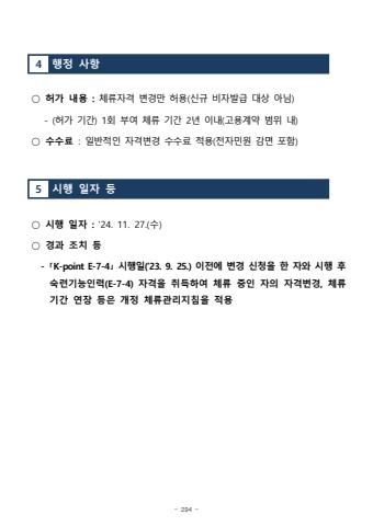 - 294 -4%ud589%uc815 %uc0ac%ud56d%u25cb %ud5c8%uac00 %ub0b4%uc6a9:%uccb4%ub958%uc790%uaca9 %ubcc0%uacbd%ub9cc %ud5c8%uc6a9(%uc2e0%uaddc %ube44%uc790%ubc1c%uae09 %ub300%uc0c1 %uc544%ub2d8)- (%ud5c8%uac00 %uae30%uac04) 1%ud68c %ubd80%uc5ec %uccb4%ub958 %uae30%uac04 2%ub144 %uc774%ub0b4(%uace0%uc6a9%uacc4%uc57d %ubc94%uc704 %ub0b4)%u25cb %uc218%uc218%ub8cc: %uc77c%ubc18%uc801%uc778 %uc790%uaca9%ubcc0%uacbd %uc218%uc218%ub8cc %uc801%uc6a9(%uc804%uc790%ubbfc%uc6d0 %uac10%uba74 %ud3ec%ud568)5%uc2dc%ud589 %uc77c%uc790 %ub4f1 %u25cb %uc2dc%ud589 %uc77c%uc790 :%u201824. 11. 27.(%uc218) %u25cb %uacbd%uacfc %uc870%uce58 %ub4f1- %uff62K-point E-7-4%uff63 %uc2dc%ud589%uc77c(%u201923. 9. 25.) %uc774%uc804%uc5d0 %ubcc0%uacbd %uc2e0%uccad%uc744 %ud55c %uc790%uc640 %uc2dc%ud589%ud6c4%uc219%ub828%uae30%ub2a5%uc778%ub825(E-7-4) %uc790%uaca9%uc744 %ucde8%ub4dd%ud558%uc5ec %uccb4%ub958 %uc911%uc778 %uc790%uc758 %uc790%uaca9%ubcc0%uacbd, %uccb4%ub958%uae30%uac04 %uc5f0%uc7a5 %ub4f1%uc740 %uac1c%uc815 %uccb4%ub958%uad00%ub9ac%uc9c0%uce68%uc744 %uc801%uc6a9