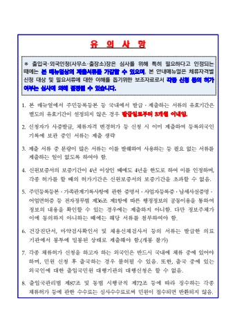 %uc720 %uc758 %uc0ac %ud56d%u203b%ucd9c%uc785%uad6d%u00b7%uc678%uad6d%uc778%uccad(%uc0ac%ubb34%uc18c%u00b7%ucd9c%uc7a5%uc18c)%uc7a5%uc740%uc2ec%uc0ac%ub97c%uc704%ud574%ud2b9%ud788%ud544%uc694%ud558%ub2e4%uace0%uc778%uc815%ub418%ub294%ub54c%uc5d0%ub294%ubcf8%ub9e4%ub274%uc5bc%uc0c1%uc758%uc81c%ucd9c%uc11c%ub958%ub97c%uac00%uac10%ud560%uc218%uc788%uc73c%uba70, %ubcf8%uc548%ub0b4%ub9e4%ub274%uc5bc%uc740%uccb4%ub958%uc790%uaca9%ubcc4%uc2e0%uccad%ub300%uc0c1%ubc0f%ud544%uc694%uc11c%ub958%uc5d0%ub300%ud55c%uc774%ud574%ub97c%ub3d5%uae30%uc704%ud55c%ubcf4%uc870%uc790%ub8cc%ub85c%uc11c%uac01%uc885%uc2e0%uccad%ub4f1%uc758%ud5c8%uac00%uc5ec%ubd80%ub294%uc2ec%uc0ac%uc5d0%uc758%ud574%uacb0%uc815%ub420%uc218%uc788%uc2b5%ub2c8%ub2e4.1.%ubcf8 %ub9e4%ub274%uc5bc%uc5d0%uc11c %uc8fc%ubbfc%ub4f1%ub85d%ub4f1%ubcf8 %ub4f1 %uad6d%ub0b4%uc5d0%uc11c %ubc1c%uae09%u2024%uc81c%ucd9c%ud558%ub294 %uc11c%ub958%uc758 %uc720%ud6a8%uae30%uac04%uc740 %ubcc4%ub3c4%uc758 %uc720%ud6a8%uae30%uac04%uc774 %uc124%uc815%ub418%uc9c0 %uc54a%uc740 %uacbd%uc6b0 %ubc1c%uae09%uc77c%ub85c%ubd80%ud130 3%uac1c%uc6d4 %uc774%ub0b4%uc784.2.%uc2e0%uccad%uc790%uac00 %uc0ac%uc99d%ubc1c%uae09,%uccb4%ub958%uc790%uaca9 %ubcc0%uacbd%ud5c8%uac00 %ub4f1 %uc2e0%uccad %uc2dc %uc774%ubbf8 %uc81c%ucd9c%ud558%uc5ec %ub4f1%ub85d%uc678%uad6d%uc778%uae30%ub85d%uc5d0 %ubcf4%uad00 %uc911%uc778 %uc11c%ub958%ub294 %uc81c%ucd9c %uc0dd%ub7b53.%uc81c%ucd9c %uc11c%ub958 %uc911 %ubd84%ub7c9%uc774 %ub9ce%uc740 %uc11c%ub958%ub294 %uc774%ub97c %ubc1c%ucdcc%ud558%uc5ec %uc0ac%uc6a9%ud558%ub294 %ub4f1 %ud544%uc694 %uc5c6%ub294 %uc11c%ub958%ub97c%uc81c%ucd9c%ud558%ub294 %uc77c%uc774 %uc5c6%ub3c4%ub85d %ud558%uc5ec%uc57c %ud568.%uc2e0%uc6d0%ubcf4%uc99d%uc11c%uc758 %ubcf4%uc99d%uae30%uac04%uc774 %ub144 %uc774%uc0c1%uc778 %ub54c%uc5d0%ub3c4 %ub144%uc744 %ud55c%ub3c4%ub85c %ud558%uc5ec %uc774%ub97c %uc778%uc815%ud558%uba70%uac01%uc885 %ud5c8%uac00%ub97c %ud560 %ub54c%uc758 %ud5c8%uac00%uae30%uac04%uc740 %uc2e0%uc6d0%ubcf4%uc99d%uc11c%uc758 %ubcf4%uc99d%uae30%uac04%uc744 %ucd08%uacfc%ud560 %uc218 %uc5c6%uc74c.5.%uc8fc%ubbfc%ub4f1%ub85d%ub4f1%ubcf8%u2024%uac00%uc871%uad00%uacc4%uae30%ub85d%uc0ac%ud56d%uc5d0 %uad00%ud55c %uc99d%uba85%uc11c%u2024%uc0ac%uc5c5%uc790%ub4f1%ub85d%uc99d%u2024%ub0a9%uc138%uc0ac%uc2e4%uc99d%uba85%u2024%uc5b4%uc5c5%uba74%ud5c8%uc99d %ub4f1 %uc804%uc790%uc815%ubd80%ubc95 %uc81c36%uc870 %uc81c1%ud56d%uc5d0 %ub530%ub978 %ud589%uc815%uc815%ubcf4%uc758 %uacf5%ub3d9%uc774%uc6a9%uc744 %ud1b5%ud558%uc5ec %uc815%ubcf4%uc758 %ub0b4%uc6a9%uc744 %ud655%uc778%ud560 %uc218 %uc788%ub294 %uacbd%uc6b0%uc5d0%ub294 %uc81c%ucd9c%ud558%uc9c0 %uc544%ub2c8%ud568.%ub2e4%ub9cc %uc815%ubcf4%uc8fc%uccb4%uac00%uc774%uc5d0 %ub3d9%uc758%ud558%uc9c0 %uc544%ub2c8%ud558%ub294 %ub54c%uc5d0%ub294 %ud574%ub2f9 %uc11c%ub958%ub97c %ucca8%ubd80%ud558%uc5ec%uc57c %ud568.6.%uac74%uac15%uc9c4%ub2e8%uc11c,%ub9c8%uc57d%uac80%uc0ac%ud655%uc778%uc11c %ubc0f %ucc44%uc6a9%uc2e0%uccb4%uac80%uc0ac%uc11c %ub4f1%uc758 %uc11c%ub958%ub294 %ubc1c%uae09%ud55c %uc758%ub8cc%uae30%uad00%uc5d0%uc11c %ubd09%ud22c%uc5d0 %ubc00%ubd09%ub41c %uc0c1%ud0dc%ub85c %uc81c%ucd9c%ud574%uc57c %ud568.(%uac1c%ubd09 %ubd88%uac00)7.%uac01%uc885 %uccb4%ub958%ud5c8%uac00 %uc2e0%uccad%uc744 %ud558%uace0%uc790 %ud558%ub294 %uc678%uad6d%uc778%uc740 %ubc18%ub4dc%uc2dc %uad6d%ub0b4%uc5d0 %uccb4%ub958 %uc911%uc5d0 %uc788%uc5b4%uc57c%ud558%uba70,%ubbfc%uc6d0 %uc2e0%uccad %ud6c4 %ucd9c%uad6d%ud558%ub294 %uacbd%uc6b0 %ubd88%ud5c8%ub420 %uc218 %uc788%uc74c.%ub610%ud55c,%ucd9c%uad6d %uc911%uc5d0 %uc788%ub294 %uc678%uad6d%uc778%uc5d0 %ub300%ud55c %ucd9c%uc785%uad6d%ubbfc%uc6d0 %ub300%ud589%uae30%uad00%uc758 %ub300%ud589%uc2e0%uccad%uc740 %ud560 %uc218 %uc5c6%uc74c.8.%ucd9c%uc785%uad6d%uad00%ub9ac%ubc95 %uc81c87%uc870 %ubc0f %ub3d9%ubc95 %uc2dc%ud589%uaddc%uce59 %uc81c72%uc870 %ub4f1%uc5d0 %ub530%ub77c %uc9d5%uc218%ud558%ub294 %uac01%uc885 %uccb4%ub958%ud5c8%uac00 %ub4f1%uc5d0 %uad00%ud55c %uc218%uc218%ub8cc%ub294 %uc2ec%uc0ac%uc218%uc218%ub8cc%ub85c%uc368 %ubbfc%uc6d0%uc774 %uc811%uc218%ub418%uba74 %ubc18%ud658%ub418%uc9c0 %uc54a%uc74c.