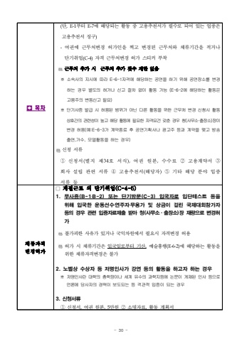 - 30 -%uf000%ubaa9%ucc28(%ub2e8,E-1%ubd80%ud130 E-7%uc5d0 %ud574%ub2f9%ub418%ub294 %ud65c%ub3d9 %uc911 %uace0%uc6a9%ucd94%ucc9c%uc11c%uac00 %ud544%uc218%ub85c %ub418%uc5b4 %uc788%ub294 %uc5c5%uc885%uc740 %uace0%uc6a9%ucd94%ucc9c%uc11c %uc9d5%uad6c)-%uc5ec%uad8c%uc5d0 %uadfc%ubb34%ucc98%ubcc0%uacbd %ud5c8%uac00%uc778%uc744 %ucc0d%uace0 %ubcc0%uacbd%ub41c %uadfc%ubb34%ucc98%uc640 %uccb4%ub958%uae30%uac04%uc744 %uc801%uac70%ub098 %ub2e8%uae30%ucde8%uc5c5(C-4)%uc790%uaca9 %uadfc%ubb34%ucc98%ubcc0%uacbd %ud5c8%uac00 %uc2a4%ud2f0%ucee4 %ubd80%ucc29%uadfc%ubb34%ucc98 %ucd94%uac00 %uc2dc %uadfc%ubb34%ucc98 %ucd94%uac00 %ud69f%uc218 %uc81c%ud55c %uc5c6%uc74c%u203b %uc18c%uc18d%uc0ac%uc758 %uc9c0%uc2dc%uc5d0 %ub530%ub77c E-6-1%uc790%uaca9%uc5d0 %ud574%ub2f9%ud558%ub294 %uacf5%uc5f0%uc744 %ud558%uae30 %uc704%ud574 %uacf5%uc5f0%uc7a5%uc18c%ub97c %ubcc0%uacbd%ud558%ub294 %uacbd%uc6b0 %ubcc4%ub3c4%uc758 %ud5c8%uac00%ub098 %uc2e0%uace0 %uc808%ucc28 %uc5c6%uc774 %ud65c%ub3d9 %uac00%ub2a5 (E-6-2%uc5d0 %ud574%ub2f9%ud558%ub294 %ud65c%ub3d9%uc740 %uace0%uc6a9%uc8fc%uc758 %ubcc0%ub3d9%uc2e0%uace0 %ud544%uc694)%u203b %ub2e8%uae30%uc0ac%uc99d %ubc1c%uae09 %uc2dc %ud5c8%uc6a9%ub41c %ubc94%uc704%uac00 %uc544%ub2cc %ub2e4%ub978 %ud65c%ub3d9%uc744 %uc704%ud55c %uadfc%ubb34%ucc98 %ubcc0%uacbd %uc2e0%uccad%uc2dc %ud65c%ub3d9%uc0c1%ud638%uac04%uc758 %uad00%ub828%uc131%uc774 %ub192%uace0 %ud574%ub2f9 %ud65c%ub3d9%uc5d0 %ud544%uc694%ud55c %uc790%uaca9%uc694%uac74%uac16%ucd98 %uacbd%uc6b0 %uccad(%uc0ac%ubb34%uc18c%u00b7%ucd9c%uc7a5%uc18c)%uc7a5%uc774 %ubcc0%uacbd %ud5c8%uc6a9(%uc608:E-6-3%uac00 %uacc4%uc57d%uc885%ub8cc %ud6c4 %uacf5%uc5f0%uae30%ud68d%uc0ac%ub098 %uad11%uace0%uc8fc %ub4f1%uacfc %uacc4%uc57d%uc744 %ub9fa%uace0 %ubc29%uc1a1%ucd9c%uc5f0,%uac00%uc218, %ubaa8%ub378%ud65c%ub3d9%uc744 %ud558%ub294 %uacbd%uc6b0)%uc2e0%uccad %uc11c%ub958%u2460%uc2e0%uccad%uc11c(%ubcc4%uc9c0 %uc81c34%ud638 %uc11c%uc2dd),%uc5ec%uad8c %uc6d0%ubcf8,%uc218%uc218%ub8cc%u2461%uace0%uc6a9%uacc4%uc57d%uc11c %u2462%ud68c%uc0ac %uc124%ub9bd %uad00%ub828 %uc11c%ub958 %u2463%uace0%uc6a9%ucd94%ucc9c%uc11c(%ud574%ub2f9%uc790)%u2464%uae30%ud0c0 %ud574%ub2f9 %ubd84%uc57c %uc785%uc99d %uc11c%ub958 %ub4f1%uccb4%ub958%uc790%uaca9%ubcc0%uacbd%ud5c8%uac00%u25a1 %uacc4%uc808%uadfc%ub85c %uc678 %ub2e8%uae30%ucde8%uc5c5(C-4-5)1. %ubb34%uc0ac%uc99d(B-1%u2024B-2) %ub610%ub294 %ub2e8%uae30%ubc29%ubb38(C-3) %uc785%uad6d%uc790%ub85c%uc785%ub2e8%ud14c%uc2a4%ud2b8 %ub4f1%uc744 %uc704%ud574 %uc785%uad6d%ud55c %uc6b4%ub3d9%uc120%uc218%u2027%uc5f0%uc8fc%uc790%u2027%ubb34%uc6a9%uac00 %ubc0f %uc0c1%uae08%uc774 %uac78%ub9b0 %uad6d%uc81c%ub300%ud68c%ucc38%uac00%uc790%ub4f1%uc758 %uacbd%uc6b0 %uad00%ub828 %uc785%uc99d%uc790%ub8cc%uc81c%ucd9c %ubc1b%uc544 %uccad(%uc0ac%ubb34%uc18c%u00b7%ucd9c%uc7a5%uc18c)%uc7a5 %uc7ac%ub7c9%uc73c%ub85c %ubcc0%uacbd%ud5c8%uac00%ubd88%uac00%ud53c%ud55c %uc0ac%uc720%uac00 %uc788%uac70%ub098 %uad6d%uc775%ucc28%uc6d0%uc5d0%uc11c %ud544%uc694%uc2dc %uc790%uaca9%ubcc0%uacbd %ud5c8%uc6a9%ud5c8%uac00 %uc2dc %uccb4%ub958%uae30%uac04%uc740 %uc785%uad6d%uc77c%ub85c%ubd80%ud130 %uae30%uc0b0,%uc608%uc220%ud765%ud589(E-6-2)%uc5d0 %ud574%ub2f9%ud558%ub294 %ud65c%ub3d9%uc744 %uc704%ud55c %uccb4%ub958%uc790%uaca9%ubcc0%uacbd%uc740 %ubd88%uac002. %ub178%ubca8%uc0c1 %uc218%uc0c1%uc790 %ub4f1 %uc800%uba85%uc778%uc0ac%uac00 %uac15%uc5f0 %ub4f1%uc758 %ud65c%ub3d9%uc744 %ud558%uace0%uc790 %ud558%ub294 %uacbd%uc6b0%u203b %uc800%uba85%uc778%uc0ac%ub780 %ub300%ud559%uc758 %ucd1d%ud559%uc7a5%uc774%ub098 %uc138%uacc4 %uc720%uc218%uc758 %uacfc%ud559%uc9c0%ub4f1%uc5d0 %ub17c%ubb38%uc774 %uac8c%uc7ac%ub41c %uc778%uc0ac %ub4f1%uc73c%ub85c %uc5b8%ub860%uc5d0 %ub2f9%uc0ac%uc790%uc758 %uacbd%ub825%uc774 %ubcf4%ub3c4%ub418%ub294 %ub4f1 %uac1d%uad00%uc801 %uc785%uc99d%uc774 %ub418%ub294 %uacbd%uc6b03. %uc2e0%uccad%uc11c%ub958%u2460%uc2e0%uccad%uc11c,%uc5ec%uad8c %uc6d0%ubcf8,5%ub9cc%uc6d0 %u2461%uc18c%uba85%uc790%ub8cc,%ud65c%ub3d9 %uacc4%ud68d%uc11c