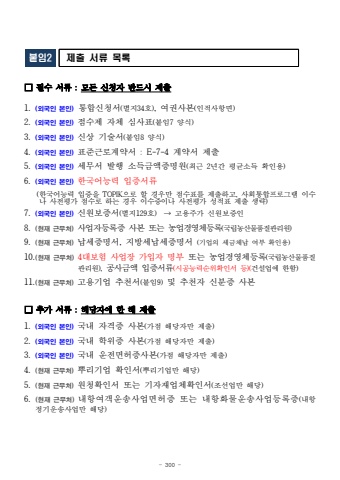 - 300 -%ubd99%uc7842%uc81c%ucd9c %uc11c%ub958 %ubaa9%ub85d %u25a1 %ud544%uc218 %uc11c%ub958 : %ubaa8%ub4e0 %uc2e0%uccad%uc790 %ubc18%ub4dc%uc2dc %uc81c%ucd9c1. (%uc678%uad6d%uc778 %ubcf8%uc778)%ud1b5%ud569%uc2e0%uccad%uc11c(%ubcc4%uc9c034%ud638), %uc5ec%uad8c%uc0ac%ubcf8(%uc778%uc801%uc0ac%ud56d%uba74) 2. (%uc678%uad6d%uc778 %ubcf8%uc778) %uc810%uc218%uc81c %uc790%uccb4 %uc2ec%uc0ac%ud45c(%ubd99%uc7847 %uc591%uc2dd)3. (%uc678%uad6d%uc778 %ubcf8%uc778) %uc2e0%uc0c1 %uae30%uc220%uc11c(%ubd99%uc7848 %uc591%uc2dd)4. (%uc678%uad6d%uc778 %ubcf8%uc778) %ud45c%uc900%uadfc%ub85c%uacc4%uc57d%uc11c : E-7-4 %uacc4%uc57d%uc11c %uc81c%ucd9c5. (%uc678%uad6d%uc778 %ubcf8%uc778) %uc138%ubb34%uc11c %ubc1c%ud589 %uc18c%ub4dd%uae08%uc561%uc99d%uba85%uc6d0(%ucd5c%uadfc 2%ub144%uac04 %ud3c9%uade0%uc18c%ub4dd %ud655%uc778%uc6a9)6. (%uc678%uad6d%uc778 %ubcf8%uc778) %ud55c%uad6d%uc5b4%ub2a5%ub825 %uc785%uc99d%uc11c%ub958(%ud55c%uad6d%uc5b4%ub2a5%ub825 %uc785%uc99d%uc744 TOPIK%uc73c%ub85c %ud560 %uacbd%uc6b0%ub9cc %uc810%uc218%ud45c%ub97c %uc81c%ucd9c%ud558%uace0, %uc0ac%ud68c%ud1b5%ud569%ud504%ub85c%uadf8%ub7a8%uc774%uc218%ub098 %uc0ac%uc804%ud3c9%uac00 %uc810%uc218%ub85c %ud558%ub294 %uacbd%uc6b0 %uc774%uc218%uc99d%uc774%ub098 %uc0ac%uc804%ud3c9%uac00 %uc131%uc801%ud45c %uc81c%ucd9c %uc0dd%ub7b5)7. (%uc678%uad6d%uc778 %ubcf8%uc778) %uc2e0%uc6d0%ubcf4%uc99d%uc11c(%ubcc4%uc9c0129%ud638) %u2192 %uace0%uc6a9%uc8fc%uac00 %uc2e0%uc6d0%ubcf4%uc99d%uc778 8. (%ud604%uc7ac %uadfc%ubb34%ucc98)%uc0ac%uc5c5%uc790%ub4f1%ub85d%uc99d %uc0ac%ubcf8 %ub610%ub294 %ub18d%uc5c5%uacbd%uc601%uccb4%ub4f1%ub85d(%uad6d%ub9bd%ub18d%uc0b0%ubb3c%ud488%uc9c8%uad00%ub9ac%uc6d0)9. (%ud604%uc7ac %uadfc%ubb34%ucc98)%ub0a9%uc138%uc99d%uba85%uc11c, %uc9c0%ubc29%uc138%ub0a9%uc138%uc99d%uba85%uc11c (%uae30%uc5c5%uc758 %uc138%uae08%uccb4%ub0a9 %uc5ec%ubd80 %ud655%uc778%uc6a9)10.(%ud604%uc7ac %uadfc%ubb34%ucc98)4%ub300%ubcf4%ud5d8 %uc0ac%uc5c5%uc7a5 %uac00%uc785%uc790%uba85%ubd80 %ub610%ub294 %ub18d%uc5c5%uacbd%uc601%uccb4%ub4f1%ub85d(%uad6d%ub9bd%ub18d%uc0b0%ubb3c%ud488%uc9c8%uad00%ub9ac%uc6d0),%uacf5%uc0ac%uae08%uc561 %uc785%uc99d%uc11c%ub958(%uc2dc%uacf5%ub2a5%ub825%uc21c%uc704%ud655%uc778%uc11c %ub4f1)(%uac74%uc124%uc5c5%uc5d0%ud55c%ud568)11.(%ud604%uc7ac %uadfc%ubb34%ucc98)%uace0%uc6a9%uae30%uc5c5 %ucd94%ucc9c%uc11c(%ubd99%uc7849)%ubc0f %ucd94%ucc9c%uc790 %uc2e0%ubd84%uc99d %uc0ac%ubcf8%u25a1 %ucd94%uac00 %uc11c%ub958 : %ud574%ub2f9%uc790%uc5d0 %ud55c %ud574 %uc81c%ucd9c1. (%uc678%uad6d%uc778 %ubcf8%uc778) %uad6d%ub0b4 %uc790%uaca9%uc99d %uc0ac%ubcf8(%uac00%uc810 %ud574%ub2f9%uc790%ub9cc %uc81c%ucd9c)2. (%uc678%uad6d%uc778 %ubcf8%uc778) %uad6d%ub0b4 %ud559%uc704%uc99d %uc0ac%ubcf8(%uac00%uc810 %ud574%ub2f9%uc790%ub9cc %uc81c%ucd9c)3. (%uc678%uad6d%uc778 %ubcf8%uc778) %uad6d%ub0b4 %uc6b4%uc804%uba74%ud5c8%uc99d%uc0ac%ubcf8(%uac00%uc810 %ud574%ub2f9%uc790%ub9cc %uc81c%ucd9c)4. (%ud604%uc7ac %uadfc%ubb34%ucc98) %ubfcc%ub9ac%uae30%uc5c5 %ud655%uc778%uc11c(%ubfcc%ub9ac%uae30%uc5c5%ub9cc %ud574%ub2f9)5. (%ud604%uc7ac %uadfc%ubb34%ucc98) %uc6d0%uccad%ud655%uc778%uc11c %ub610%ub294 %uae30%uc790%uc7ac%uc5c5%uccb4%ud655%uc778%uc11c(%uc870%uc120%uc5c5%ub9cc %ud574%ub2f9)6. (%ud604%uc7ac %uadfc%ubb34%ucc98) %ub0b4%ud56d%uc5ec%uac1d%uc6b4%uc1a1%uc0ac%uc5c5%uba74%ud5c8%uc99d %ub610%ub294 %ub0b4%ud56d%ud654%ubb3c%uc6b4%uc1a1%uc0ac%uc5c5%ub4f1%ub85d%uc99d(%ub0b4%ud56d%uc815%uae30%uc6b4%uc1a1%uc0ac%uc5c5%ub9cc %ud574%ub2f9)