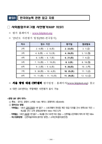 - 306 -%ubd99%uc7848%ud55c%uad6d%uc5b4%ub2a5%ub825 %uad00%ub828 %ucc38%uace0 %uc790%ub8cc%u25a1 %uc0ac%ud68c%ud1b5%ud569%ud504%ub85c%uadf8%ub7a8 %uc0ac%uc804%ud3c9%uac00(KIIP TEST)%u3147 %ud3c9%uac00 %ud648%ud398%uc774%uc9c0 :www.kiiptest.org%u3147 %u201925%ub144%ub3c4 %uc0ac%uc804%ud3c9%uac00 %uc77c%uc815(PBT-%uc804%uad6d%ub3d9%uc2dc)%ucc28%uc218%uc811%uc218 %uae30%uac04%ud3c9%uac00%uc77c%uacb0%uacfc%ubc1c%ud45c2%ucc282. 4.(%ud654) ~ 2. 8.(%ud1a0)2. 22.(%ud1a0)3. 7.(%uae08)3%ucc284. 8.(%ud654) ~ 4. 12.(%ud1a0)4. 26.(%ud1a0)5. 12.(%uc6d4)4%ucc286. 3.(%ud654) ~ 6. 7.(%ud1a0)6. 21.(%ud1a0)7. 4.(%uae08)5%ucc287. 15.(%ud654) ~ 7. 19.(%ud1a0)8. 2.(%ud1a0)8. 18.(%uc6d4)6%ucc289. 2.(%ud654) ~ 9. 6.(%ud1a0)9. 20.(%ud1a0)10. 2.(%ubaa9)7%ucc289. 30.(%ud654) ~ 10. 4.(%ud1a0)10. 25.(%ud1a0)11. 7.(%uae08)8%ucc2811. 11.(%ud654) ~ 11. 15.(%ud1a0)11. 29.(%ud1a0)12. 12.(%uae08)%u3147 %uc11c%uc6b8%uad11%uba85%u2027%ub300%uc804 CBT%uc13c%ud130%ud3c9%uac00%uc77c%uc815 :%ud648%ud398%uc774%uc9c0(www.kiiptest.org)%ucc38%uace0%u203b %ub300%uc804 CBT%uc13c%ud130%ub294 %uc8fc%ub9d0%uc5d0%ub9cc %uc0ac%uc804%ud3c9%uac00 %uc751%uc2dc %uac00%ub2a5<%uad11%uba85 CBT %uc13c%ud130 %uc704%uce58>%u25cb %uc8fc%uc18c: %uacbd%uae30%ub3c4 %uad11%uba85%uc2dc %uc18c%ud558%ub3d9 1365 %uc5d0%uc774%uc2a4 %uad11%uba85%ud0c0%uc6cc 3%uce35(304%ud638)%u25cb %ucc3e%uc544%uc624%ub294 %ubc29%ubc95- %uc9c0%ud558%ucca0%u2460: 1%ud638%uc120 %uae08%ucc9c%uad6c%uccad%uc5ed1%ubc88 %ucd9c%uad6c %u2192 %uc2a4%ud1a0%ub9ac%uc6e8%uc774 %ud3b8%uc758%uc810 %uacc4%ub2e8 %ub4b7%uae38 %ub2e4%ub9ac%ub97c %uac74%ub108 %uc67c%ucabd%uc73c%ub85c %uc9c1%uc9c4 %u2192 %uc721%uad50%ub97c %uac74%ub108 %u2018%uc18c%ud558 %uad11%uba85%uad50%ud68c%u2019%uc5d0%uc11c 100m %uc774%ub0b4 %ub3c4%ucc29- %uc9c0%ud558%ucca0%u2461: 1%ud638%uc120 %uc11d%uc218%uc5ed1%ubc88 %ucd9c%uad6c %u2192 %uc721%uad50%ub97c %uac74%ub108 101%ubc88 %ubc84%uc2a4 %ud0d1%uc2b9 %u2192 %uc2e0%ucd0c%ub9c8%uc744 2%ub2e8%uc9c0%uc5d0%uc11c %ud558%ucc28 %ud6c4 %uc9c1%uc9c4 100m - %ubc84%uc2a4%uc815%ub958%uc7a5%uba85: %uc2e0%ucd0c%ub9c8%uc744%uc544%ud30c%ud2b8(%ud3c9%uac00%uc7a5 %ubc29%uba74) / %uc18c%ud558%ub2e8%ub3c5%ud544%uc9c0(%ub9de%uc740%ud3b8)