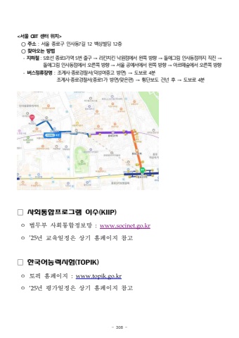 - 308 -<%uc11c%uc6b8 CBT %uc13c%ud130 %uc704%uce58>%u25cb %uc8fc%uc18c: %uc11c%uc6b8 %uc885%ub85c%uad6c %uc778%uc0ac%ub3d97%uae38 12 %ubc31%uc0c1%ube4c%ub529 12%uce35%u25cb %ucc3e%uc544%uc624%ub294 %ubc29%ubc95- %uc9c0%ud558%ucca0: 5%ud638%uc120 %uc885%ub85c3%uac00%uc5ed 5%ubc88 %ucd9c%uad6c %u2192 %ub9ac%ud0a8%uce58%ud0a8 %ub099%uc6d0%uc810%uc5d0%uc11c %uc67c%ucabd %ubc29%ud5a5 %u2192 %ub3cc%uc560%uadf8%ub9bc %uc778%uc0ac%ub3d9%uc810%uae4c%uc9c0 %uc9c1%uc9c4 %u2192 %ub3cc%uc560%uadf8%ub9bc %uc778%uc0ac%ub3d9%uc810%uc5d0%uc11c %uc624%ub978%ucabd %ubc29%ud5a5 %u2192 %uc11c%uc6b8 %uacf5%uc608%uc11c%uc5d0%uc11c %uc67c%ucabd %ubc29%ud5a5 %u2192 %uc544%ub974%ub5bc%uc232%uc5d0%uc11c %uc624%ub978%ucabd %ubc29%ud5a5- %ubc84%uc2a4%uc815%ub958%uc7a5%uba85: %uc870%uacc4%uc0ac%u2027%uc885%ub85c%uacbd%ucc30%uc11c(%ub355%uc131%uc5ec%uc911%uace0 %ubc29%uba74) %u2192 %ub3c4%ubcf4%ub85c 4%ubd84%uc870%uacc4%uc0ac%u2027%uc885%ub85c%uacbd%ucc30%uc11c(%uc885%ub85c1%uac00 %ubc29%uba74/%ub9de%uc740%ud3b8) %u2192 %ud6a1%ub2e8%ubcf4%ub3c4 %uac74%ub10c %ud6c4 %u2192 %ub3c4%ubcf4%ub85c 4%ubd84%u25a1 %uc0ac%ud68c%ud1b5%ud569%ud504%ub85c%uadf8%ub7a8 %uc774%uc218(KIIP)%u3147 %ubc95%ubb34%ubd80 %uc0ac%ud68c%ud1b5%ud569%uc815%ubcf4%ub9dd :www.socinet.go.kr%u3147 %u201925%ub144 %uad50%uc721%uc77c%uc815%uc740 %uc0c1%uae30 %ud648%ud398%uc774%uc9c0 %ucc38%uace0%u25a1 %ud55c%uad6d%uc5b4%ub2a5%ub825%uc2dc%ud5d8(TOPIK)%u3147 %ud1a0%ud53d %ud648%ud398%uc774%uc9c0 :www.topik.go.kr%u3147 %u201925%ub144 %ud3c9%uac00%uc77c%uc815%uc740 %uc0c1%uae30 %ud648%ud398%uc774%uc9c0 %ucc38%uace0