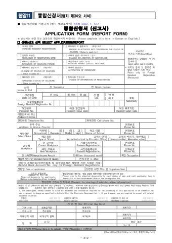 - 312 -%ubd99%uc78411%ud1b5%ud569%uc2e0%uccad%uc11c(%ubcc4%uc9c0 %uc81c34%ud638 %uc11c%uc2dd)%u25a0 %ucd9c%uc785%uad6d%uad00%ub9ac%ubc95 %uc2dc%ud589%uaddc%uce59 [%ubcc4%uc9c0 %uc81c34%ud638%uc11c%uc2dd] <%uac1c%uc815 2022. 4. 12.>%ud1b5%ud569%uc2e0%uccad%uc11c(%uc2e0%uace0%uc11c)APPLICATIONFORM(REPORTFORM)%u203b %uc2e0%uccad%uc11c%ub294 %ud55c%uae00 %ub610%ub294 %uc601%ubb38%uc73c%ub85c %uc791%uc131%ud558%uc2dc%uae30 %ubc14%ub78d%ub2c8%ub2e4. (Please complete this form in Korean or English.)%u25a1 %uc2e0%uccad/%uc2e0%uace0 %uc120%ud0dd SELECT APPLICATION/REPORT[ ] %uc678%uad6d%uc778 %ub4f1%ub85d FOREIGN RESIDENT REGISTRATION[ ]%uccb4%ub958%uc790%uaca9 %uc678 %ud65c%ub3d9%ud5c8%uac00 (%ud76c%ub9dd %uc790%uaca9 : )PHOTO%uc5ec%uad8c%uc6a9 %uc0ac%uc9c4(35%u339c%u00d745%u339c)* %ucd2c%uc601%uc77c%ubd80%ud130 6%uac1c%uc6d4%uc774 %uc9c0%ub098%uc9c0 %uc54a%uc544%uc57c %ud568taken within last6 months* %uc678%uad6d%uc778 %ub4f1%ub85d %ubc0f %ub4f1%ub85d%uc99d %uc7ac%ubc1c%uae09 %uc2dc%uc5d0%ub9cc %uc0ac%uc9c4 %ubd80%ucc29Photo only for Foreign Resident Registration (Reissued)ENGAGE IN ACTIVITIES NOT COVERED BY THESTATUS OF SOJOURN / Status to apply for ( )[ ] %ub4f1%ub85d%uc99d %uc7ac%ubc1c%uae09 REISSUANCE OF REGISTRATION CARD[ ] %uadfc%ubb34%ucc98 %ubcc0%uacbd%u318d%ucd94%uac00%ud5c8%uac00 / %uc2e0%uace0CHANGE OR ADDITION OF WORKPLACE[ ] %uccb4%ub958%uae30%uac04 %uc5f0%uc7a5%ud5c8%uac00EXTENSION OF SOJOURN PERIOD[ ] %uc7ac%uc785%uad6d%ud5c8%uac00 (%ub2e8%uc218, %ubcf5%uc218) REENTRY PERMIT (SINGLE, MULTIPLE)[ ] %uccb4%ub958%uc790%uaca9 %ubcc0%uacbd%ud5c8%uac00(%ud76c%ub9dd %uc790%uaca9 : )[ ] %uccb4%ub958%uc9c0 %ubcc0%uacbd%uc2e0%uace0 ALTERATION OF RESIDENCECHANGE OF STATUS OF SOJOURN/ Status to apply for ( )[ ] %uccb4%ub958%uc790%uaca9 %ubd80%uc5ec (%ud76c%ub9dd %uc790%uaca9 : )[ ]%ub4f1%ub85d%uc0ac%ud56d %ubcc0%uacbd%uc2e0%uace0 CHANGE OF INFORMATION ON REGISTRATIONGRANTING STATUS OF SOJOURN/ Status to apply for ( )%uc131%uba85Name In Full%uc131 Surname%uba85 Given names%uc0dd%ub144%uc6d4%uc77c Date of Birth%ub144 yyyy%uc6d4 mm%uc77c dd%uc131 %ubcc4 Sex[ ]%ub0a8 M[ ]%uc5ec F%uad6d%uc801Nationality%uc678%uad6d%uc778%ub4f1%ub85d%ubc88%ud638Foreign Resident Registration No.%uc5ec%uad8c%ubc88%ud638Passport No.%uc5ec%uad8c %ubc1c%uae09%uc77c%uc790Passport Issue Date%uc5ec%uad8c %uc720%ud6a8%uae30%uac04Passport Expiry Date%ub300%ud55c%ubbfc%uad6d %ub0b4 %uc8fc%uc18cAddress In Korea%uc804%ud654%ubc88%ud638 Telephone No.%ud734%ub300%uc804%ud654 Cell phone No.%ubcf8%uad6d %uc8fc%uc18cAddress In Home Country%uc804%ud654%ubc88%ud638Phone No.%uc7ac%ud559 %uc5ec%ubd80SchoolStatus%ubbf8%ucde8%ud559[ ], %ucd08[ ], %uc911[ ], %uace0[ ]Non-school[ ], Elementary[ ], Middle[ ], High[ ]%ud559%uad50 %uc774%ub984 Name of School%uc804%ud654%ubc88%ud638Phone No.%ud559%uad50 %uc885%ub958Type of School%uad50%uc721%uccad %uc778%uac00[ ],%uad50%uc721%uccad %ube44%uc778%uac00, %ub300%uc548%ud559%uad50[ ]Accredited school by Education Office[ ], Non-accredited, Alternative school[ ]%uadfc%ubb34%ucc98Workplace%uc6d0 %uadfc%ubb34%ucc98Current Workplace%uc0ac%uc5c5%uc790%ub4f1%ub85d%ubc88%ud638Business Registration No.%uc804%ud654%ubc88%ud638Phone No.%uc608%uc815 %uadfc%ubb34%ucc98New Workplace%uc0ac%uc5c5%uc790%ub4f1%ub85d%ubc88%ud638Business Registration No.%uc804%ud654%ubc88%ud638Phone No.%uc5f0 %uc18c%ub4dd%uae08%uc561 Annual Income Amount%ub9cc%uc6d0(ten thousand won)%uc9c1%uc5c5 Occupation%uc7ac%uc785%uad6d %uc2e0%uccad %uae30%uac04 Intended Period Of Reentry%uc804%uc790%uc6b0%ud3b8 E-Mail%ubc18%ud658%uc6a9 %uacc4%uc88c%ubc88%ud638(%uc678%uad6d%uc778%ub4f1%ub85d %ubc0f %uc678%uad6d%uc778%ub4f1%ub85d%uc99d %uc7ac%ubc1c%uae09 %uc2e0%uccad %uc2dc%uc5d0%ub9cc %uae30%uc7ac)Refund Bank Account No. only for Foreign Resident Registration%uc2e0%uccad%uc77cDate of application%uc2e0%uccad%uc778 %uc11c%uba85 %ub610%ub294 %uc778Signature/Seal%uc2e0%uccad%uc778 %uc81c%ucd9c%uc11c%ub958(%ub2f4%ub2f9%uacf5%ubb34%uc6d0 %ud655%uc778%uc0ac%ud56d)Required documents for applicants(Matters to be checked by officer in charge)%u300c%ucd9c%uc785%uad6d%uad00%ub9ac%ubc95 %uc2dc%ud589%uaddc%uce59%u300d %ubcc4%ud45c 5%uc7582%uc758 %uccb4%ub958%uc790%uaca9%ubcc4%u318d%uc2e0%uccad%uad6c%ubd84%ubcc4 %ucca8%ubd80%uc11c%ub958 %ucc38%uace0Please refer to the attached documents for each status of stay and each application type in Annex 5-2 of the Enforcement Rule of the Immigration Act.%ud589%uc815%uc815%ubcf4 %uacf5%ub3d9%uc774%uc6a9 %ub3d9%uc758%uc11c (Consent for sharing of administrative information)%ubcf8%uc778%uc740 %uc774 %uac74 %uc5c5%ubb34%ucc98%ub9ac%uc640 %uad00%ub828%ud558%uc5ec %ub2f4%ub2f9 %uacf5%ubb34%uc6d0%uc774 %u300c%uc804%uc790%uc815%ubd80%ubc95%u300d %uc81c36%uc870%uc5d0 %ub530%ub978 %ud589%uc815%uc815%ubcf4%uc758 %uacf5%ub3d9%uc774%uc6a9%uc744 %ud1b5%ud558%uc5ec %uc704%uc758 %ub2f4%ub2f9 %uacf5%ubb34%uc6d0 %ud655%uc778 %uc0ac%ud56d%uc744 %ud655%uc778%ud558%ub294 %uac83%uc5d0 %ub3d9%uc758%ud569%ub2c8%ub2e4*%ub3d9%uc758%ud558%uc9c0 %uc54a%ub294 %uacbd%uc6b0%uc5d0%ub294 %uc2e0%uccad%uc778%uc774 %uc9c1%uc811 %uad00%ub828 %uc11c%ub958%ub97c %uc81c%ucd9c%ud574%uc57c %ud569%ub2c8%ub2e4I, the undersigned, hereby consent to allow all documents and information required for the processing of this application to be viewed by the public servant in charge as specified in Article 36 of the Electronic Government Act. * If you disagree, you are required to present all related documents in person.%uc2e0%uccad%uc778Applicant%uc11c%uba85 %ub610%ub294 %uc778Signature/Seal%uc2e0%uccad%uc778%uc758 %ubc30%uc6b0%uc790Spouse of applicant%uc11c%uba85 %ub610%ub294 %uc778Signature/Seal%uc2e0%uccad%uc778%uc758 %ubd80 %ub610%ub294 %ubaa8Father/Mother of applicant%uc11c%uba85 %ub610%ub294 %uc778Signature/Seal%uacf5 %uc6a9 %ub780 (For Official Use Only)%uae30%ubcf8 %uc0ac%ud56d%ucd5c%ucd08%uc785%uad6d%uc77c%uccb4%ub958%uc790%uaca9%uccb4%ub958%uae30%uac04%uc811%uc218 %uc0ac%ud56d%uc811%uc218%uc77c%uc790%uc811%uc218%ubc88%ud638%ud5c8%uac00(%uc2e0%uace0) %uc0ac%ud56d%