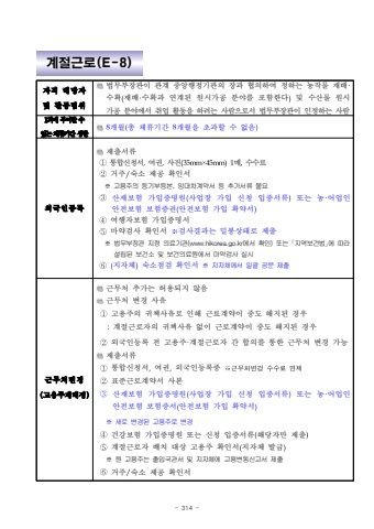 - 314 %uacc4%uc808%uadfc%ub85c(E-8)%uc790%uaca9%ud574%ub2f9%uc790%ubc0f%ud65c%ub3d9%ubc94%uc704%ubc95%ubb34%ubd80%uc7a5%uad00%uc774 %uad00%uacc4 %uc911%uc559%ud589%uc815%uae30%uad00%uc758 %uc7a5%uacfc %ud611%uc758%ud558%uc5ec %uc815%ud558%ub294 %ub18d%uc791%ubb3c %uc7ac%ubc30%u00b7%uc218%ud655(%uc7ac%ubc30%u00b7%uc218%ud655%uacfc %uc5f0%uacc4%ub41c %uc6d0%uc2dc%uac00%uacf5 %ubd84%uc57c%ub97c %ud3ec%ud568%ud55c%ub2e4)%ubc0f %uc218%uc0b0%ubb3c %uc6d0%uc2dc%uac00%uacf5 %ubd84%uc57c%uc5d0%uc11c %ucde8%uc5c5 %ud65c%ub3d9%uc744 %ud558%ub824%ub294 %uc0ac%ub78c%uc73c%ub85c%uc11c %ubc95%ubb34%ubd80%uc7a5%uad00%uc774 %uc778%uc815%ud558%ub294 %uc0ac%ub78c1%ud68c%uc5d0%ubd80%uc5ec%ud560%uc218%uc788%ub294%uccb4%ub958%uae30%uac04%uc0c1%ud55c8%uac1c%uc6d4(%ucd1d %uccb4%ub958%uae30%uac04 8%uac1c%uc6d4%uc744 %ucd08%uacfc%ud560 %uc218 %uc5c6%uc74c)%uc678%uad6d%uc778%ub4f1%ub85d%uc81c%ucd9c%uc11c%ub958%u2460%ud1b5%ud569%uc2e0%uccad%uc11c,%uc5ec%uad8c,%uc0ac%uc9c4(35mm%u00d745mm)1%ub9e4,%uc218%uc218%ub8cc%u2461%uac70%uc8fc/%uc219%uc18c %uc81c%uacf5 %ud655%uc778%uc11c%u203b %uace0%uc6a9%uc8fc%uc758 %ub4f1%uae30%ubd80%ub4f1%ubcf8, %uc784%ub300%ucc28%uacc4%uc57d%uc11c %ub4f1 %ucd94%uac00%uc11c%ub958 %ubd88%uc694%u2462%uc0b0%uc7ac%ubcf4%ud5d8 %uac00%uc785%uc99d%uba85%uc6d0(%uc0ac%uc5c5%uc7a5 %uac00%uc785 %uc2e0%uccad %uc785%uc99d%uc11c%ub958)%ub610%ub294 %ub18d%u00b7%uc5b4%uc5c5%uc778%uc548%uc804%ubcf4%ud5d8 %ubcf4%ud5d8%uc99d%uad8c(%uc548%uc804%ubcf4%ud5d8 %uac00%uc785 %ud655%uc57d%uc11c)%u2463%uc5ec%ud589%uc790%ubcf4%ud5d8 %uac00%uc785%uc99d%uba85%uc11c%u2464%ub9c8%uc57d%uac80%uc0ac %ud655%uc778%uc11c %u203b%uac80%uc0ac%uacb0%uacfc%ub294 %ubc00%ubd09%uc0c1%ud0dc%ub85c %uc81c%ucd9c%u203b %ubc95%ubb34%ubd80%uc7a5%uad00 %uc9c0%uc815 %uc758%ub8cc%uae30%uad00(www.hikorea.go.kr%uc5d0%uc11c %ud655%uc778) %ub610%ub294 %uff62%uc9c0%uc5ed%ubcf4%uac74%ubc95%uff63%uc5d0 %ub530%ub77c%uc124%ub9bd%ub41c %ubcf4%uac74%uc18c %ubc0f %ubcf4%uac74%uc758%ub8cc%uc6d0%uc5d0%uc11c %ub9c8%uc57d%uac80%uc0ac %uc2e4%uc2dc%u2465(%uc9c0%uc790%uccb4)%uc219%uc18c%uc810%uac80 %ud655%uc778%uc11c %u203b %uc9c0%uc790%uccb4%uc5d0%uc11c %uc77c%uad04 %uacf5%ubb38 %uc81c%ucd9c%uadfc%ubb34%ucc98%ubcc0%uacbd(%uace0%uc6a9%uc8fc%uc7ac%ubc30%uc815%uadfc%ubb34%ucc98 %ucd94%uac00%ub294 %ud5c8%uc6a9%ub418%uc9c0 %uc54a%uc74c%uadfc%ubb34%ucc98 %ubcc0%uacbd %uc0ac%uc720%u2460%uace0%uc6a9%uc8fc%uc758 %uadc0%ucc45%uc0ac%uc720%ub85c %uc778%ud574 %uadfc%ub8cc%uacc4%uc57d%uc774 %uc911%ub3c4 %ud574%uc9c0%ub41c %uacbd%uc6b0:%uacc4%uc808%uadfc%ub85c%uc790%uc758 %uadc0%ucc45%uc0ac%uc720 %uc5c6%uc774 %uadfc%ub85c%uacc4%uc57d%uc774 %uc911%ub3c4 %ud574%uc9c0%ub41c %uacbd%uc6b0%u2461%uc678%uad6d%uc778%ub4f1%ub85d %uc804 %uace0%uc6a9%uc8fc%u00b7%uacc4%uc808%uadfc%ub85c%uc790 %uac04 %ud569%uc758%ub97c %ud1b5%ud55c %uadfc%ubb34%ucc98 %ubcc0%uacbd %uac00%ub2a5 %uc81c%ucd9c%uc11c%ub958%u2460%ud1b5%ud569%uc2e0%uccad%uc11c,%uc5ec%uad8c,%uc678%uad6d%uc778%ub4f1%ub85d%uc99d %u203b%uadfc%ubb34%ucc98%ubcc0%uacbd%uc218%uc218%ub8cc%uba74%uc81c%u2461%ud45c%uc900%uadfc%ub85c%uacc4%uc57d%uc11c %uc0ac%ubcf8 %u2462%uc0b0%uc7ac%ubcf4%ud5d8 %uac00%uc785%uc99d%uba85%uc6d0(%uc0ac%uc5c5%uc7a5 %uac00%uc785 %uc2e0%uccad %uc785%uc99d%uc11c%ub958)%ub610%ub294 %ub18d%u00b7%uc5b4%uc5c5%uc778%uc548%uc804%ubcf4%ud5d8 %ubcf4%ud5d8%uc99d%uc11c(%uc548%uc804%ubcf4%ud5d8 %uac00%uc785 %ud655%uc57d%uc11c)%u203b %uc0c8%ub85c %ubcc0%uacbd%ub41c %uace0%uc6a9%uc8fc%ub85c %ubcc0%uacbd%u2463%uac74%uac15%ubcf4%ud5d8 %uac00%uc785%uc99d%uba85%uc6d0 %ub610%ub294 %uc2e0%uccad %uc785%uc99d%uc11c%ub958(%ud574%ub2f9%uc790%ub9cc %uc81c%ucd9c)%u2464%uacc4%uc808%uadfc%ub85c%uc790 %ubc30%uce58 %ub300%uc0c1 %uace0%uc6a9%uc8fc %ud655%uc778%uc11c(%uc9c0%uc790%uccb4 %ubc1c%uae09)%u203b %uc6d0 %uace0%uc6a9%uc8fc%ub294 %ucd9c%uc785%uad6d%uad00%uc11c %ubc0f %uc9c0%uc790%uccb4%uc5d0 %uace0%uc6a9%ubcc0%ub3d9%uc2e0%uace0%uc11c %uc81c%ucd9c%u2465%uac70%uc8fc/%uc219%uc18c %uc81c%uacf5 %ud655%uc778%uc11c