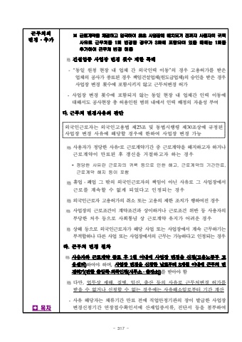- 317 %uadfc%ubb34%ucc98%uc758%ubcc0%uacbd%u2024%ucd94%uac00%uf000%ubaa9%ucc28%u203b %uadfc%ub85c%uacc4%uc57d%uc744 %uccb4%uacb0%ud558%uace0 %uc785%uad6d%ud558%uc5ec %ucd5c%ucd08 %uc0ac%uc5c5%uc7a5%uc5d0 %ubc30%uce58%ub418%uae30 %uc804%uae4c%uc9c0 %uc0ac%uc6a9%uc790%uc758 %uadc0%ucc45%uc0ac%uc720%ub85c %uadfc%ubb34%ucc98%ub97c 1%ud68c %ubcc0%uacbd%ud55c %uacbd%uc6b0%uac00 3%ud68c%uc5d0 %ud3ec%ud568%ub418%uc5b4 %uc788%uc744 %ub54c%uc5d0%ub294 1%ud68c%ub97c %ucd94%uac00%ud558%uc5ec %uadfc%ubb34%ucc98 %ubcc0%uacbd %ud5c8%uc6a9%uac74%uc124%uc5c5%uc885 %uc0ac%uc5c5%uc7a5 %ubcc0%uacbd %ud69f%uc218 %uc81c%ud55c %ud2b9%ub840-%u201c%ub3d9%uc77c %uc6d0%uccad %ud604%uc7a5 %ub0b4 %uc5c5%uccb4 %uac04 %uc678%uad6d%uc778%ub825 %uc774%ub3d9%u201d%uc758 %uacbd%uc6b0 %uace0%uc6a9%ud5c8%uac00%ub97c %ubc1b%uc740 %uc5c5%uccb4%uc758 %uacf5%uc0ac%uac00 %uc885%ub8cc%ub41c %uacbd%uc6b0 %ucc45%uc784%uac74%uc124%uc5c5%uccb4(%uc6d0%ub3c4%uae09%uc5c5%uccb4)%uc758 %uc2b9%uc778%uc744 %ubc1b%uc740 %uacbd%uc6b0%uc0ac%uc5c5%uc7a5 %ubcc0%uacbd %ud69f%uc218%uc5d0 %ud3ec%ud568%uc2dc%ud0a4%uc9c0 %uc54a%uace0 %uadfc%ubb34%ucc98%ubcc0%uacbd %ud5c8%uac00-%uc0ac%uc5c5%uc7a5 %ubcc0%uacbd %ud69f%uc218%uc5d0 %ud3ec%ud568%ub418%uc9c0 %uc54a%ub294 %ub3d9%uc77c %ud604%uc7a5 %ub0b4 %uc5c5%uccb4%uac04 %uc778%ub825 %uc774%ub3d9%uc5d0 %ub300%ud574%uc11c%ub3c4 %uacf5%uc0ac%ud604%uc7a5 %ucd1d %ud5c8%uc6a9%uc778%uc6d0 %ubc94%uc704 %ub0b4%uc5d0%uc11c %uc778%ub825 %ubc30%uc815%uc758 %uc790%uc728%uc131 %ubd80%uc5ec%ub2e4.%uadfc%ubb34%ucc98 %ubcc0%uacbd%uc0ac%uc720%uc758 %ud310%ub2e8%uc678%uad6d%uc778%uadfc%ub85c%uc790%ub294 %uc678%uad6d%uc778%uace0%uc6a9%ubc95 %uc81c25%uc870 %ubc0f %ub3d9%ubc95%uc2dc%ud589%ub839 %uc81c30%uc870%uc0c1%uc5d0 %uaddc%uc815%ub41c %uc0ac%uc5c5%uc7a5 %ubcc0%uacbd %uc0ac%uc720%uc5d0 %ud574%ub2f9%ud560 %uacbd%uc6b0%uc5d0 %ud55c%ud558%uc5ec %uc0ac%uc5c5%uc7a5 %ubcc0%uacbd %uac00%ub2a5%uc0ac%uc6a9%uc790%uac00 %uc815%ub2f9%ud55c %uc0ac%uc720*%ub85c %uadfc%ub85c%uacc4%uc57d%uae30%uac04 %uc911 %uadfc%ub85c%uacc4%uc57d%uc744 %ud574%uc9c0%ud558%uace0%uc790 %ud558%uac70%ub098%uadfc%ub85c%uacc4%uc57d%uc774 %ub9cc%ub8cc%ub41c %ud6c4 %uac31%uc2e0%uc744 %uac70%uc808%ud558%uace0%uc790 %ud558%ub294 %uacbd%uc6b0* %uc815%ub2f9%ud55c %uc0ac%uc720%ub780 %uadfc%ub85c%uc790%uc758 %uadc0%ucc45 %ub4f1%uc73c%ub85c %uc778%ud55c %ud574%uace0, %uadfc%ub85c%uacc4%uc57d%uc758 %uae30%uac04%ub9cc%ub8cc,%uadfc%ub85c%uacc4%uc57d %ud574%uc9c0 %ub4f1%uc774 %ud3ec%ud568%ud734%uc5c5%u2024%ud3d0%uc5c5 %uadf8 %ubc16%uc758 %uc678%uad6d%uc778%uadfc%ub85c%uc790%uc758 %ucc45%uc784%uc774 %uc544%ub2cc %uc0ac%uc720%ub85c %uadf8 %uc0ac%uc5c5%uc7a5%uc5d0%uc11c%uadfc%ub85c%ub97c %uacc4%uc18d%ud560 %uc218 %uc5c6%uac8c %ub418%uc5c8%ub2e4%uace0 %uc778%uc815%ub418%ub294 %uacbd%uc6b0%uc678%uad6d%uc778%uadfc%ub85c%uc790 %uace0%uc6a9%ud5c8%uac00%uc758 %ucde8%uc18c %ub610%ub294 %uace0%uc6a9%uc758 %uc81c%ud55c %uc870%uce58%uac00 %ud589%ud558%uc5ec%uc9c4 %uacbd%uc6b0%uc0ac%uc5c5%uc7a5%uc758 %uadfc%ub85c%uc870%uac74%uc774 %uacc4%uc57d%uc870%uac74%uacfc %uc0c1%uc774%ud558%uac70%ub098 %uadfc%ub85c%uc870%uac74 %uc704%ubc18 %ub4f1 %uc0ac%uc6a9%uc790%uc758%ubd80%ub2f9%ud55c %ucc98%uc6b0 %ub4f1%uc73c%ub85c %uc0ac%ud68c%ud1b5%ub150 %uc0c1 %uadfc%ub85c%uacc4%uc57d %uc720%uc9c0%uac00 %uc5b4%ub824%uc6b4 %uacbd%uc6b0%uc0c1%ud574 %ub4f1%uc73c%ub85c %uc678%uad6d%uc778%uadfc%ub85c%uc790%uac00 %ud574%ub2f9 %uc0ac%uc5c5 %ub610%ub294 %uc0ac%uc5c5%uc7a5%uc5d0%uc11c %uacc4%uc18d %uadfc%ubb34%ud558%uae30%ub294 %ubd80%uc801%ud569%ud558%ub098 %ub2e4%ub978 %uc0ac%uc5c5 %ub610%ub294 %uc0ac%uc5c5%uc7a5%uc5d0%uc11c%uc758 %uadfc%ubb34%ub294 %uac00%ub2a5%ud558%ub2e4%uace0 %uc778%uc815%ub418%ub294 %uacbd%uc6b0%ub77c.%uadfc%ubb34%ucc98 %ubcc0%uacbd %uc808%ucc28%uc0ac%uc6a9%uc790%uc640 %uadfc%ub85c%uacc4%uc57d %uc885%ub8cc %ud6c4 1%uc6d4 %uc774%ub0b4%uc5d0 %uc0ac%uc5c5%uc7a5 %ubcc0%uacbd%uc744 %uc2e0%uccad(%uace0%uc6a9%ub178%ub3d9%ubd80 %uace0%uc6a9%uc13c%ud130)%ud558%uc5ec%uc57c %ud558%uba70,%uc0ac%uc5c5%uc7a5 %ubcc0%uacbd%uc744 %uc2e0%uccad%ud55c %ub0a0%ub85c%ubd80%ud130 3%uac1c%uc6d4 %uc774%ub0b4%uc5d0 %uadfc%ubb34%ucc98%ubcc0%uacbd%ud5c8%uac00(%uad00%ud560 %ucd9c%uc785%uad6d%u00b7%uc678%uad6d%uc778%uccad(%uc0ac%ubb34%uc18c%u318d%ucd9c%uc7a5%uc18c))%ub97c %ubc1b%uc544%uc57c %ud568%ub2e4%ub9cc,%uc5c5%ubb34%uc0c1 %uc7ac%ud574,%uc9c8%ubcd1,%uc784%uc2e0,%ucd9c%uc0b0 %ub4f1%uc758 %uc0ac%uc720%ub85c %uadfc%ubb34%ucc98%ubcc0%uacbd %ud5c8%uac00%ub97c %ubc1b%uc744 %uc218 %uc5c6%uac70%ub098 %uc2e0%uccad%ud560 %uc218 %uc5c6%ub294 %uacbd%uc6b0%uc5d0%ub294 %uc0ac%uc720%ud574%uc18c%uc77c%ub85c%ubd80%ud130 %uae30%uac04 %uacc4%uc0b0-%uc0ac%uc720 %ud574%ub2f9%uc790%ub294 %uccb4%ub958%uae30%uac04 %ub9cc%ub8cc %uc804%uc5d0 %uc9c1%uc5c5%uc548%uc815%uae30%uad00%uc758 %uc7a5%uc774 %ubc1c%uae09%ud55c %uc0ac%uc5c5%uc7a5%ubcc0%uacbd%uc2e0%uccad%uae30%uac04 %uc5f0%uc7a5%uc811%uc218%ud655%uc778%uc11c%uc5d0 %uc0b0%uc7ac%uc785%uc99d%uc11c%ub958,%uc9c4%ub2e8%uc11c %ub4f1%uc744 %ucca8%ubd80%ud558%uc5ec