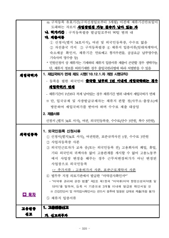 - 320 %uad6c%uc9c1%ub4f1%ub85d %uc720%ud6a8%uae30%uac04(%uad6c%uc9c1%uc2e0%uccad%uc77c%ub85c%ubd80%ud130 3%uac1c%uc6d4)%uc774%uc804%uc5d0 %uccb4%ub958%uae30%uac04%ub9cc%ub8cc%uc77c%uc774 %ub3c4%ub798%ud558%ub294 %uc790%ub85c%uc11c %uc0ac%uc5c5%uc7a5%ubcc0%uacbd %uac00%ub2a5 %ud69f%uc218%uac00 %ub0a8%uc544 %uc788%ub294 %uc790%ub098.%ud5c8%uac00%uae30%uac04:%uad6c%uc9c1%ub4f1%ub85d%ud544%uc99d %ubc1c%uae09%uc77c%ub85c%ubd80%ud130 90%uc77c %ubc94%uc704 %ub0b4%ub2e4.%uc81c%ucd9c%uc11c%ub958%u2460%uc2e0%uccad%uc11c(%ubcc4%uc9c0 34%ud638%uc11c%uc2dd),%uc5ec%uad8c %ubc0f %uc678%uad6d%uc778%ub4f1%ub85d%uc99d,%uc218%uc218%ub8cc %uc5c6%uc74c%u2461%uc790%uc9c4%ucd9c%uad6d %uac01%uc11c %u2462%uad6c%uc9c1%ub4f1%ub85d%ud544%uc99d %u2463%uccb4%ub958%uc9c0 %uc785%uc99d%uc11c%ub958(%uc784%ub300%ucc28%uacc4%uc57d%uc11c,%uc219%uc18c%uc81c%uacf5 %ud655%uc778%uc11c,%uccb4%ub958%uae30%uac04 %ub9cc%ub8cc%uc608%uace0 %ud1b5%uc9c0%uc6b0%ud3b8%ubb3c,%uacf5%uacf5%uc694%uae08 %ub0a9%ubd80%uc601%uc218%uc99d,%uae30%uc219%uc0ac%ube44 %uc601%uc218%uc99d %ub4f1)*%ubbfc%uc6d0%uc2e0%uccad%uc11c %uc0c1 %uccb4%ub958%uc9c0%ub294 %uae30%uc7ac%ud558%ub418 %uccb4%ub958%uc9c0 %uc785%uc99d%uc11c%ub958 %uc81c%ucd9c%uc774 %uace4%ub780%ud560 %uacbd%uc6b0 %uc0dd%ub7b5%uac00%ub2a5.%ub2e8,%uccb4%ub958%uc9c0 %uc815%ubcf4%ub97c %ud5c8%uc704%uae30%uc7ac%ud55c %uacbd%uc6b0 %ucd9c%uc785%uad6d%uad00%ub9ac%ubc95%uc5d0 %ub530%ub77c %ucc98%ubc8c%ubc1b%uc744 %uc218 %uc788%uc74c%uc7ac%uc785%uad6d%ud5c8%uac001. %uc7ac%uc785%uad6d%ud5c8%uac00 %uba74%uc81c %uc81c%ub3c4 %uc2dc%ud589(%u201910.12.1.%uc790 %uac1c%uc815 %uc2dc%ud589%uaddc%uce59)-%ub4f1%ub85d%uc744 %ud544%ud55c %uc678%uad6d%uc778%uc774 %ucd9c%uad6d%ud55c %ub0a0%ubd80%ud130 1%ub144 %uc774%ub0b4%uc5d0 %uc7ac%uc785%uad6d%ud558%ub824%ub294 %uacbd%uc6b0%uc7ac%uc785%uad6d%ud5c8%uac00 %uba74%uc81c-%uccb4%ub958%uae30%uac04%uc774 1%ub144%ubcf4%ub2e4 %uc801%uac8c %ub0a8%uc544%uc788%ub294 %uacbd%uc6b0 %uccb4%ub958%uae30%uac04 %ubc94%uc704 %ub0b4%uc5d0%uc11c %uc7ac%uc785%uad6d%ud5c8%uac00 %uba74%uc81c%u203b%ub2e8,%uc785%uad6d%uaddc%uc81c %ubc0f %uc0ac%uc99d%ubc1c%uae09%uaddc%uc81c%uc790%ub294 %uccb4%ub958%uc9c0 %uad00%ud560 %uccad(%uc0ac%ubb34%uc18c%u00b7%ucd9c%uc7a5%uc18c)%uc5d0 %ubc29%ubb38%ud558%uc5ec %uc7ac%uc785%uad6d%ud5c8%uac00%ub97c %ubc1b%uc544%uc57c %ud558%uba70 %uc218%uc218%ub8cc %uc81c%ucd9c %ub300%uc0c1%uc7842. %uc81c%ucd9c%uc11c%ub958%uc2e0%uccad%uc11c %ubcc4%uc9c0 %ud638 %uc11c%uc2dd%uc5ec%uad8c%uc678%uad6d%uc778%ub4f1%ub85d%uc99d%uc218%uc218%ub8cc%ub2e8%uc218 %ub9cc%uc6d0%ubcf5%uc218 %ub9cc%uc6d0%uf000%ubaa9%ucc281. %uc678%uad6d%uc778%ub4f1%ub85d %uc2e0%uccad%uc11c%ub958%u2460%uc2e0%uccad%uc11c(%ubcc4%uc9c034%ud638 %uc11c%uc2dd),%uc5ec%uad8c%uc6d0%ubcf8,%ud45c%uc900%uaddc%uaca9%uc0ac%uc9c4 1%uc7a5,%uc218%uc218%ub8cc 3%ub9cc%uc6d0%u2461%uc0ac%uc5c5%uc790%ub4f1%ub85d%uc99d %uc0ac%ubcf8%u2462%uc678%uad6d%uc778%uadfc%ub85c%uc790%uac00 %uad50%uc721 %uc911(%ub610%ub294 %uc678%uad6d%uc778%ub4f1%ub85d %uc804)%uace0%uc6a9%ud68c%uc0ac%uc758 %ud3d0%uc5c5,%ud734%uc5c5,%uae30%ud0c0 %uc678%uad6d%uc778%uc758 %uadc0%ucc45%uc0ac%uc720 %uc5c6%uc774 %uace0%uc6a9%uad00%uacc4%ub97c %uac1c%uc2dc%ud560 %uc218 %uc5c6%uc5b4 %uace0%uc6a9%ub178%ub3d9%ubd80%uc5d0%uc11c %uc0ac%uc5c5%uc7a5 %ubcc0%uacbd%uc744 %ud574%uc8fc%ub294 %uacbd%uc6b0 %uadfc%ubb34%ucc98%ubcc0%uacbd%ud5c8%uac00%uac00 %uc544%ub2cc%ubcc0%uacbd%ub41c %uc0ac%uc5c5%uc7a5%uc73c%ub85c %uc678%uad6d%uc778%ub4f1%ub85d%u261e%ucd94%uac00%uc11c%ub958 :%uace0%uc6a9%ud5c8%uac00%uc11c %uc0ac%ubcf8,%ud45c%uc900%uadfc%ub85c%uacc4%uc57d%uc11c %uc0ac%ubcf8%u2463%ubc95%ubb34%ubd80 %uc9c0%uc815 %uc758%ub8cc%uae30%uad00%uc5d0%uc11c %ubc1c%uae09%ud55c %u201c%ub9c8%uc57d%uac80%uc0ac%ud655%uc778%uc11c*%u201d*%u201c%ub9c8%uc57d%ub958%uad00%ub9ac%uc5d0%uad00%ud55c%ubc95%ub960%u201d%uc81c2%uc870%uc81c1%ud56d%uc758%u201c%ub9c8%uc57d%ub958(%ub9c8%uc57d%ud5a5%uc815%uc2e0%uc131%uc758%uc57d%ud488%ubc0f%ub300%ub9c8)%u2018%ub97c%ub9d0%ud558%uba70,%ub4f1%ub85d%uc2dc%uae30%uc900%uc73c%ub85c3%uac1c%uc6d4%uc774%ub0b4%uc5d0%ubc1c%uae09%ub41c%ud655%uc778%uc11c%uc77c%uac83%u203b%uac74%uac15%uc9c4%ub2e8%uc11c%ubc0f%ub9c8%uc57d%uac80%uc0ac%ud655%uc778%uc11c%ub294%ubc18%ub4dc%uc2dc%ubd09%ud22c%uc5d0%ubc00%ubd09%ub41c%uc0c1%ud0dc%ub85c%uc81c%ucd9c(%uac1c%ubd09%ubd88%uac00)%u2464%uccb4%ub958%uc9c0 %uc785%uc99d%uc11c%ub958%uace0%uc6a9%ubcc0%ub3d9%uc2e0%uace01. %uace0%uc6a9%ubcc0%ub3d9%uc2e0%uace0%uac00.%uc2e0%uace0%uc758%ubb34%uc790