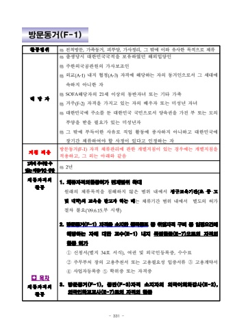 - 331 %ubc29%ubb38%ub3d9%uac70(F-1)%ud65c%ub3d9%ubc94%uc704%uce5c%ucc99%ubc29%ubb38,%uac00%uc871%ub3d9%uac70,%ud53c%ubd80%uc591,%uac00%uc0ac%uc815%ub9ac,%uadf8 %ubc16%uc5d0 %uc774%uc640 %uc720%uc0ac%ud55c %ubaa9%uc801%uc73c%ub85c %uccb4%ub958%ud574%ub2f9%uc790%ucd9c%uc0dd%ub2f9%uc2dc %ub300%ud55c%ubbfc%uad6d%uad6d%uc801%uc744 %ubcf4%uc720%ud558%uc600%ub358 %ud574%uc678%uc785%uc591%uc778%uc8fc%ud55c%uc678%uad6d%uacf5%uad00%uc6d0%uc758 %uac00%uc0ac%ubcf4%uc870%uc778%uc678%uad50(A-1)%ub0b4%uc9c0 %ud611%uc815(A-3)%uc790%uaca9%uc5d0 %ud574%ub2f9%ud558%ub294 %uc790%uc758 %ub3d9%uac70%uc778%uc73c%ub85c%uc11c %uadf8 %uc138%ub300%uc5d0%uc18d%ud558%uc9c0 %uc544%ub2c8%ud55c %uc790SOFA%ud574%ub2f9%uc790%uc758 21%uc138 %uc774%uc0c1%uc758 %ub3d9%ubc18%uc790%ub140 %ub610%ub294 %uae30%ud0c0 %uac00%uc871%uac70%uc8fc(F-2)%uc790%uaca9%uc744 %uac00%uc9c0%uace0 %uc788%ub294 %uc790%uc758 %ubc30%uc6b0%uc790 %ub610%ub294 %ubbf8%uc131%ub144 %uc790%ub140%ub300%ud55c%ubbfc%uad6d%uc5d0 %uc8fc%uc18c%ub97c %ub454 %ub300%ud55c%ubbfc%uad6d %uad6d%ubbfc%uc73c%ub85c%uc11c %uc591%uc721%uad8c%uc744 %uac00%uc9c4 %ubd80 %ub610%ub294 %ubaa8%uc758%ubd80%uc591%uc744 %ubc1b%uc744 %ud544%uc694%uac00 %uc788%ub294 %ubbf8%uc131%ub144%uc790 %uadf8 %ubc16%uc5d0 %ubd80%ub4dd%uc774%ud55c %uc0ac%uc720%ub85c %uc9c1%uc5c5 %ud65c%ub3d9%uc5d0 %uc885%uc0ac%ud558%uc9c0 %uc544%ub2c8%ud558%uace0 %ub300%ud55c%ubbfc%uad6d%uc5d0 %uc7a5%uae30%uac04 %uccb4%ub958%ud558%uc5ec%uc57c %ud560 %uc0ac%uc815%uc774 %uc788%ub2e4%uace0 %uc778%uc815%ud558%ub294 %uc790%uc9c0%uce68%uc801%uc6a9%ubc29%ubb38%ub3d9%uac70(F-1)%uc790%uaca9 %uccb4%ub958%uad00%ub9ac%uc5d0 %uad00%ud55c %uac1c%ubcc4%uc9c0%uce68%uc774 %uc788%ub294 %uacbd%uc6b0%uc5d0%ub294 %uac1c%ubcc4%uc9c0%uce68%uc744%uc801%uc6a9%ud558%uace0,%uadf8 %uc678%ub294 %uc544%ub798%uc640 %uac19%uc74c1%ud68c%uc5d0%ubd80%uc5ec%ud560%uc218%uc788%ub294%uccb4%ub958%uae30%uac04%uc0c1%ud55c%ub144%uccb4%ub958%uc790%uaca9%uc678%ud65c%ub3d9%uf000%ubaa9%ucc28%uccb4%ub958%uc790%uaca9%uc678%ud65c%ub3d91. %uccb4%ub958%uc790%uaca9%uc678%ud65c%ub3d9%ud5c8%uac00 %uba74%uc81c%ubc94%uc704 %ud655%ub300%uc6d0%ub798%uc758 %uccb4%ub958%ubaa9%uc801%uc744 %uce68%ud574%ud558%uc9c0 %uc54a%uc740 %ubc94%uc704 %ub0b4%uc5d0%uc11c %uc815%uaddc%uad50%uc721%uae30%uad00(%ucd08%u2027%uc911%u2027%uace0 %ubc0f %ub300%ud559)%uc758 %uad50%uc721%uc744 %ubc1b%uace0%uc790 %ud558%ub294 %ub54c%ub294 %uccb4%ub958%uae30%uac04 %ubc94%uc704 %ub0b4%uc5d0%uc11c %ubcc4%ub3c4%uc758 %ud5c8%uac00 %uc808%ucc28 %ubd88%uc694(%u201809.6.15.%ubd80 %uc2dc%ud589)2. %ubc29%ubb38%ub3d9%uac70(F-1) %uc790%uaca9%uc744 %uc18c%uc9c0%ud55c %uc911%uad6d%ub3d9%ud3ec %uc911 %ucde8%uc5c5%uc790%uaca9 %uad6c%ube44 %ub4f1 %uc77c%uc815%uc694%uac74%uc5d0 %ud574%ub2f9%ud558%ub294 %uc790%uc5d0 %ub300%ud55c %uad50%uc218(E-1) %ub0b4%uc9c0 %ud2b9%uc815%ud65c%ub3d9(E-7)%uc73c%ub85c%uc758 %uc790%uaca9%uc678 %ud65c%ub3d9 %ud5c8%uac00 %u2460%uc2e0%uccad%uc11c(%ubcc4%uc9c0 34%ud638 %uc11c%uc2dd),%uc5ec%uad8c %ubc0f %uc678%uad6d%uc778%ub4f1%ub85d%uc99d,%uc218%uc218%ub8cc%u2461%uc8fc%ubb34%ubd80%ucc98 %uc7a5%uc758 %uace0%uc6a9%ucd94%ucc9c%uc11c %ub610%ub294 %uace0%uc6a9%ud544%uc694%uc131 %uc785%uc99d%uc11c%ub958 %u2462%uace0%uc6a9%uacc4%uc57d%uc11c %u2463%uc0ac%uc5c5%uc790%ub4f1%ub85d%uc99d %u2464%ud559%uc704%uc99d %ub610%ub294 %uc790%uaca9%uc99d3. %ubc29%ubb38%ub3d9%uac70(F-1), %ub3d9%ubc18(F-3)%uc790%uaca9 %uc18c%uc9c0%uc790%uc758 %uc678%uad6d%uc5b4%ud68c%ud654%uac15%uc0ac(E-2), %uc678%uad6d%uc778%ud559%uad50%uad50%uc0ac(E-7)%ub85c%uc758 %uc790%uaca9%uc678 %ud65c%ub3d9