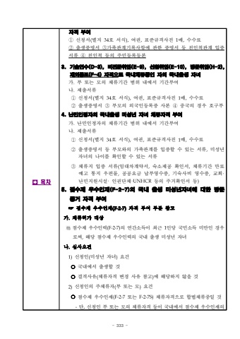 - 333 %uf000%uc790%uaca9 %ubd80%uc5ec%u2460%uc2e0%uccad%uc11c(%ubcc4%uc9c0 34%ud638 %uc11c%uc2dd),%uc5ec%uad8c,%ud45c%uc900%uaddc%uaca9%uc0ac%uc9c4 1%ub9e4,%uc218%uc218%ub8cc%u2461%ucd9c%uc0dd%uc99d%uba85%uc11c %u2462%uac00%uc871%uad00%uacc4%uae30%ub85d%uc0ac%ud56d%uc5d0 %uad00%ud55c %uc99d%uba85%uc11c %ub4f1 %uce5c%uc778%ucc99%uad00%uacc4 %uc785%uc99d%uc11c%ub958 %u2463%uce5c%uc778%ucc99 %ub4f1%uc758 %uc8fc%ubbfc%ub4f1%ub85d%ub4f1%ubcf83. %uae30%uc220%uc5f0%uc218(D-3), %ube44%uc804%ubb38%ucde8%uc5c5(E-9), %uc120%uc6d0%ucde8%uc5c5(E-10), %ubc29%ubb38%ucde8%uc5c5(H-2), %uc7ac%uc678%ub3d9%ud3ec(F-4) %uc790%uaca9%uc73c%ub85c %uad6d%ub0b4%uccb4%ub958%uc911%uc778 %uc790%uc758 %uad6d%ub0b4%ucd9c%uc0dd %uc790%ub140 %uac00.%ubd80 %ub610%ub294 %ubaa8%uc758 %uccb4%ub958%uae30%uac04 %ubc94%uc704 %ub0b4%uc5d0%uc11c %uae30%uac04%ubd80%uc5ec%ub098.%uc81c%ucd9c%uc11c%ub958%u2460%uc2e0%uccad%uc11c(%ubcc4%uc9c0 34%ud638 %uc11c%uc2dd),%uc5ec%uad8c,%ud45c%uc900%uaddc%uaca9%uc0ac%uc9c4 1%ub9e4,%uc218%uc218%ub8cc%u2461%ucd9c%uc0dd%uc99d%uba85%uc11c %u2462%ubd80%ubaa8%uc758 %uc678%uad6d%uc778%ub4f1%ub85d%uc99d %uc0ac%ubcf8 %u2463%uc911%uad6d%uc758 %uacbd%uc6b0 %ud638%uad6c%ubd804. %ub09c%ubbfc%uc778%uc815%uc790%uc758 %uad6d%ub0b4%ucd9c%uc0dd %ubbf8%uc131%ub144 %uc790%ub140 %uccb4%ub958%uc790%uaca9 %ubd80%uc5ec%uac00.%ub09c%ubbfc%uc778%uc815%uc790%uc758 %uccb4%ub958%uae30%uac04 %ubc94%uc704 %ub0b4%uc5d0%uc11c %uae30%uac04%ubd80%uc5ec%ub098.%uc81c%ucd9c%uc11c%ub958%u2460%uc2e0%uccad%uc11c(%ubcc4%uc9c0 34%ud638 %uc11c%uc2dd),%uc5ec%uad8c,%ud45c%uc900%uaddc%uaca9%uc0ac%uc9c4 1%ub9e4,%uc218%uc218%ub8cc%u2461%ucd9c%uc0dd%uc99d%uba85%uc11c %ub4f1 %ubd80%ubaa8%uc640%uc758 %uac00%uc871%uad00%uacc4%ub97c %uc785%uc99d%ud560 %uc218 %uc788%ub294 %uc11c%ub958,%ubbf8%uc131%ub144 %uc790%ub140%uc758 %ub098%uc774%ub97c %ud655%uc778%ud560 %uc218 %uc788%ub294 %uc11c%ub958 %u2462%uccb4%ub958%uc9c0 %uc785%uc99d %uc11c%ub958(%uc784%ub300%ucc28%uacc4%uc57d%uc11c,%uc219%uc18c%uc81c%uacf5 %ud655%uc778%uc11c,%uccb4%ub958%uae30%uac04 %ub9cc%ub8cc%uc608%uace0 %ud1b5%uc9c0 %uc6b0%ud3b8%ubb3c,%uacf5%uacf5%uc694%uae08 %ub0a9%ubd80%uc601%uc218%uc99d,%uae30%uc219%uc0ac%ube44 %uc601%uc218%uc99d,%uad50%ud68c%ub09c%ubbfc%uc9c0%uc6d0%uc2dc%uc124%u00b7%uc778%uad8c%ub2e8%uccb4%u00b7UNHCR%ub4f1%uc758 %uc8fc%uac70%ud655%uc778%uc11c %ub4f1)5. %uc810%uc218%uc81c %uc6b0%uc218%uc778%uc7ac(F-2-7)%uc758 %uad6d%ub0b4 %ucd9c%uc0dd %ubbf8%uc131%ub144%uc790%ub140%uc5d0 %ub300%ud55c %ubc29%ubb38%ub3d9%uac70 %uc790%uaca9 %ubd80%uc5ec%u261e%uc810%uc218%uc81c %uc6b0%uc218%uc778%uc81c(F-2-7)%uc790%uaca9 %ubd80%uc5ec %ubd80%ubd84 %ucc38%uace0%uac00.%uccb4%ub958%ud5c8%uac00 %ub300%uc0c1%uc810%uc218%uc81c %uc6b0%uc218%uc778%ub825(F-2-7)%uc758 %uc5f0%uac04%uc18c%ub4dd%uc774 %ucd5c%uadfc 1%uc778%ub2f9 %uad6d%ubbfc%uc18c%ub4dd %ubbf8%ub9cc%uc778 %uacbd%uc6b0%ub85c%uc368,%ud574%ub2f9 %uc810%uc218%uc81c %uc6b0%uc218%uc778%ub825%uc758 %uad6d%ub0b4 %ucd9c%uc0dd %ubbf8%uc131%ub144 %uc790%ub140%ub098.%uc2ec%uc0ac%uc694%uac741)%uc2e0%uccad%uc778(%ubbf8%uc131%ub144 %uc790%ub140)%uc694%uac74 %u3007%uad6d%ub0b4%uc5d0%uc11c %ucd9c%uc0dd%ud560 %uac83%u3007%uacb0%uaca9%uc0ac%uc720(%uccb4%ub958%uc790%uaca9 %ubcc0%uacbd %uc0ac%uc720 %ucc38%uace0)%uc5d0 %ud574%ub2f9%ud558%uc9c0 %uc54a%uc744 %uac832)%uc2e0%uccad%uc778%uc758 %uc8fc%uccb4%ub958%uc790(%ubd80 %ub610%ub294 %ubaa8)%uc694%uac74 %u3007%uc810%uc218%uc81c %uc6b0%uc218%uc778%uc7ac(F-2-7%ub610%ub294 F-2-7S)%uccb4%ub958%uc790%uaca9%uc73c%ub85c %ud569%ubc95%uccb4%ub958%uc911%uc77c %uac83-%ub2e8,%uc2e0%uccad%uc778 %ubd80 %ub610%ub294 %ubaa8%uc758 %uccb4%ub958%uc790%uaca9 %ub4f1%uc774 %uad6d%ub0b4%uc5d0%uc11c %uc810%uc218%uc81c %uc6b0%uc218%uc778%uc7ac%uc758