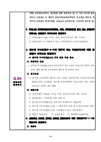 - 336 %uf000%uccb4%ub958%uc790%uaca9%ubcc0%uacbd%ud5c8%uac00%ub300%ud55c %uc18c%uba85%uc790%ub8cc(%uc0ac%uc720%uc11c,%uc7ac%uc0b0%ubd84%ud560 %uad00%ub828 %uc785%uc99d%uc790%ub8cc %ub4f1)%u2464%uae30%ud0c0 %uc2ec%uc0ac%uc5d0 %ud544%uc694%ud558%ub2e4%uace0 %uc778%uc815%ub418%ub294 %u2465%uccb4%ub958%uc9c0 %uc785%uc99d%uc11c%ub958(%uc784%ub300%ucc28%uacc4%uc57d%uc11c,%uc219%uc18c%uc81c%uacf5 %ud655%uc778%uc11c,%uccb4%ub958%uae30%uac04 %ub9cc%ub8cc%uc608%uace0 %ud1b5%uc9c0%uc6b0%ud3b8%ubb3c,%uacf5%uacf5%uc694%uae08 %ub0a9%ubd80%uc601%uc218%uc99d,%uae30%uc219%uc0ac%ube44 %uc601%uc218%uc99d %ub4f1)3. %uc6b0%ub9ac%ub098%ub77c %uad6d%uc801%ucde8%ub4dd%uc808%ucc28(%uad6d%uc801%ud68c%ubcf5, %uadc0%ud654, %uad6d%uc801%ud310%uc815)%ub97c %ubc1f%uace0 %uc788%ub294 %uc678%uad6d%uc778%uc5d0 %ub300%ud574%uc11c%ub294 %ubc29%ubb38%ub3d9%uac70 %uc790%uaca9%uc73c%ub85c%uc758 %ubcc0%uacbd%ud5c8%uac00%u2460%uc2e0%uccad%uc11c(%ubcc4%uc9c0 34%ud638 %uc11c%uc2dd),%uc5ec%uad8c,%ud45c%uc900%uaddc%uaca9%uc0ac%uc9c4 1%ub9e4,%uc218%uc218%ub8cc%u2461%uc2e0%uc6d0%ubcf4%uc99d%uc11c %u2462%uadc0%ud654%ud5c8%uac00 %ub610%ub294 %uad6d%uc801%ud68c%ubcf5%ud5c8%uac00 %uc2e0%uccad%uc0ac%uc2e4%uc99d%uba85%uc11c4. %uc810%uc218%uc81c %uc6b0%uc218%uc778%uc7ac(F-2-7)%uc758 %ubc30%uc6b0%uc790 %ub610%ub294 %ubbf8%uc131%ub144%uc790%ub140%uc5d0 %ub300%ud55c %ubc29%ubb38%ub3d9%uac70 %uc790%uaca9%uc73c%ub85c %ubcc0%uacbd%ud5c8%uac00%u261e%uc810%uc218%uc81c %uc6b0%uc218%uc778%uc81c(F-2-7)%uc790%uaca9 %ubcc0%uacbd %ubd80%ubd84 %ucc38%uace0%uac00.%uccb4%ub958%ud5c8%uac00 %ub300%uc0c1%u3147 %uc810%uc218%uc81c %uc6b0%uc218%uc778%uc7ac(F-2-7)%uc758 %uc5f0%uac04%uc18c%ub4dd%uc774 %ucd5c%uadfc 1%uc778%ub2f9 %uad6d%ubbfc%uc18c%ub4dd %ubbf8%ub9cc%uc778 %uacbd%uc6b0%ub85c%uc368,%ud574%ub2f9 %uc810%uc218%uc81c %uc6b0%uc218%uc778%ub825%uc758 %ubc30%uc6b0%uc790 %ubc0f %ubbf8%uc131%ub144 %uc790%ub140%ub098.%uc2ec%uc0ac%uc694%uac74%u3147 %u2018%uc810%uc218%uc81c %uc6b0%uc218%uc778%uc7ac%uc758 %ubc30%uc6b0%uc790 %ub610%ub294 %ubbf8%uc131%ub144 %uc790%ub140%u2019%ub85c%uc11c%uc758 %uac70%uc8fc(F-2-71)%uc790%uaca9 %ubcc0%uacbd%uc5d0 %ub530%ub77c %uc2ec%uc0ac%ud558%ub418,%uc810%uc218%uc81c %uc6b0%uc218%uc778%uc7ac%uc790%uc758 %uc5f0%uac04%uc18c%ub4dd%uc774 %ucd5c%uadfc 1%uc778%ub2f9 %uad6d%ubbfc%uc18c%ub4dd %ubbf8%ub9cc%uc778 %uacbd%uc6b0 %ud574%ub2f9%ub2e4.%uc81c%ucd9c%uc11c%ub958%u2460%uc2e0%uccad%uc11c(%ubcc4%uc9c0 %uc81c34%ud638 %uc11c%uc2dd),%uc5ec%uad8c,%ud45c%uc900%uaddc%uaca9%uc0ac%uc9c4 1%ub9e4,%uc218%uc218%ub8cc%u2461%ucd9c%uc0dd%uc99d%uba85%uc11c,%uac00%uc871%uad00%uacc4 %uc18c%uba85 %uc11c%ub958 %ub4f1%u2462%uc810%uc218%uc81c %uc6b0%uc218%uc778%uc7ac(F-2-7)%uac70%uc8fc%uc790%uaca9 %ubd80%uc5ec%ud5c8%uac00%uc2dc %uc81c%ucd9c%uc11c%ub958%u2463%uc810%uc218%uc81c %uc6b0%uc218%uc778%uc7ac(F-2-7)%uc640 %uadf8 %ubc30%uc6b0%uc790%uc758 %uc5ec%uad8c %ubc0f %uc678%uad6d%uc778%ub4f1%ub85d%uc99d %uc0ac%ubcf8%u2464%uc810%uc218%uc81c %uc6b0%uc218%uc778%uc7ac(F-2-7)%uc758 %uace0%uc6a9%uacc4%uc57d%uc11c %ub610%ub294 %uc7ac%uc9c1%uc99d%uba85%uc11c%u2465%uccb4%ub958%uc9c0 %uc785%uc99d%uc11c%ub958 %u2466%uc2e0%uc6d0%ubcf4%uc99d%uc11c %u2467%uacb0%ud575%ud655%uc778%uc11c(%ud574%ub2f9%uc790)5. %uace0%ub4f1%ud559%uad50 %uc774%ud558%uc758 %uc678%uad6d%uc778 %uc720%ud559%uc0dd %ub3d9%ubc18%ubd80%ubaa8%uc5d0 %ub300%ud55c %ubc29%ubb38%ub3d9%uac70(F-1-13) %uccb4%ub958%uc790%uaca9 %ubcc0%uacbd%ud5c8%uac00 %uac00.%ud574%ub2f9%uc790