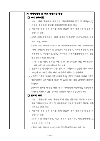 - 344 %uac00.%uc678%uad6d%uc778%ub4f1%ub85d %ubc0f %ucd5c%ucd08 %uccb4%ub958%uae30%uac04 %uc5f0%uc7a5%u25a1%uc790%ub140 %uc591%uc721%uc9c0%uc6d0%u25cb%ub300%uc0c1 :%uc790%ub140 %uc591%uc721%uc9c0%uc6d0 %ubaa9%uc801%uc73c%ub85c %u2018%uacb0%ud63c%uc774%ubbfc%uc790%uc758 %ubd80%ubaa8 %ub4f1 %uac00%uc871(F-1-5)%u2019%uc0ac%uc99d%uc744 %ubc1c%uae09%ubc1b%uace0 %uc785%uad6d%ud55c %uacb0%ud63c%uc774%ubbfc%uc790%uc758 %ubcf8%uad6d %uac00%uc871%u25cb%uc81c%ucd9c%uc11c%ub958(%uccad%uc7a5 %ub4f1%uc740 %uc2ec%uc0ac%ub97c %uc704%ud574 %ud544%uc694%ud55c %uacbd%uc6b0 %uc81c%ucd9c%uc11c%ub958 %uc77c%ubd80%ub97c %uac00%uac10%ud560 %uc218 %uc788%uc74c)-(%uae30%ubcf8 %uc11c%ub958)%ud1b5%ud569%uc2e0%uccad%uc11c,%uc5ec%uad8c,%uccb4%ub958%uc9c0 %uc785%uc99d%uc11c%ub958*,%ube44%ucde8%uc5c5%uc11c%uc57d%uc11c,%ud45c%uc900%uaddc%uaca9 %uc0ac%uc9c4,%uc218%uc218%ub8cc*%ucd08%uccad%uc778%ub610%ub294%uc591%uc721%uc9c0%uc6d0%ub300%uc0c1%uc778%uc790%ub140%uc758%uc8fc%ubbfc%ub4f1%ub85d%ud45c(%ub4f1%ubcf8)%uc73c%ub85c%ub300%uccb4%uac00%ub2a5(%uc774%ud558%ub3d9%uc77c)-(%uad6d%ub0b4 %uac00%uc871%uad00%uacc4 %uc99d%uba85%uc11c%ub958)%ucd08%uccad%uc778%uc758 %uae30%ubcf8%uc99d%uba85%uc11c,%uac00%uc871%uad00%uacc4%uc99d%uba85%uc11c,%ud63c%uc778%uad00%uacc4%uc99d%uba85%uc11c,%uc8fc%ubbfc%ub4f1%ub85d%ud45c(%ub4f1%ubcf8),%uc790%ub140%uba85%uc758 %uac00%uc871%uad00%uacc4%uc99d%uba85%uc11c(%uc784%uc2e0%ud55c %uacbd%uc6b0 %uc784%uc2e0%uc9c4%ub2e8%uc11c %ub610%ub294 %uc0b0%ubaa8%uc218%ucca9)%u203b%uc790%ub140%uac002%uba85%uc774%uc0c1%uc77c%uacbd%uc6b0%uc5d0%ub294%ubaa8%ub4e0%uc790%ub140%uc758%uac00%uc871%uad00%uacc4%uc99d%uba85%uc11c%uc81c%ucd9c,%uc790%ub140%uac00%uc591%uc790%uc758%uacbd%uc6b0%ucd08%uccad%uc778%uc758%uc785%uc591%uad00%uacc4%uc99d%uba85%uc11c%ucd94%uac00%uc81c%ucd9c%u25cb%uc5f0%uc7a5%ud5c8%uac00 :%u2018%uc785%uad6d%uc77c%ub85c%ubd80%ud130 1%ub144%u2019%ubc94%uc704 %ub0b4 %uc790%ub140(%uc790%ub140%uac00 2%uba85%uc778 %uacbd%uc6b0 %ub9c8%uc9c0%ub9c9 %uc790%ub140)%uac00 %ub9cc 10%uc138%uac00 %ub418%ub294 %ud574%uc758 3%uc6d4%ub9d0%uae4c%uc9c0 %uccb4%ub958%uae30%uac04 %uc5f0%uc7a5%ud5c8%uac00-(%u2018%ud55c%ubd80%ubaa8 %uac00%uc871%u2019%uacfc %u2018%ub2e4%uc790%ub140 %uac00%uc871%u2019%uc5d0 %ub300%ud55c %ud2b9%ub840)%u2018%ud55c%ubd80%ubaa8 %uac00%uc871%u2019%uacfc %u2018%ub2e4%uc790%ub140 %uac00%uc871%u2019%uc740 %u2018%uc785%uad6d%uc77c%ub85c%ubd80%ud130 1%ub144%u2019%ubc94%uc704 %ub0b4 %uc790%ub140%uac00 %ub9cc 13%uc138%uac00 %ub418%ub294 %ud574%uc758 3%uc6d4%ub9d0%uae4c%uc9c0 %uccb4%ub958%uae30%uac04 %uc5f0%uc7a5%ud5c8%uac00-(%ucde8%ud559%uc758%ubb34 %ubd88%uc774%ud589 %uc2dc %uc5f0%uc7a5 %uc81c%ud55c)%uc790%ub140%uac00 %ucde8%ud559%uc5f0%ub839%uc5d0 %ud574%ub2f9%ud558%uc9c0%ub9cc,%ucd08%uccad%uc778%uc774 %ucde8%ud559%uc758%ubb34%ub97c %uc774%ud589%ud558%uc9c0 %uc54a%uc744 %uacbd%uc6b0%uc5d0%ub294 %uc2e0%uccad%uc778%uc758 %uccb4%ub958%uae30%uac04 %uc5f0%uc7a5%ud5c8%uac00 %uc81c%ud55c%u25a1%uc778%ub3c4%uc801 %uc0ac%uc815%u25cb%ub300%uc0c1 :%u2018%uc911%uc99d%uc9c8%ud658%u2019%ub610%ub294 %u2018%uc911%uc99d%uc7a5%uc560%u2019%uac00 %uc788%ub294 %uacb0%ud63c%uc774%ubbfc %uac00%uc815%uc744 %uc9c0%uc6d0%ud558%uae30 %uc704%ud574 %u2018%uacb0%ud63c%uc774%ubbfc%uc790%uc758 %ubd80%ubaa8 %ub4f1 %uac00%uc871(F-1-5)%u2019%uc0ac%uc99d%uc744 %ubc1c%uae09%ubc1b%uace0 %uc785%uad6d%ud55c %uacb0%ud63c%uc774%ubbfc%uc790%uc758 %ubcf8%uad6d %uac00%uc871%u25cb%uc81c%ucd9c%uc11c%ub958(%uccad%uc7a5 %ub4f1%uc740 %uc2ec%uc0ac%ub97c %uc704%ud574 %ud544%uc694%ud55c %uacbd%uc6b0 %uc81c%ucd9c%uc11c%ub958 %uc77c%ubd80%ub97c %uac00%uac10%ud560 %uc218 %uc788%uc74c)-(%uae30%ubcf8 %uc11c%ub958)%ud1b5%ud569%uc2e0%uccad%uc11c,%uc5ec%uad8c,%uccb4%ub958%uc9c0 %uc785%uc99d%uc11c%ub958*,%ube44%ucde8%uc5c5%uc11c%uc57d%uc11c,%ud45c%uc900%uaddc%uaca9 %uc0ac%uc9c4,%uc218%uc218%ub8cc*%ucd08%uccad%uc778%ub610%ub294%uc591%uc721%uc9c0%uc6d0%ub300%uc0c1%uc778%uc790%ub140%uc758%uc8fc%ubbfc%ub4f1%ub85d%ud45c(%ub4f1%ubcf8)%uc73c%ub85c%ub300%uccb4%uac00%ub2a5