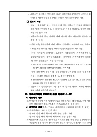 - 346 -(%ucde8%ud559%uc758%ubb34 %ubd88%uc774%ud589 %uc2dc %uc5f0%uc7a5 %uc81c%ud55c)%uc790%ub140%uac00 %ucde8%ud559%uc5f0%ub839%uc5d0 %ud574%ub2f9%ud558%uc9c0%ub9cc,%ucd08%uccad%uc778%uc774 %ucde8%ud559%uc758%ubb34%ub97c %uc774%ud589%ud558%uc9c0 %uc54a%uc744 %uacbd%uc6b0%uc5d0%ub294 %uc2e0%uccad%uc778%uc758 %uccb4%ub958%uae30%uac04 %uc5f0%uc7a5%ud5c8%uac00 %uc81c%ud55c%u25a1%uc778%ub3c4%uc801 %uc0ac%uc815%u25cb%ub300%uc0c1 :%u2018%uc911%uc99d%uc9c8%ud658%u2019%ub610%ub294 %u2018%uc911%uc99d%uc7a5%uc560%u2019%uac00 %uc788%ub294 %uacb0%ud63c%uc774%ubbfc %uac00%uc815%uc744 %uc9c0%uc6d0%ud558%uae30 %uc704%ud574 %u2018%uacb0%ud63c%uc774%ubbfc%uc790%uc758 %ubd80%ubaa8 %ub4f1 %uac00%uc871(F-1-5)%u2019%uc0ac%uc99d%uc744 %ubc1c%uae09%ubc1b%uace0 %uc785%uad6d%ud55c %uacb0%ud63c%uc774%ubbfc%uc790%uc758 %ubcf8%uad6d %uac00%uc871%u25cb%uc81c%ucd9c%uc11c%ub958(%uccad%uc7a5 %ub4f1%uc740 %uc2ec%uc0ac%ub97c %uc704%ud574 %ud544%uc694%ud55c %uacbd%uc6b0 %uc81c%ucd9c%uc11c%ub958 %uc77c%ubd80%ub97c %uac00%uac10%ud560 %uc218 %uc788%uc74c)-(%uae30%ubcf8 %uc11c%ub958)%ud1b5%ud569%uc2e0%uccad%uc11c,%uc5ec%uad8c,%uccb4%ub958%uc9c0 %uc785%uc99d%uc11c%ub958*,%ud45c%uc900%uaddc%uaca9 %uc0ac%uc9c4,%uc218%uc218%ub8cc*%ucd08%uccad%uc778%ub610%ub294%uc591%uc721%uc9c0%uc6d0%ub300%uc0c1%uc778%uc790%ub140%uc758%uc8fc%ubbfc%ub4f1%ub85d%ud45c(%ub4f1%ubcf8)%uc73c%ub85c%ub300%uccb4%uac00%ub2a5-(%uad6d%ub0b4 %uac00%uc871%uad00%uacc4 %uc99d%uba85%uc11c%ub958)%ucd08%uccad%uc778%uc758 %uae30%ubcf8%uc99d%uba85%uc11c,%uac00%uc871%uad00%uacc4%uc99d%uba85%uc11c,%ud63c%uc778%uad00%uacc4%uc99d%uba85%uc11c,%uc8fc%ubbfc%ub4f1%ub85d%ud45c(%ub4f1%ubcf8),%uc790%ub140%uba85%uc758 %uac00%uc871%uad00%uacc4%uc99d%uba85%uc11c(%uc784%uc2e0%ud55c %uacbd%uc6b0 %uc784%uc2e0%uc9c4%ub2e8%uc11c %ub610%ub294 %uc0b0%ubaa8%uc218%ucca9)%u203b%uc790%ub140%uac002%uba85%uc774%uc0c1%uc77c%uacbd%uc6b0%uc5d0%ub294%ubaa8%ub4e0%uc790%ub140%uc758%uac00%uc871%uad00%uacc4%uc99d%uba85%uc11c%uc81c%ucd9c,%uc790%ub140%uac00%uce5c%uc591%uc790%uc758%uacbd%uc6b0%ucd08%uccad%uc778%uc758%uce5c%uc591%uc790%uc785%uc591%uad00%uacc4%uc99d%uba85%uc11c%ucd94%uac00%uc81c%ucd9c%uc911%uc99d %uc9c8%ud658%uff65%uc7a5%uc560 %uc99d%uba85%uc11c%ub958)%u2018%uc911%uc99d%uc9c8%ud658(%uc911%uc99d%ub09c%uce58%uc9c8%ud658%ub610%ub294 %uc0b0%uc815%ud2b9%ub840%uc0ac%uc2e4%uc774 %uae30%uc7ac%ub41c %uc9c4%ub8cc%ube44 %uc601%uc218%uc99d %ub4f1,%uc7a5%uc560%uc778%uc99d%uba85%uc11c %ub4f1%u203b%uc7a5%uc560%uc778%uc99d%uba85%uc11c%uc758%u2018%uc885%ud569%uc7a5%uc560%uc815%ub3c4%u2019%ub780%uc5d0%u2018%uc911%uc99d%uc7a5%uc560%u2019%ub610%ub294%u2018%uc7a5%uc560%uc815%ub3c4%uac00%uc2ec%ud55c%uc7a5%uc560%u2019%ub85c%uae30%uc7ac%ub418%uc5b4%uc788%uc744%uacbd%uc6b0%uc911%uc99d%uc7a5%uc560%ub85c%uc778%uc815%u25cb%uc5f0%uc7a5%ud5c8%uac00 :%u2018%uc785%uad6d%uc77c%ub85c%ubd80%ud130 3%ub144%u2019%ubc94%uc704 %ub0b4 %uc778%ub3c4%uc801 %uc0ac%uc815%uc774 %uc9c0%uc18d%ub420 %ub54c%uae4c%uc9c0 %ucd5c%ub300 1%ub144%uc529 %uccb4%ub958%uae30%uac04 %uc5f0%uc7a5%ud5c8%uac0013. %uacb0%ud63c%uc774%ubbfc%uc790%uc758 %uc804%ud63c%uad00%uacc4 %ucd9c%uc0dd %uc790%ub140(F-1-52)%uac00.%uccb4%ub958%ud5c8%uac00 %ub300%uc0c1 %ud55c%uad6d%uc778 %ubc30%uc6b0%uc790%uc5d0 %uc758%ud574 %uc785%uc591%ub418%uc9c0 %uc54a%uace0 %ubc29%ubb38%ub3d9%uac70(F-1-52)%uc790%uaca9%uc73c%ub85c %uad6d%ub0b4 %uccb4%ub958 %uc911%uc778 %uacb0%ud63c%uc774%ubbfc%uc790(F-6,F-5-2)%uc758 %uc804%ud63c(%u524d%u5a5a)%uad00%uacc4 %ucd9c%uc0dd %uc790%ub140%ub098.%uccb4%ub958%ud5c8%uac00 %uae30%uac04(%uacb0%ud63c%uc774%ubbfc%uc790%uc758 %uccb4%ub958%uae30%uac04%uc744 %ucd08%uacfc%ud558%uc5ec %ud5c8%uac00%ud560 %uc218 %uc5c6%uc74c)%ubbf8%uc131%ub144%uc790(%ub9cc 19%uc138 %ubbf8%ub9cc)%uc778 %uacbd%uc6b0-%uacf5%uad50%uc721 %uc778%uc815 %ub300%uc0c1 %ud559%uad50%uc5d0 %uc7ac%ud559 %uc911%uc778 %uacbd%uc6b0 :2%ub144-%uacf5%uad50%uc721 %uc778%uc815 %ub300%uc0c1 %ud559%uad50%uc5d0 %uc7ac%ud559%ud558%uc9c0 %uc54a%ub294 %uacbd%uc6b0 :1%ub144%ubc29%ubb38%ub3d9%uac70(F-1-52)%ub610%ub294 %uac70%uc8fc(F-2-2)%uc790%uaca9%uc73c%ub85c %ud569%ubc95 %uccb4%ub958 %uc911%uc778 %uacb0%ud63c%uc774%ubbfc%uc790%uc758 %uc804%ud63c%uad00%uacc4 %ucd9c%uc0dd %uc790%ub140(%ub9cc 19%uc138 %uc774%uc0c1%uc778 %uc131%ub144%uc790 %uacbd%uc6b0)%uac00,%ub9cc 19%uc138%uac00 %ub418%uae30 %uc804%uc5d0