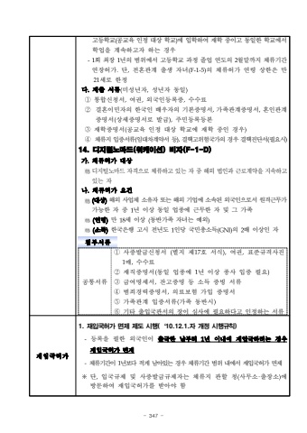 - 347 %uace0%ub4f1%ud559%uad50(%uacf5%uad50%uc721 %uc778%uc815 %ub300%uc0c1 %ud559%uad50)%uc5d0 %uc785%ud559%ud558%uc5ec %uc7ac%ud559 %uc911%uc774%uace0 %ub3d9%uc77c%ud55c %ud559%uad50%uc5d0%uc11c%ud559%uc5c5%uc744 %uacc4%uc18d%ud558%uace0%uc790 %ud558%ub294 %uacbd%uc6b0-1%ud68c %ucd5c%uc7a5 1%ub144%uc758 %ubc94%uc704%uc5d0%uc11c %uace0%ub4f1%ud559%uad50 %uacfc%uc815 %uc878%uc5c5 %uc5f0%ub3c4%uc758 2%uc6d4%ub9d0%uae4c%uc9c0 %uccb4%ub958%uae30%uac04 %uc5f0%uc7a5%ud5c8%uac00.%ub2e8,%uc804%ud63c%uad00%uacc4 %ucd9c%uc0dd %uc790%ub140(F-1-5)%uc758 %uccb4%ub958%ud5c8%uac00 %uc5f0%ub839 %uc0c1%ud55c%uc740 %ub9cc 21%uc138%ub85c %ud55c%uc815%ub2e4.%uc81c%ucd9c %uc11c%ub958(%ubbf8%uc131%ub144%uc790,%uc131%ub144%uc790 %ub3d9%uc77c)%u2460%ud1b5%ud569%uc2e0%uccad%uc11c,%uc5ec%uad8c,%uc678%uad6d%uc778%ub4f1%ub85d%uc99d,%uc218%uc218%ub8cc%u2461%uacb0%ud63c%uc774%ubbfc%uc790%uc758 %ud55c%uad6d%uc778 %ubc30%uc6b0%uc790%uc758 %uae30%ubcf8%uc99d%uba85%uc11c,%uac00%uc871%uad00%uacc4%uc99d%uba85%uc11c,%ud63c%uc778%uad00%uacc4%uc99d%uba85%uc11c(%uc0c1%uc138%uc99d%uba85%uc11c%ub85c %ubc1c%uae09),%uc8fc%ubbfc%ub4f1%ub85d%ub4f1%ubcf8%u2462%uc7ac%ud559%uc99d%uba85%uc11c(%uacf5%uad50%uc721 %uc778%uc815 %ub300%uc0c1 %ud559%uad50%uc5d0 %uc7ac%ud559 %uc911%uc778 %uacbd%uc6b0)%u2463%uccb4%ub958%uc9c0 %uc785%uc99d%uc11c%ub958(%uc784%ub300%ucc28%uacc4%uc57d%uc11c %ub4f1),%uacb0%ud575%uace0%uc704%ud5d8%uad6d%uac00%uc758 %uacbd%uc6b0 %uacb0%ud575%uc9c4%ub2e8%uc11c(%ud544%uc694%uc2dc)14. %ub514%uc9c0%ud138%ub178%ub9c8%ub4dc(%uc6cc%ucf00%uc774%uc158) %ube44%uc790(F-1-D)%uac00.%uccb4%ub958%ud5c8%uac00 %ub300%uc0c1 %ub514%uc9c0%ud138%ub178%ub9c8%ub4dc %uc790%uaca9%uc73c%ub85c %uccb4%ub958%ud558%uace0 %uc788%ub294 %uc790 %uc911 %ud574%uc678 %ubc95%uc778%uacfc %uadfc%ub85c%uacc4%uc57d%uc744 %uc9c0%uc18d%ud558%uace0 %uc788%ub294 %uc790%ub098.%uccb4%ub958%ud5c8%uac00 %uc694%uac74(%ub300%uc0c1)%ud574%uc678 %uc0ac%uc5c5%uccb4 %uc18c%uc720%uc790 %ub610%ub294 %ud574%uc678 %uae30%uc5c5%uc5d0 %uc18c%uc18d%ub41c %uc678%uad6d%uc778%uc73c%ub85c%uc11c %uc6d0%uaca9%uadfc%ubb34%uac00 %uac00%ub2a5%ud55c %uc790 %uc911 1%ub144 %uc774%uc0c1 %ub3d9%uc77c %uc5c5%uc885%uc5d0 %uadfc%ubb34%ud55c %uc790 %ubc0f %uadf8 %uac00%uc871(%uc5f0%ub839%ub9cc %uc138 %uc774%uc0c1 %ub3d9%ubc18%uac00%uc871 %uc790%ub140%ub294 %uc608%uc678(%uc18c%ub4dd)%ud55c%uad6d%uc740%ud589 %uace0%uc2dc %uc804%ub144%ub3c4 1%uc778%ub2f9 %uad6d%ubbfc%ucd1d%uc18c%ub4dd(GNI)%uc758 2%ubc30 %uc774%uc0c1%uc778 %uc790%ucca8%ubd80%uc11c%ub958%uacf5%ud1b5%uc11c%ub958%u2460%uc0ac%uc99d%ubc1c%uae09%uc2e0%uccad%uc11c (%ubcc4%uc9c0 %uc81c17%ud638 %uc11c%uc2dd),%uc5ec%uad8c,%ud45c%uc900%uaddc%uaca9%uc0ac%uc9c4 1%ub9e4,%uc218%uc218%ub8cc%u2461%uc7ac%uc9c1%uc99d%uba85%uc11c(%ub3d9%uc77c %uc5c5%uc885%uc5d0 1%ub144 %uc774%uc0c1 %uc885%uc0ac %uc785%uc99d %ud544%uc694)%u2462%uae09%uc5ec%uba85%uc138%uc11c,%uc794%uace0%uc99d%uba85 %ub4f1 %uc18c%ub4dd %uc99d%ube59 %uc11c%ub958%u2463%ubc94%uc8c4%uacbd%ub825%uc99d%uba85%uc11c,%uc758%ub8cc%ubcf4%ud5d8 %uac00%uc785 %uc99d%uba85%uc11c%u2464%uac00%uc871%uad00%uacc4 %uc785%uc99d%uc11c%ub958(%uac00%uc871 %ub3d9%ubc18%uc2dc)%u2465%uae30%ud0c0 %ucd9c%uc785%uad6d%uad00%uc11c%uc758 %uc7a5%uc774 %uc2ec%uc0ac%uc5d0 %ud544%uc694%ud558%ub2e4%uace0 %uc778%uc815%ud558%ub294 %uc11c%ub9581. %uc7ac%uc785%uad6d%ud5c8%uac00 %uba74%uc81c %uc81c%ub3c4 %uc2dc%ud589(%u201810.12.1.%uc790 %uac1c%uc815 %uc2dc%ud589%uaddc%uce59)-%ub4f1%ub85d%uc744 %ud544%ud55c %uc678%uad6d%uc778%uc774 %ucd9c%uad6d%ud55c %ub0a0%ubd80%ud130 1%ub144 %uc774%ub0b4%uc5d0 %uc7ac%uc785%uad6d%ud558%ub824%ub294%uacbd%uc6b0 %uc7ac%uc785%uad6d%ud5c8%uac00 %uba74%uc81c-%uccb4%ub958%uae30%uac04%uc774 1%ub144%ubcf4%ub2e4 %uc801%uac8c %ub0a8%uc544%uc788%ub294 %uacbd%uc6b0 %uccb4%ub958%uae30%uac04 %ubc94%uc704 %ub0b4%uc5d0%uc11c %uc7ac%uc785%uad6d%ud5c8%uac00 %uba74%uc81c%u203b%ub2e8,%uc785%uad6d%uaddc%uc81c %ubc0f %uc0ac%uc99d%ubc1c%uae09%uaddc%uc81c%uc790%ub294 %uccb4%ub958%uc9c0 %uad00%ud560 %uccad(%uc0ac%ubb34%uc18c%u00b7%ucd9c%uc7a5%uc18c)%uc5d0 %ubc29%ubb38%ud558%uc5ec %uc7ac%uc785%uad6d%ud5c8%uac00%ub97c %ubc1b%uc544%uc57c %ud568
