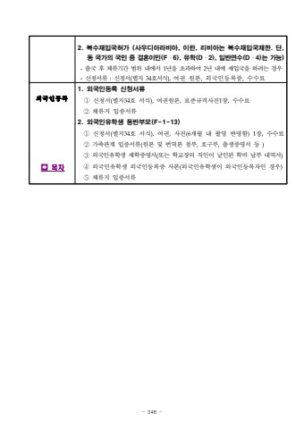 - 348 2. %ubcf5%uc218%uc7ac%uc785%uad6d%ud5c8%uac00 (%uc0ac%uc6b0%ub514%uc544%ub77c%ube44%uc544, %uc774%ub780, %ub9ac%ube44%uc544%ub294 %ubcf5%uc218%uc7ac%uc785%uad6d%uc81c%ud55c. %ub2e8, %ub3d9 %uad6d%uac00%uc758 %uad6d%ubbfc %uc911 %uacb0%ud63c%uc774%ubbfc(F%u00ad6), %uc720%ud559(D%u00ad2), %uc77c%ubc18%uc5f0%uc218(D%u00ad4)%ub294 %uac00%ub2a5)-%ucd9c%uad6d %ud6c4 %uccb4%ub958%uae30%uac04 %ubc94%uc704 %ub0b4%uc5d0%uc11c 1%ub144%uc744 %ucd08%uacfc%ud558%uc5ec 2%ub144 %ub0b4%uc5d0 %uc7ac%uc785%uad6d%uc744 %ud558%ub824%ub294 %uacbd%uc6b0-%uc2e0%uccad%uc11c%ub958 :%uc2e0%uccad%uc11c(%ubcc4%uc9c0 34%ud638%uc11c%uc2dd),%uc5ec%uad8c %uc6d0%ubcf8,%uc678%uad6d%uc778%ub4f1%ub85d%uc99d,%uc218%uc218%ub8cc%uc678%uad6d%uc778%ub4f1%ub85d%uf000%ubaa9%ucc281. %uc678%uad6d%uc778%ub4f1%ub85d %uc2e0%uccad%uc11c%ub958%u2460%uc2e0%uccad%uc11c(%ubcc4%uc9c034%ud638 %uc11c%uc2dd),%uc5ec%uad8c%uc6d0%ubcf8,%ud45c%uc900%uaddc%uaca9%uc0ac%uc9c41%uc7a5,%uc218%uc218%ub8cc%u2461%uccb4%ub958%uc9c0 %uc785%uc99d%uc11c%ub9582. %uc678%uad6d%uc778%uc720%ud559%uc0dd %ub3d9%ubc18%ubd80%ubaa8(F-1-13)%u2460%uc2e0%uccad%uc11c(%ubcc4%uc9c034%ud638 %uc11c%uc2dd),%uc5ec%uad8c,%uc0ac%uc9c4(6%uac1c%uc6d4 %ub0b4 %ucd2c%uc601 %ubc18%uba85%ud568)1%uc7a5,%uc218%uc218%ub8cc %u2461%uac00%uc871%uad00%uacc4 %uc785%uc99d%uc11c%ub958(%uc6d0%ubcf8 %ubc0f %ubc88%uc5ed%ubcf8 %ucca8%ubd80,%ud638%uad6c%ubd80,%ucd9c%uc0dd%uc99d%uba85%uc11c %ub4f1 )%u2462%uc678%uad6d%uc778%uc720%ud559%uc0dd %uc7ac%ud559%uc99d%uba85%uc11c(%ub610%ub294 %ud559%uad50%uc7a5%uc758 %uc9c1%uc778%uc774 %ub0a0%uc778%ub41c %ud559%ube44 %ub0a9%ubd80 %ub0b4%uc5ed%uc11c)%u2463%uc678%uad6d%uc778%uc720%ud559%uc0dd %uc678%uad6d%uc778%ub4f1%ub85d%uc99d %uc0ac%ubcf8(%uc678%uad6d%uc778%uc720%ud559%uc0dd%uc774 %uc678%uad6d%uc778%ub4f1%ub85d%uc790%uc778 %uacbd%uc6b0)%u2464%uccb4%ub958%uc9c0 %uc785%uc99d%uc11c%ub958