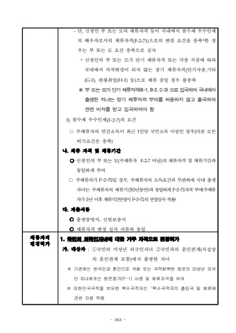 - 353 -%ub2e8,%uc2e0%uccad%uc778 %ubd80 %ub610%ub294 %ubaa8%uc758 %uccb4%ub958%uc790%uaca9 %ub4f1%uc774 %uad6d%ub0b4%uc5d0%uc11c %uc810%uc218%uc81c %uc6b0%uc218%uc778%uc7ac%uc758 %ubc30%uc6b0%uc790%ub85c%uc11c%uc758 %uccb4%ub958%uc790%uaca9(F-2-71)%uc73c%ub85c%uc758 %ubcc0%uacbd %uc694%uac74%uc744 %ucda9%uc871*%ud55c %uacbd%uc6b0%ub294 %ubd80 %ub610%ub294 %ubaa8 %uc694%uac74 %ucda9%uc871%uc73c%ub85c %uc2ec%uc0ac *%uc2e0%uccad%uc778%uc758 %ubd80 %ub610%ub294 %ubaa8%uac00 %ub2e8%uae30 %uccb4%ub958%uc790%uaca9 %ub610%ub294 %uac01%uc885 %uc9c0%uce68%uc5d0 %ub530%ub77c %uad6d%ub0b4%uc5d0%uc11c %uc790%uaca9%ubcc0%uacbd%uc774 %ub418%uc9c0 %uc54a%ub294 %uc7a5%uae30 %uccb4%ub958%uc790%uaca9(%ub2e8%uae30%uc0ac%uc99d,%uae30%ud0c0(G-1),%uad00%uad11%ucde8%uc5c5(H-1)%ub4f1)%uc73c%ub85c %uccb4%ub958 %uc911%uc77c %uacbd%uc6b0 %ubd88%ucda9%uc871%u203b %ubd80 %ub610%ub294 %ubaa8%uac00 %ub2e8%uae30 %uccb4%ub958%uc790%uaca9(B-1, B-2, C-3) %uc73c%ub85c %uc785%uad6d%ud558%uc5ec %uad6d%ub0b4%uc5d0%uc11c%ucd9c%uc0dd%ud55c%uc790%ub140%ub294 %uc7a5%uae30 %uccb4%ub958%uc790%uaca9 %ubd80%uc5ec%ub97c %ud5c8%uc6a9%ud558%uc9c0 %uc54a%uace0 %ucd9c%uad6d%ud558%uc5ec %uad00%ub828 %ube44%uc790%ub97c %ubc1b%uace0 %uc785%uad6d%ud558%uc5ec%uc57c %ud568 3)%uc810%uc218%uc81c %uc6b0%uc218%uc778%uc7ac(F-2-7)%uc758 %uc694%uac74 %u3007 %uc8fc%uccb4%ub958%uc790%uc758 %uc5f0%uac04%uc18c%ub4dd%uc774%ucd5c%uadfc 1%uc778%ub2f9 %uad6d%ubbfc%uc18c%ub4dd %uc774%uc0c1%uc778 %uacbd%uc6b0(%ub2e4%ub978 %ubaa8%ub4e0%ud5c8%uac00%uc694%uac74%uc740 %ucda9%uc871)%ub098.%uccb4%ub958 %uc790%uaca9 %ubc0f %uccb4%ub958%uae30%uac04%u3007%uc2e0%uccad%uc778%uc758%ubd80 %ub610%ub294 %ubaa8(%uc8fc%uccb4%ub958%uc790 F-2-7%uc544%ub2d8)%uc758 %uccb4%ub958%uc790%uaca9 %ubc0f %uccb4%ub958%uae30%uac04%uacfc%ub3d9%uc77c%ud558%uac8c%ubd80%uc5ec%u3007 %uc8fc%uccb4%ub958%uc790%uac00 F-2-7S%uc77c %uacbd%uc6b0, %uc8fc%uccb4%ub958%uc790%uc758 %uc18c%ub4dd%uc694%uac74%uacfc %ubb34%uad00%ud558%uac8c %uad6d%ub0b4 %ucd9c%uc0dd %uc790%ub140%ub294%uc8fc%uccb4%ub958%uc790%uc758 %uccb4%ub958%uae30%uac04(5%ub144%ub3d9%uc548)%uacfc%ub3d9%uc77c%ud558%uac8c F-2-71%uc790%uaca9 %ubd80%uc5ec(%uc8fc%uccb4%ub958%uc790%uac00 5%ub144%uc774%ud6c4 %uccb4%ub958%uae30%uac04%uc5f0%uc7a5%uc2dc F-2-71%uc758 %uc5f0%uc7a5%uc2ec%uc0ac %uc801%uc6a9)%ub2e4.%uc81c%ucd9c%uc11c%ub958%u3007%ucd9c%uc0dd%uc99d%uba85%uc11c,%uc2e0%uc6d0%ubcf4%uc99d%uc11c%u3007 %uccb4%ub958%uc790%uaca9 %ubcc0%uacbd %uc2ec%uc0ac %uc11c%ub958%uc640 %ub3d9%uc77c%ubcc0%uacbd%ud5c8%uac001. %uad6d%ubbfc%uc758 %uc678%uad6d%uc778%uc790%ub140%uc5d0 %ub300%ud55c %uac70%uc8fc %uc790%uaca9%uc73c%ub85c %ubcc0%uacbd%ud5c8%uac00%uac00.%ub300%uc0c1%uc790 :%u2460%uad6d%ubbfc%uc758 %ubbf8%uc131%ub144 %uc678%uad6d%uc778%uc790%ub140 %u2461%uad6d%ubbfc%uacfc%uc758 %ud63c%uc778%uad00%uacc4(%uc0ac%uc2e4%uc0c1%uc758 %ud63c%uc778%uad00%uacc4 %ud3ec%ud568)%uc5d0%uc11c %ucd9c%uc0dd%ud55c %uc790%ub140%u203b %uae30%uc874%uc5d0%ub294 %ud55c%uad6d%uc778%uacfc %ud63c%uc778%uc73c%ub85c %uadc0%ud654 %ub610%ub294 %uad6d%uc801%ud68c%ubcf5%ud55c %ub3d9%ud3ec%uc758 %ubbf8%uc131%ub144 %uc678%uad6d%uc778 %uc790%ub140%uc5d0%uac8c%ub294 %ubc29%ubb38%ub3d9%uac70(F-1) %uc0ac%uc99d %ubc0f %uccb4%ub958%uc790%uaca9%uc744 %ubd80%uc5ec%u203b %ub300%ud55c%ubbfc%uad6d%uad6d%uc801%uc744 %ubcf4%uc720%ud55c %ubcf5%uc218%uad6d%uc801%uc790%ub294 %uff62%ubcf5%uc218%uad6d%uc801%uc790%uc758 %ucd9c%uc785%uad6d %ubc0f %uccb4%ub958%uc5d0 %uad00%ud55c %uc9c0%uce68 %uc801%uc6a9