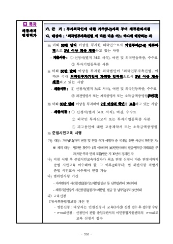 - 356 %uf000%ubaa9%ucc28%uccb4%ub958%uc790%uaca9%ubcc0%uacbd%ud5c8%uac00%uac00.%uadfc %uac70 :%ud22c%uc790%uc678%uad6d%uc778%uc5d0 %ub300%ud55c %uac70%uc8fc(F-2)%uc790%uaca9 %ubd80%uc5ec %uccb4%ub958%uad00%ub9ac%uc9c0%uce68%ub098.%ub300%uc0c1%uc790 :%uff62%uc678%uad6d%uc778%ud22c%uc790%ucd09%uc9c4%ubc95%uff63%uc5d0 %ub530%ub978 %ub2e4%uc74c %uc5b4%ub290 %ud558%ub098%uc5d0 %ud574%ub2f9%ud558%ub294 %uc790%ubbf8%ud65450%ub9cc %ub2ec%ub7ec%uc774%uc0c1%uc744 %ud22c%uc790%ud55c %uc678%uad6d%uc778%uc73c%ub85c%uc11c %uae30%uc5c5%ud22c%uc790(D-8)%uccb4%ub958%uc790%uaca9%uc73c%ub85c 3%ub144 %uc774%uc0c1 %uacc4%uc18d %uccb4%ub958%ud558%uace0 %uc788%ub294 %uc0ac%ub78c -%uc81c%ucd9c%uc11c%ub958 :%u2460%uc2e0%uccad%uc11c(%ubcc4%uc9c0 34%ud638 %uc11c%uc2dd),%uc5ec%uad8c %ubc0f %uc678%uad6d%uc778%ub4f1%ub85d%uc99d,%uc218%uc218%ub8cc%u2461%ud22c%uc790%uae30%uc5c5%ub4f1%ub85d%uc99d %uc0ac%ubcf8%ubbf8%ud654 50%ub9cc %ub2ec%ub7ec%uc774%uc0c1%uc744 %ud22c%uc790%ud55c %uc678%uad6d%ubc95%uc778%uc774%u300c%uc678%uad6d%uc778%ud22c%uc790%ucd09%uc9c4%ubc95%u300d%uc5d0 %ub530%ub978 %uad6d%ub0b4 %uc678%uad6d%uc778%ud22c%uc790%uae30%uc5c5%uc5d0 %ud30c%uacac%ud55c %uc784%uc9c1%uc6d0%uc73c%ub85c%uc11c 3%ub144 %uc774%uc0c1 %uacc4%uc18d %uccb4%ub958%ud558%uace0 %uc788%ub294 %uc0ac%ub78c-%uc81c%ucd9c%uc11c%ub958:%u2460%uc2e0%uccad%uc11c(%ubcc4%uc9c0 34%ud638 %uc11c%uc2dd),%uc5ec%uad8c %ubc0f %uc678%uad6d%uc778%ub4f1%ub85d%uc99d,%uc218%uc218%ub8cc%u2461%ud30c%uacac%uba85%ub839%uc11c %ub610%ub294 %uc7ac%uc9c1%uc99d%uba85%uc11c %ub610%ub294%uc18c%ub4dd%uae08%uc561%uc99d%uba85%uc6d0(3%ub144%uac04)%ubbf8%ud654 30%ub9cc %ub2ec%ub7ec%uc774%uc0c1%uc744 %ud22c%uc790%ud558%uc5ec 2%uba85 %uc774%uc0c1%uc758 %uad6d%ubbfc%uc744 %uace0%uc6a9%ud558%uace0 %uc788%ub294 %uc0ac%ub78c-%uc81c%ucd9c%uc11c%ub958 :%u2460%uc2e0%uccad%uc11c(%ubcc4%uc9c0 34%ud638 %uc11c%uc2dd),%uc5ec%uad8c,%uc218%uc218%ub8cc%u2461%uc678%uad6d%uc778 %ud22c%uc790%uc2e0%uace0%uc11c %ub610%ub294 %ud22c%uc790%uae30%uc5c5%ub4f1%ub85d%uc99d %uc0ac%ubcf8%u2462%ud53c%uace0%uc6a9%uc778%uc5d0 %ub300%ud55c %uace0%uc6a9%uacc4%uc57d%uc11c %ub610%ub294 %uc18c%ub4dd%uae08%uc561%uc99d%uba85%uc6d0%uc900%ubc95%uc2dc%ubbfc%uad50%uc721 %uc2dc%ud589%uac00)%ub300%uc0c1 :%uac70%uc8fc(F-2)%uc790%uaca9 %ubcc0%uacbd %ubc0f %uc5f0%uc7a5 %ud5c8%uac00 %uc608%uc815%uc790 %uc911 %uad6d%ub0b4%ubc95 %uc704%ubc18 %uc0ac%uc2e4%uc774%ud655%uc778%ub41c %uc790.%u203b %uc81c%uc678 %ub300%uc0c1 :%ubc95%uc704%ubc18 %ud69f%uc218%uac00 1%ud68c %uc774%ud558%uc774%uba70 100%ub9cc%uc6d0%uc774%ud558%uc758 %ubc8c%uae08%u00b7%ubc94%uce59%uae08%uff65%uacfc%ud0dc%ub8cc%ub97c %ubd80%uacfc(%ucc98%ubd84%u00b7%ubd80%uacfc %uba74%uc81c %ud3ec%ud568)%ubc1b%uc740 %uc9c0 10%ub144%uc774 %uacbd%uacfc%ub41c %uc790%ub098)%uc9c0%uce68 %uc2dc%ud589 %ud6c4 %uc900%ubc95%uc2dc%ubbfc%uad50%uc721%ub300%uc0c1%uc790%uac00 %ucd5c%ucd08 %uc5f0%uc7a5 %uc2e0%uccad%uc2dc %ub2e4%uc74c %uc5f0%uc7a5%uc2dc%uae4c%uc9c0%uc900%ubc95 %uc2dc%ubbfc%uad50%uc721 %uc774%uc218%ud574%uc57c %ud568,%uadf8 %uc774%ud6c4(2%ud68c%ubd80%ud130)%ubc95 %uc704%ubc18%uc0ac%ud56d %uc801%ubc1c%uc2dc%uc900%ubc95 %uc2dc%ubbfc%uad50%uc721 %uc774%uc218%ud574%uc57c %uc5f0%uc7a5 %uac00%ub2a5%ub2e4)%ubc94%uc704%ubc18%uc0ac%ud56d %uae30%uac04 -%uc790%uaca9%ubcc0%uacbd%uc2dc %uc0ac%uac74%uc885%uacb0%uc77c(%ubd88%uae30%uc18c%ucc98%ubd84%uc77c,%ubc8c%uae08 %ub4f1 %ub0a9%ubd80%uc77c)%ubd80%ud130 10%ub144%uc774%ub0b4-%uccb4%ub958%uae30%uac04%uc5f0%uc7a5%uc2dc %uc0ac%uac74%uc885%uacb0%uc77c(%ubd88%uae30%uc18c%ucc98%ubd84%uc77c,%ubc8c%uae08 %ub4f1 %ub0a9%ubd80%uc77c)%ubd80%ud130 5%ub144%uc774%ub0b4%ub77c) %uad50%uc721%uc2e0%uccad(%uac00)%uc0ac%ud68c%ud1b5%ud569%uc815%ubcf4%ub9dd %uac1c%uc120 %uc804- %ubc29%ubb38%uc2e0%uccad: %ub300%uc0c1%uc790%ub294 %ubbfc%uc6d0%uc2e0%uccad%uc2dc %uad50%uc721(3%uc2dc%uac04) %uc2e0%uccad %uc811%uc218 %ud6c4 %uc811%uc218%uc99d %uc218%ub839- e-mail%uc2e0%uccad : %uc2e0%uccad%uc778%uc774 %uad00%ud560 %ucd9c%uc785%uad6d%uad00%uc11c%uc758%uc774%ubbfc%ud1b5%ud569%uc9c0%uc6d0%uc13c%ud130%uc758 e-mail%ub85c%uad50%uc721 %uc2e0%uccad%uc11c %uc811%uc218