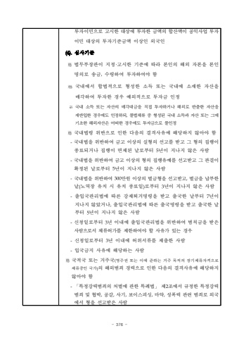 - 376 %ud22c%uc790%uc774%ubbfc%uc73c%ub85c %uace0%uc2dc%ud55c %ub300%uc0c1%uc5d0 %ud22c%uc790%ud55c %uae08%uc561%uc758 %ud569%uc0b0%uc561%uc774 %uacf5%uc775%uc0ac%uc5c5 %ud22c%uc790%uc774%ubbfc%ub300%uc0c1%uc758%ud22c%uc790%uae30%uc900%uae08%uc561 %uc774%uc0c1%uc778 %uc678%uad6d%uc778(4).%uc2ec%uc0ac%uae30%uc900%ubc95%ubb34%ubd80%uc7a5%uad00%uc774 %uc9c0%uc815%u00b7%uace0%uc2dc%ud55c %uae30%uc900%uc5d0 %ub530%ub77c %ubcf8%uc778%uc758 %ud574%uc678 %uc790%ubcf8%uc744 %ubcf8%uc778 %uba85%uc758%ub85c %uc1a1%uae08,%uc218%ub839%ud558%uc5ec %ud22c%uc790%ud558%uc5ec%uc57c %ud568%uad6d%ub0b4%uc5d0%uc11c %ud569%ubc95%uc801%uc73c%ub85c %ud615%uc131%ud55c %uc18c%ub4dd %ub610%ub294 %uad6d%ub0b4%uc5d0 %uc18c%uc7ac%ud55c %uc790%uc0b0%uc744 %ub9e4%uac01%ud558%uc5ec %ud22c%uc790%ud55c %uacbd%uc6b0 %uc608%uc678%uc801%uc73c%ub85c %ud22c%uc790%uae08 %uc778%uc815%u203b%uad6d%ub0b4 %uc18c%ub4dd %ub610%ub294 %uc790%uc0b0%uc758 %ub9e4%uac01%ub300%uae08%uc744 %uc9c1%uc811 %ud22c%uc790%ud558%uac70%ub098 %ud574%uc678%ub85c %ubc18%ucd9c%ud55c %uc790%uc0b0%uc744 %uc7ac%ubc18%uc785%ud55c %uacbd%uc6b0%uc5d0%ub3c4 %uc778%uc815%ud558%ub418,%ubd88%ubc95%uccb4%ub958 %uc911 %ud615%uc131%ub41c %uad6d%ub0b4 %uc18c%ub4dd%uacfc %uc790%uc0b0 %ub610%ub294 %uadf8%uc5d0 %uae30%ucd08%ud55c %ud574%uc678%uc790%uc0b0%uc740 %uc5b4%ub5a0%ud55c %uacbd%uc6b0%uc5d0%ub3c4 %ud22c%uc790%uae08%uc73c%ub85c %ubd88%uc778%uc815%uad6d%ub0b4%ubc95%ub839 %uc704%ubc18%uc73c%ub85c %uc778%ud55c %ub2e4%uc74c%uc758 %uacb0%uaca9%uc0ac%uc720%uc5d0 %ud574%ub2f9%ud558%uc9c0 %uc54a%uc544%uc57c %ud568-%uad6d%ub0b4%ubc95%uc744 %uc704%ubc18%ud558%uc5ec %uae08%uace0 %uc774%uc0c1%uc758 %uc2e4%ud615%uc758 %uc120%uace0%ub97c %ubc1b%uace0 %uadf8 %ud615%uc758 %uc9d1%ud589%uc774 %uc885%ub8cc%ub418%uac70%ub098 %uc9d1%ud589%uc774 %uba74%uc81c%ub41c %ub0a0%ub85c%ubd80%ud130 5%ub144%uc774 %uc9c0%ub098%uc9c0 %uc54a%uc740 %uc0ac%ub78c-%uad6d%ub0b4%ubc95%uc744 %uc704%ubc18%ud558%uc5ec %uae08%uace0 %uc774%uc0c1%uc758 %ud615%uc758 %uc9d1%ud589%uc720%uc608%ub97c %uc120%uace0%ubc1b%uace0 %uadf8 %ud310%uacb0%uc774 %ud655%uc815%ub41c %ub0a0%ub85c%ubd80%ud130 5%ub144%uc774 %uc9c0%ub098%uc9c0 %uc54a%uc740 %uc0ac%ub78c-%uad6d%ub0b4%ubc95%uc744 %uc704%ubc18%ud558%uc5ec 300%ub9cc%uc6d0 %uc774%uc0c1%uc758 %ubc8c%uae08%ud615%uc744 %uc120%uace0%ubc1b%uace0%ubc8c%uae08%uc744 %ub0a9%ubd80%ud55c %ub0a0(%ub178%uc5ed%uc7a5 %uc720%uce58 %uc2dc %uc720%uce58 %uc885%ub8cc%uc77c)%ub85c%ubd80%ud130 3%ub144%uc774 %uc9c0%ub098%uc9c0 %uc54a%uc740 %uc0ac%ub78c-%ucd9c%uc785%uad6d%uad00%ub9ac%ubc95%uc5d0 %ub530%ub978 %uac15%uc81c%ud1f4%uac70%uba85%ub839%uc744 %ubc1b%uace0 %ucd9c%uad6d%ud55c %ub0a0%ubd80%ud130 7%ub144%uc774 %uc9c0%ub098%uc9c0 %uc54a%uc558%uac70%ub098,%ucd9c%uc785%uad6d%uad00%ub9ac%ubc95%uc5d0 %ub530%ub978 %ucd9c%uad6d%uba85%ub839%uc744 %ubc1b%uace0 %ucd9c%uad6d%ud55c %ub0a0%ubd80%ud130 5%ub144%uc774 %uc9c0%ub098%uc9c0 %uc54a%uc740 %uc0ac%ub78c-%uc2e0%uccad%uc77c%ub85c%ubd80%ud130 3%ub144 %uc774%ub0b4%uc5d0 %ucd9c%uc785%uad6d%uad00%ub9ac%ubc95%uc744 %uc704%ubc18%ud558%uc5ec %ubc94%uce59%uae08%uc744 %ubc1b%uc740 %uc0ac%ub78c%uc73c%ub85c%uc11c %uccb4%ub958%ud5c8%uac00%ub97c %uc81c%ud55c%ud558%uc5ec%uc57c %ud560 %uc0ac%uc720%uac00 %uc788%ub294 %uacbd%uc6b0-%uc2e0%uccad%uc77c%ub85c%ubd80%ud130 3%ub144 %uc774%ub0b4%uc5d0 %ud5c8%uc704%uc11c%ub958%ub97c %uc81c%ucd9c%ud55c %uc0ac%ub78c-%uc785%uad6d%uae08%uc9c0 %uc0ac%uc720%uc5d0 %ud574%ub2f9%ud558%ub294 %uc0ac%ub78c%uad6d%uc801%uad6d %ub610%ub294 %uac70%uc8fc%uad6d(%uc601%uc8fc%uad8c %ub610%ub294 %uc774%uc5d0 %uc900%ud558%ub294 %uac70%uc8fc %ubaa9%uc801%uc758 %uc7a5%uae30%uccb4%ub958%uc790%uaca9%uc73c%ub85c %uccb4%ub958%uc911%uc778 %uad6d%uac00)%uc758 %ud574%uc678%ubc94%uc8c4 %uacbd%ub825%uc73c%ub85c %uc778%ud55c %ub2e4%uc74c%uc758 %uacb0%uaca9%uc0ac%uc720%uc5d0 %ud574%ub2f9%ud558%uc9c0 %uc54a%uc544%uc57c %ud568-%u300c%ud2b9%uc815%uac15%ub825%ubc94%uc8c4%uc758 %ucc98%ubc8c%uc5d0 %uad00%ud55c %ud2b9%ub840%ubc95%u300d%uc81c2%uc870%uc5d0%uc11c %uaddc%uc815%ud55c %ud2b9%uc815%uac15%ub825%ubc94%uc8c4 %ubc0f %ud611%ubc15,%uacf5%uac08,%uc0ac%uae30,%ubcf4%uc774%uc2a4%ud53c%uc2f1,%ub9c8%uc57d,%uc131%ud3ed%ub825 %uad00%ub828 %ubc94%uc8c4%ub85c %uc678%uad6d%uc5d0%uc11c %ud615%uc744 %uc120%uace0%ubc1b%uc740 %uc0ac%ub78c