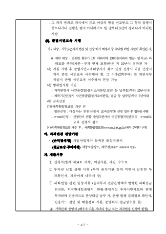 - 377 -%uadf8 %uc678%uc758 %ubc94%uc8c4%ub85c %uc678%uad6d%uc5d0%uc11c %uae08%uace0 %uc774%uc0c1%uc758 %ud615%uc744 %uc120%uace0%ubc1b%uace0 %uadf8 %ud615%uc758 %uc9d1%ud589%uc774 %uc885%ub8cc%ub418%uac70%ub098 %uc9d1%ud589%uc744 %ubc1b%uc9c0 %uc544%ub2c8%ud558%uae30%ub85c %ud55c %ub0a0%ubd80%ud130 5%ub144%uc774 %uacbd%uacfc%ub418%uc9c0 %uc544%ub2c8%ud55c%uc0ac%ub78c (5).%uc900%ubc95%uc2dc%ubbfc%uad50%uc721 %uc2dc%ud589%uac00)%ub300%uc0c1 :%uac70%uc8fc(F-2)%uc790%uaca9 %ubcc0%uacbd %ubc0f %uc5f0%uc7a5 %ud5c8%uac00 %uc608%uc815%uc790 %uc911 %uad6d%ub0b4%ubc95 %uc704%ubc18 %uc0ac%uc2e4%uc774%ud655%uc778%ub41c %uc790.%u203b %uc81c%uc678 %ub300%uc0c1 : %ubc95%uc704%ubc18 %ud69f%uc218%uac00 1%ud68c %uc774%ud558%uc774%uba70 100%ub9cc%uc6d0%uc774%ud558%uc758 %ubc8c%uae08%u00b7%ubc94%uce59%uae08%uff65%uacfc%ud0dc%ub8cc%ub97c %ubd80%uacfc(%ucc98%ubd84%u00b7%ubd80%uacfc %uba74%uc81c %ud3ec%ud568)%ubc1b%uc740 %uc9c0 10%ub144%uc774 %uacbd%uacfc%ub41c %uc790%ub098)%uc9c0%uce68 %uc2dc%ud589 %ud6c4 %uc900%ubc95%uc2dc%ubbfc%uad50%uc721%ub300%uc0c1%uc790%uac00 %ucd5c%ucd08 %uc5f0%uc7a5 %uc2e0%uccad%uc2dc %ub2e4%uc74c %uc5f0%uc7a5%uc2dc%uae4c%uc9c0%uc900%ubc95 %uc2dc%ubbfc%uad50%uc721 %uc774%uc218%ud574%uc57c %ud568,%uadf8 %uc774%ud6c4(2%ud68c%ubd80%ud130)%ubc95 %uc704%ubc18%uc0ac%ud56d %uc801%ubc1c%uc2dc%uc900%ubc95 %uc2dc%ubbfc%uad50%uc721 %uc774%uc218%ud574%uc57c %uc5f0%uc7a5 %uac00%ub2a5%ub2e4)%ubc94%uc704%ubc18%uc0ac%ud56d %uae30%uac04 -%uc790%uaca9%ubcc0%uacbd%uc2dc %uc0ac%uac74%uc885%uacb0%uc77c(%ubd88%uae30%uc18c%ucc98%ubd84%uc77c,%ubc8c%uae08 %ub4f1 %ub0a9%ubd80%uc77c)%ubd80%ud130 10%ub144%uc774%ub0b4-%uccb4%ub958%uae30%uac04%uc5f0%uc7a5%uc2dc %uc0ac%uac74%uc885%uacb0%uc77c(%ubd88%uae30%uc18c%ucc98%ubd84%uc77c, %ubc8c%uae08 %ub4f1 %ub0a9%ubd80%uc77c)%ubd80%ud130 5%ub144%uc774%ub0b4%ub77c) %uad50%uc721%uc2e0%uccad(%uac00)%uc0ac%ud68c%ud1b5%ud569%uc815%ubcf4%ub9dd %uac1c%uc120 %uc804-%ubc29%ubb38%uc2e0%uccad: %ub300%uc0c1%uc790%ub294 %ubbfc%uc6d0%uc2e0%uccad%uc2dc %uad50%uc721(3%uc2dc%uac04) %uc2e0%uccad %uc811%uc218 %ud6c4 %uc811%uc218%uc99d %uc218%ub839-e-mail%uc2e0%uccad : %uc2e0%uccad%uc778%uc774 %uad00%ud560 %ucd9c%uc785%uad6d%uad00%uc11c%uc758%uc774%ubbfc%ud1b5%ud569%uc9c0%uc6d0%uc13c%ud130%uc758 e-mail%ub85c%uad50%uc721 %uc2e0%uccad%uc11c %uc811%uc218(%ub098)%uc0ac%ud68c%ud1b5%ud569%uc815%ubcf4%ub9dd %uac1c%uc120 %ud6c4 : %uc0ac%ud68c%ud1b5%ud569%uc815%ubcf4%ub9dd(www.socinet.go.kr)%uc5d0%uc11c%uc628%ub77c%uc778 %uc2e0%uccad%uc544.%uc790%uaca9%ubcc0%uacbd %uc804%ub2f4%uae30%uad00 %uff65(%uc190%uc775%ubc1c%uc0dd%ud615)%uac1c%ubc1c%uc0ac%uc5c5%uc790%uac00 %ub4f1%ub85d%ub41c %ucd9c%uc785%uad6d%uad00%uc11c%uff65(%uc6d0%uae08%ubcf4%uc7a5%u00b7%ubb34%uc774%uc790%ud615)%uc138%uc885%ub85c%ucd9c%uc7a5%uc18c,%uc81c%uc8fc%uccad(%uc81c%uc8fc%ub3c4 %uccb4%ub958%uc790%uc5d0 %ud55c%ud568)%uc790.%uc81c%ucd9c%uc11c%ub958%u2460%uc2e0%uccad%uc11c(%ubcc4%uc9c0 %uc81c34%ud638 %uc11c%uc2dd),%uc5ec%uad8c%uc0ac%ubcf8,%uc0ac%uc9c4,%uc218%uc218%ub8cc%u2461%ud22c%uc790%uae08 %ub0a9%uc785 %uc99d%uba85 %uc11c%ub958 (%ud22c%uc790 %uc720%uce58%uae30%uad00 %uc7a5%uc758 %uc9c1%uc778%uc774 %ub0a0%uc778%ub41c %ud22c%uc790%ud655%uc778%uc11c,%uacc4%uc88c%uc774%uccb4 %ub0b4%uc5ed%uc11c %ub4f1)%u2462%uc678%ud654%ubc18%uc785 %uad00%ub828 %uc785%uc99d%uc11c%ub958 (%uacf5%uc775%ud22c%uc790 %uc804%ub2f4%uc740%ud589%uc5d0%uc11c %ubc1c%ud589%ud55c %uc678%ud654%uc1a1%uae08 %uc804%uc2e0%ubb38,%uc678%uad6d%ud658%ub9e4%uc785%uc99d%uba85%uc11c.%uad00%uad11%u00b7%ud734%uc591%uc2dc%uc124 %ud22c%uc790%uc774%ubbfc%uc81c%ub3c4%uc640 %uc5f0%uacc4 %ud22c%uc790%ud558%uba70 %uc2e0%uc6a9%uce74%ub4dc%ub85c %ubd84%uc591%ub300%uae08 %ub0a9%ubd80 %uc2dc,%uc740%ud589 %ubc1c%ud589 %uacb0%uc81c%uc815%ubcf4 %ud655%uc778%uc11c,%uc2e0%uc6a9%uce74%ub4dc %uc804%uba74 %ubc0f %ub9e4%ucd9c%uc804%ud45c %uc0ac%ubcf8,%ubd84%uc591%ud68c%uc0ac %uc785%uae08%uc601%uc218%uc99d %ub4f1)%u2463%uac00%uc871%uad00%uacc4 %uc99d%uba85%uc11c (%ubc30%uc6b0%uc790%u00b7%ubbf8%ud63c %uc790%ub140%uc758 %uc1a1%uae08 %ub610%ub294 %uc790%uaca9%ubcc0%uacbd %uc2e0%uccad%uc5d0 %ud55c%ud568)