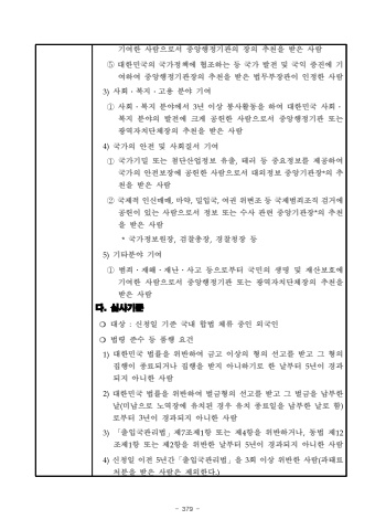 - 379 %uae30%uc5ec%ud55c %uc0ac%ub78c%uc73c%ub85c%uc11c %uc911%uc559%ud589%uc815%uae30%uad00%uc758 %uc7a5%uc758 %ucd94%ucc9c%uc744 %ubc1b%uc740 %uc0ac%ub78c%u2464%ub300%ud55c%ubbfc%uad6d%uc758 %uad6d%uac00%uc815%ucc45%uc5d0 %ud611%uc870%ud558%ub294 %ub4f1 %uad6d%uac00 %ubc1c%uc804 %ubc0f %uad6d%uc775 %uc99d%uc9c4%uc5d0 %uae30%uc5ec%ud558%uc5ec %uc911%uc559%ud589%uc815%uae30%uad00%uc7a5%uc758 %ucd94%ucc9c%uc744 %ubc1b%uc740 %ubc95%ubb34%ubd80%uc7a5%uad00%uc774 %uc778%uc815%ud55c %uc0ac%ub78c3)%uc0ac%ud68c%u2024%ubcf5%uc9c0%u2024%uace0%uc6a9 %ubd84%uc57c %uae30%uc5ec%u2460%uc0ac%ud68c%u2024%ubcf5%uc9c0 %ubd84%uc57c%uc5d0%uc11c 3%ub144 %uc774%uc0c1 %ubd09%uc0ac%ud65c%ub3d9%uc744 %ud558%uc5ec %ub300%ud55c%ubbfc%uad6d %uc0ac%ud68c%u2024%ubcf5%uc9c0 %ubd84%uc57c%uc758 %ubc1c%uc804%uc5d0 %ud06c%uac8c %uacf5%ud5cc%ud55c %uc0ac%ub78c%uc73c%ub85c%uc11c %uc911%uc559%ud589%uc815%uae30%uad00 %ub610%ub294 %uad11%uc5ed%uc790%uce58%ub2e8%uccb4%uc7a5%uc758 %ucd94%ucc9c%uc744 %ubc1b%uc740 %uc0ac%ub78c4)%uad6d%uac00%uc758 %uc548%uc804 %ubc0f %uc0ac%ud68c%uc9c8%uc11c %uae30%uc5ec%u2460%uad6d%uac00%uae30%ubc00 %ub610%ub294 %ucca8%ub2e8%uc0b0%uc5c5%uc815%ubcf4 %uc720%ucd9c,%ud14c%ub7ec %ub4f1 %uc911%uc694%uc815%ubcf4%ub97c %uc81c%uacf5%ud558%uc5ec %uad6d%uac00%uc758 %uc548%uc804%ubcf4%uc7a5%uc5d0 %uacf5%ud5cc%ud55c %uc0ac%ub78c%uc73c%ub85c%uc11c %ub300%uc678%uc815%ubcf4 %uc911%uc559%uae30%uad00%uc7a5*%uc758 %ucd94%ucc9c%uc744 %ubc1b%uc740 %uc0ac%ub78c %u2461%uad6d%uc81c%uc801 %uc778%uc2e0%ub9e4%ub9e4,%ub9c8%uc57d,%ubc00%uc785%uad6d,%uc5ec%uad8c %uc704%ubcc0%uc870 %ub4f1 %uad6d%uc81c%ubc94%uc8c4%uc870%uc9c1 %uac80%uac70%uc5d0%uacf5%ud5cc%uc774 %uc788%ub294 %uc0ac%ub78c%uc73c%ub85c%uc11c %uc815%ubcf4 %ub610%ub294 %uc218%uc0ac %uad00%ub828 %uc911%uc559%uae30%uad00%uc7a5*%uc758 %ucd94%ucc9c%uc744 %ubc1b%uc740 %uc0ac%ub78c *%uad6d%uac00%uc815%ubcf4%uc6d0%uc7a5,%uac80%ucc30%ucd1d%uc7a5,%uacbd%ucc30%uccad%uc7a5 %ub4f1 5)%uae30%ud0c0%ubd84%uc57c %uae30%uc5ec%ubc94%uc8c4%uc7ac%ud574%uc7ac%ub09c%uc0ac%uace0 %ub4f1%uc73c%ub85c%ubd80%ud130 %uad6d%ubbfc%uc758 %uc0dd%uba85 %ubc0f %uc7ac%uc0b0%ubcf4%ud638%uc5d0 %uae30%uc5ec%ud55c %uc0ac%ub78c%uc73c%ub85c%uc11c %uc911%uc559%ud589%uc815%uae30%uad00 %ub610%ub294 %uad11%uc5ed%uc790%uce58%ub2e8%uccb4%uc7a5%uc758 %ucd94%ucc9c%uc744 %ubc1b%uc740 %uc0ac%ub78c%ub2e4. %uc2ec%uc0ac%uae30%uc900%u274d %ub300%uc0c1 :%uc2e0%uccad%uc77c %uae30%uc900 %uad6d%ub0b4 %ud569%ubc95 %uccb4%ub958 %uc911%uc778 %uc678%uad6d%uc778 %u274d %ubc95%ub839 %uc900%uc218 %ub4f1 %ud488%ud589 %uc694%uac741)%ub300%ud55c%ubbfc%uad6d %ubc95%ub960%uc744 %uc704%ubc18%ud558%uc5ec %uae08%uace0 %uc774%uc0c1%uc758 %ud615%uc758 %uc120%uace0%ub97c %ubc1b%uace0 %uadf8 %ud615%uc758 %uc9d1%ud589%uc774 %uc885%ub8cc%ub418%uac70%ub098 %uc9d1%ud589%uc744 %ubc1b%uc9c0 %uc544%ub2c8%ud558%uae30%ub85c %ud55c %ub0a0%ubd80%ud130 5%ub144%uc774 %uacbd%uacfc%ub418%uc9c0 %uc544%ub2c8%ud55c %uc0ac%ub78c2)%ub300%ud55c%ubbfc%uad6d %ubc95%ub960%uc744 %uc704%ubc18%ud558%uc5ec %ubc8c%uae08%ud615%uc758 %uc120%uace0%ub97c %ubc1b%uace0 %uadf8 %ubc8c%uae08%uc744 %ub0a9%ubd80%ud55c %ub0a0(%ubbf8%ub0a9%uc73c%ub85c %ub178%uc5ed%uc7a5%uc5d0 %uc720%uce58%ub41c %uacbd%uc6b0 %uc720%uce58 %uc885%ub8cc%uc77c%uc744 %ub0a9%ubd80%ud55c %ub0a0%ub85c %ud568)%ub85c%ubd80%ud130 3%ub144%uc774 %uacbd%uacfc%ub418%uc9c0 %uc544%ub2c8%ud55c %uc0ac%ub78c 3)%u300c%ucd9c%uc785%uad6d%uad00%ub9ac%ubc95%u300d%uc81c7%uc870%uc81c1%ud56d %ub610%ub294 %uc81c4%ud56d%uc744 %uc704%ubc18%ud558%uac70%ub098,%ub3d9%ubc95 %uc81c12%uc870%uc81c1%ud56d %ub610%ub294 %uc81c2%ud56d%uc744 %uc704%ubc18%ud55c %ub0a0%ubd80%ud130 5%ub144%uc774 %uacbd%uacfc%ub418%uc9c0 %uc544%ub2c8%ud55c %uc0ac%ub78c4)%uc2e0%uccad%uc77c %uc774%uc804 5%ub144%uac04%u300c%ucd9c%uc785%uad6d%uad00%ub9ac%ubc95%u300d%uc744 3%ud68c %uc774%uc0c1 %uc704%ubc18%ud55c %uc0ac%ub78c(%uacfc%ud0dc%ub8cc%ucc98%ubd84%uc744 %ubc1b%uc740 %uc0ac%ub78c%uc740 %uc81c%uc678%ud55c%ub2e4.)