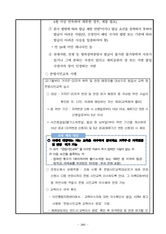 - 385 6%uc6d4 %uc774%uc0c1 %uc5f0%uc18d%ud558%uc5ec %uccb4%ub958%ud55c %uacbd%uc6b0,%uc81c%ucd9c %ud544%uc694)%u2462%ubcf8%uad6d %ubc95%ub839%uc5d0 %ub530%ub77c %ubc1c%uae09 %uc81c%ud55c %uc5f0%ub839*%uc774%uac70%ub098 %ubc1c%uae09 %uc694%uac74%uc744 %ucda9%uc871%ud558%uc9c0 %ubabb%ud558%uc5ec%ubc1c%uae09%uc774 %uc5b4%ub824%uc6b4 %uc0ac%ub78c(%ub2e8,%uc2e0%uccad%uc778%uc774 %ud574%ub2f9 %uad6d%uac00%uc758 %ubc95%ub839 %ub610%ub294 %uae30%uc900%uc5d0 %ub530%ub77c%ubc1c%uae09%uc774 %uc5b4%ub824%uc6b4 %uc0ac%uc2e4%uc744 %uc785%uc99d%ud558%uc5ec%uc57c %ud568)*%ub9cc 18%uc138 %ubbf8%ub9cc %uce90%ub098%ub2e4%uc778 %ub4f1%u2463%ucc9c%uc7ac%uc9c0%ubcc0,%uc804%uc7c1 %ub4f1 %ubc94%uc8c4%uacbd%ub825%uc99d%uba85%uc11c %ubc1c%uae09%uc774 %ubd88%uac00%ud55c %ubd88%uac00%ud56d%ub825%uc801 %uc0ac%uc720%uac00%uc788%uac70%ub098 %uadf8%uc5d0 %uc900%ud558%ub294 %uc0ac%uc815%uc774 %uc788%ub2e4%uace0 %uc7ac%uc678%uacf5%uad00%uc758 %uc7a5 %ub610%ub294 %uc9c0%ubc29 %ucd9c%uc785%uad6d%uad00%uc11c%uc758 %uc7a5%uc774 %uc778%uc815%ud558%ub294 %uc0ac%ub78c%u25cb %uc900%ubc95%uc2dc%ubbfc%uad50%uc721 %uc2dc%ud589'22.7%uc6d4%ubd80%ud130 %uac70%uc8fc(F-2)%uc790%uaca9 %ucde8%ub4dd %ubc0f %uc5f0%uc7a5 %uc608%uc815%uc790%ub97c %ub300%uc0c1%uc73c%ub85c %ubc95%uc9c8%uc11c %uad50%uc721 %ub4f1 %uc900%ubc95%uc2dc%ubbfc%uad50%uc721 %uc2e4%uc2dc%u25cb %ub300%uc0c1 : %uac70%uc8fc(F-2)%uc790%uaca9 %ubcc0%uacbd %ubc0f %uc5f0%uc7a5 %ud5c8%uac00 %uc608%uc815%uc790 %uc911 %uad6d%ub0b4%ubc95 %uc704%ubc18 %uc0ac%uc2e4%uc774 %ud655%uc778%ub41c %uc790. %ub2e4%ub9cc, %uc544%ub798%uc5d0 %ud574%ub2f9%ud558%ub294 %uc790%ub294 %uc81c%uc678(%uad50%uc721%ucc38%uc5ec %ubd88%uc694)* %ubc95 %uc704%ubc18 %uae30%uac04 : %uc790%uaca9%ubcc0%uacbd %uc2e0%uccad %uc2dc %uc2e0%uccad%uc77c%ub85c%ubd80%ud130 10%ub144 %uc774%ub0b4, %uccb4%ub958%uae30%uac04 %uc5f0%uc7a5 %uc2dc %uc2e0%uccad%uc77c%ub85c%ubd80%ud130 5%ub144 %uc774%ub0b4* %uc0ac%uac74%uc885%uacb0%uc77c(%ubd88%uae30%uc18c%ucc98%ubd84%uc77c, %ubc8c%uae08 %ub4f1 %ub0a9%ubd80%uc77c)%ubd80%ud130 %uc704%ubc18 %uae30%uac04%uc744 %uacc4%uc0b0%ud558%uc5ec 10%ub144 %uacbd%uacfc (%uc790%uaca9%ubcc0%uacbd %uc2e0%uccad%uc790) %ubc0f 5%ub144 %uacbd%uacfc(%uccb4%ub958%uae30%uac04 %uc5f0%uc7a5 %uc2e0%uccad%uc790) %uc2dc %uc81c%uc678%uad50%uc721 %uc81c%uc678 %ub300%uc0c1%u25cc %uc544%ub798%uc5d0 %ud574%ub2f9%ud558%ub294 %uc790%ub294 %uad50%uc721%uc744 %uc774%uc218%ud558%uc9c0 %uc54a%ub354%ub77c%ub3c4 %uac70%uc8fc(F-2) %uc790%uaca9%ubcc0%uacbd %ubc0f %uc5f0%uc7a5 %ud5c8%uac00 %uac00%ub2a51) %uacfc%uac70 %u201c%uc900%ubc95%uc2dc%ubbfc%uad50%uc721%u201d%uc744 %uc774%uc218%ud55c %uc790%ub85c%uc11c %ucd94%uac00 %ubc95%uc704%ubc18 %uc0ac%uc2e4%uc774 %uc5c6%ub294 %uc7902) %ub2e4%uc74c %uc694%uac74%uc744 %ucda9%uc871%ud558%ub294 %uc790- %ubc95%uc704%ubc18 %ud69f%uc218%uac00 1%ud68c%uc774%ud558%uc774%uba70 %ubd88%uae30%uc18c%ucc98%ubd84 %ub610%ub294 100%ub9cc %uc6d0 %uc774%ud558%uc758 %ubc8c%uae08%uff65%ubc94%uce59%uae08%uff65%uacfc%ud0dc%ub8cc%ub97c%ubd80%uacfc%ubc1b%uc740 %uc790(%ucc98%ubd84%u00b7%ubd80%uacfc %uba74%uc81c %ud3ec%ud568)%u25cb %uc5f0%uc7a5%uc2e0%uccad%uc2dc %uc720%uc608%uc801%uc6a9 : %uc9c0%uce68 %uc2dc%ud589 %ud6c4 %uc900%ubc95%uc2dc%ubbfc%uad50%uc721%ub300%uc0c1%uc790%uac00 %ucd5c%ucd08 %uc5f0%uc7a5 %uc2e0%uccad%uc2dc %ub2e4%uc74c %uc5f0%uc7a5%uc2dc%uae4c%uc9c0 %uc900%ubc95 %uc2dc%ubbfc%uad50%uc721 %uc774%uc218%ud558%ub3c4%ub85d %uc548%ub0b4, %uadf8 %uc774%ud6c4(2%ud68c%ubd80%ud130) %ubc95 %uc704%ubc18%uc0ac%ud56d %uc801%ubc1c%uc2dc %uc900%ubc95 %uc2dc%ubbfc%uad50%uc721 %uc774%uc218%ud574%uc57c %uc5f0%uc7a5 %uac00%ub2a5%u25cb %uad50%uc721%uc774%uc218 %uc5ec%ubd80 %ud655%uc778- %uc774%ubbfc%ud1b5%ud569%uc9c0%uc6d0%uc13c%ud130%uc5d0%uc11c : %uad50%uc721%uc774%uc218%uc790%uc5d0 %ub300%ud55c %uc774%uc218%ud655%uc778%uc11c %ubc1c%uae09, ICRM %ucc38%uace0%uc0ac%ud56d%uc5d0 %u2018%uc900%ubc95%uc2dc%ubbfc%uad50%uc721 %uad50%uc721%uc774%uc218 %uc644%ub8cc%u2019 %uae30%uc7ac- %uccb4%ub958%ub2f4%ub2f9%uc790%ub294 %ubc18%ub4dc%uc2dc%u2018%uad50%uc721%uc774%uc218 %uc644%ub8cc%u2019 %ud655%uc778 %ud6c4 %uc790%uaca9%ubcc0%uacbd %ubc0f %uc5f0%uc7a5 %ud5c8%uac00%ud560 %uac83