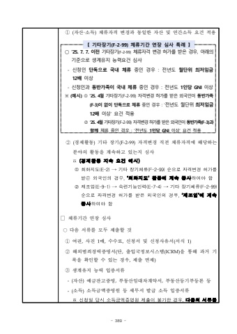 - 389 %u2460(%uc790%uc0b0%u00b7%uc18c%ub4dd)%uccb4%ub958%uc790%uaca9 %ubcc0%uacbd%uacfc %ub3d9%uc77c%ud55c %uc790%uc0b0 %ubc0f %uc5f0%uac04%uc18c%ub4dd %uc694%uac74 %uc801%uc6a9%u3010 %uae30%ud0c0%uc7a5%uae30(F-2-99) %uccb4%ub958%uae30%uac04 %uc5f0%uc7a5 %uc2ec%uc0ac %ud2b9%ub840 %u3011 %u25cb%u201925. 7. 7. %uc774%uc804%uae30%ud0c0%uc7a5%uae30(F-2-99)%uccb4%ub958%uc790%uaca9 %ubcc0%uacbd %ud5c8%uac00%ub97c%ubc1b%uc740 %uacbd%uc6b0, %uc544%ub798%uc758%uae30%uc900%uc73c%ub85c %uc0dd%uacc4%uc720%uc9c0 %ub2a5%ub825%uc694%uac74 %uc2ec%uc0ac - %uc2e0%uccad%uc778 %ub2e8%ub3c5%uc73c%ub85c%uad6d%ub0b4 %uccb4%ub958%uc911%uc778 %uacbd%uc6b0 : %uc804%ub144%ub3c4 %uc6d4%ub2e8%uc704 %ucd5c%uc800%uc784%uae08 12%ubc30%uc774%uc0c1 - %uc2e0%uccad%uc778%uacfc %ub3d9%ubc18%uac00%uc871%uc774 %uad6d%ub0b4 %uccb4%ub958%uc911%uc778 %uacbd%uc6b0 : %uc804%ub144%ub3c4 1%uc778%ub2f9 GNI%uc774%uc0c1%u203b (%uc608%uc2dc) %u0081 %u201925. 4%uc6d4%uae30%ud0c0%uc7a5%uae30(F-2-99) %uc790%uaca9%ubcc0%uacbd %ud5c8%uac00%ub97c %ubc1b%uc740 %uc678%uad6d%uc778%uc774 %ub3d9%ubc18%uac00%uc871(F-3)%uc774 %uc5c6%uc774%ub2e8%ub3c5%uc73c%ub85c %uccb4%ub958%uc911%uc778 %uacbd%uc6b0 : %u2018%uc804%ub144%ub3c4 %uc6d4%ub2e8%uc704 %ucd5c%uc800%uc784%uae0812%ubc30%uc774%uc0c1%u2019 %uc694%uac74 %uc801%uc6a9%u201a %u201925. 4%uc6d4%uae30%ud0c0%uc7a5%uae30(F-2-99) %uc790%uaca9%ubcc0%uacbd %ud5c8%uac00%ub97c %ubc1b%uc740 %uc678%uad6d%uc778%uc774 %ub3d9%ubc18%uac00%uc871(F-3)%uacfc %ud568%uaed8 %uccb4%ub958 %uc911%uc778 %uacbd%uc6b0 : %u2018%uc804%ub144%ub3c4 1%uc778%ub2f9 GNI%uc774%uc0c1%u2019 %uc694%uac74 %uc801%uc6a9%u2461(%uacbd%uc81c%ud65c%ub3d9)%uae30%ud0c0 %uc7a5%uae30(F-2-99)%uc790%uaca9%ubcc0%uacbd %uc9c1%uc804 %uccb4%ub958%uc790%uaca9%uc5d0 %ud574%ub2f9%ud558%ub294 %ubd84%uc57c%uc758 %ud65c%ub3d9%uc744 %uacc4%uc18d%ud558%uace0 %uc788%ub294%uc9c0 %uc2ec%uc0ac%u203b(%uacbd%uc81c%ud65c%ub3d9%uc9c0%uc18d%uc694%uac74%uc608%uc2dc)%u0081 %ud68c%ud654%uc9c0%ub3c4(E-2)%uae30%ud0c0%uc7a5%uae30%uccb4%ub958(F-2-99)%uc21c%uc790%uaca9%ubcc0%uacbd%ud5c8%uac00%ub97c%ubc1b%uc740%uc678%uad6d%uc778%uc758%uacbd%uc6b0,%u2018%ud68c%ud654%uc9c0%ub3c4%u2019%ud65c%ub3d9%uc5d0%uacc4%uc18d%uc885%uc0ac%ud558%uc5ec%uc57c%ud568%u201a %uc81c%uc870%uc5c5(E-9-1)%u2192%uc219%ub828%uae30%ub2a5%uc778%ub825(E-7-4)%u2192%uae30%ud0c0%uc7a5%uae30%uccb4%ub958(F-2-99)%uc21c%uc73c%ub85c%uc790%uaca9%ubcc0%uacbd%ud5c8%uac00%ub97c%ubc1b%uc740%uc678%uad6d%uc778%uc758%uacbd%uc6b0,%u2018%uc81c%uc870%uc5c5%u2019%uc5d0%uacc4%uc18d%uc885%uc0ac%ud558%uc5ec%uc57c%ud568%uccb4%ub958%uae30%uac04 %uc5f0%uc7a5 %uc2ec%uc0ac%u25cb %ub2e4%uc74c %uc11c%ub958%ub97c %ubaa8%ub450 %uc81c%ucd9c%ud560 %uac83%u2460%uc5ec%uad8c,%uc0ac%uc9c4 1%ub9e4,%uc218%uc218%ub8cc,%uc2e0%uccad%uc11c %ubc0f %uc2e0%uccad%uc0ac%uc720%uc11c(%uc11c%uc2dd 1)%u2461%ud574%uc678%ubc94%uc8c4%uacbd%ub825%uc99d%uba85%uc11c(%ub2e8,%ucd9c%uc785%uad6d%uc815%ubcf4%uc2dc%uc2a4%ud15c(ICRM)%uc744 %ud1b5%ud574 %uacfc%uac70 %uae30%ub85d%uc744 %ud655%uc778%ud560 %uc218 %uc788%ub294 %uacbd%uc6b0,%uc81c%ucd9c %uba74%uc81c)%u2462%uc0dd%uacc4%uc720%uc9c0 %ub2a5%ub825 %uc785%uc99d%uc11c%ub958-(%uc790%uc0b0)%uc608%uae08%uc794%uace0%uc99d%uba85,%ubd80%ub3d9%uc0b0%uc784%ub300%ucc28%uacc4%uc57d%uc11c,%ubd80%ub3d9%uc0b0%ub4f1%uae30%ubd80%ub4f1%ubcf8 %ub4f1-(%uc18c%ub4dd)%uc18c%ub4dd%uae08%uc561%uc99d%uba85%uc6d0 %ub4f1 %uc138%ubb34%uc11c %ubc1c%uae09 %uc18c%ub4dd %uc785%uc99d%uc11c%ub958%u203b%uc2e0%uccad%uc77c%ub2f9%uc2dc%uc18c%ub4dd%uae08%uc561%uc99d%uba85%uc6d0%uc81c%ucd9c%uc774%ubd88%uac00%ud55c%uacbd%uc6b0,%ub2e4%uc74c%uc758%uc11c%ub958%ub97c