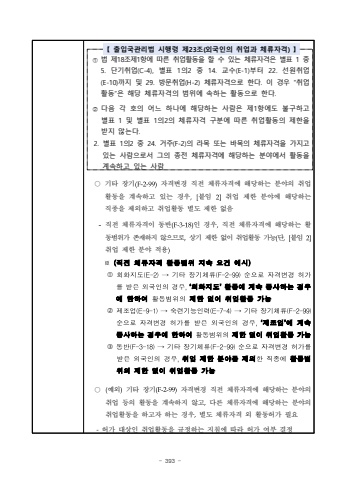 - 393 %u3010 %ucd9c%uc785%uad6d%uad00%ub9ac%ubc95 %uc2dc%ud589%ub839 %uc81c23%uc870(%uc678%uad6d%uc778%uc758 %ucde8%uc5c5%uacfc %uccb4%ub958%uc790%uaca9) %u3011 %u2780 %ubc95 %uc81c18%uc870%uc81c1%ud56d%uc5d0 %ub530%ub978 %ucde8%uc5c5%ud65c%ub3d9%uc744 %ud560 %uc218 %uc788%ub294 %uccb4%ub958%uc790%uaca9%uc740 %ubcc4%ud45c 1 %uc9115. %ub2e8%uae30%ucde8%uc5c5(C-4), %ubcc4%ud45c 1%uc7582 %uc911 14. %uad50%uc218(E-1)%ubd80%ud130 22. %uc120%uc6d0%ucde8%uc5c5(E-10)%uae4c%uc9c0 %ubc0f 29. %ubc29%ubb38%ucde8%uc5c5(H-2) %uccb4%ub958%uc790%uaca9%uc73c%ub85c %ud55c%ub2e4. %uc774 %uacbd%uc6b0 %u201c%ucde8%uc5c5%ud65c%ub3d9%u201d%uc740 %ud574%ub2f9 %uccb4%ub958%uc790%uaca9%uc758 %ubc94%uc704%uc5d0 %uc18d%ud558%ub294 %ud65c%ub3d9%uc73c%ub85c %ud55c%ub2e4.%u2781 %ub2e4%uc74c %uac01 %ud638%uc758 %uc5b4%ub290 %ud558%ub098%uc5d0 %ud574%ub2f9%ud558%ub294 %uc0ac%ub78c%uc740 %uc81c1%ud56d%uc5d0%ub3c4 %ubd88%uad6c%ud558%uace0 %ubcc4%ud45c 1 %ubc0f %ubcc4%ud45c 1%uc7582%uc758 %uccb4%ub958%uc790%uaca9 %uad6c%ubd84%uc5d0 %ub530%ub978 %ucde8%uc5c5%ud65c%ub3d9%uc758 %uc81c%ud55c%uc744 %ubc1b%uc9c0 %uc54a%ub294%ub2e4.2. %ubcc4%ud45c 1%uc7582 %uc911 24. %uac70%uc8fc(F-2)%uc758 %ub77c%ubaa9 %ub610%ub294 %ubc14%ubaa9%uc758 %uccb4%ub958%uc790%uaca9%uc744 %uac00%uc9c0%uace0%uc788%ub294 %uc0ac%ub78c%uc73c%ub85c%uc11c %uadf8%uc758 %uc885%uc804 %uccb4%ub958%uc790%uaca9%uc5d0 %ud574%ub2f9%ud558%ub294 %ubd84%uc57c%uc5d0%uc11c %ud65c%ub3d9%uc744%uacc4%uc18d%ud558%uace0 %uc788%ub294 %uc0ac%ub78c%u25cb%uae30%ud0c0 %uc7a5%uae30(F-2-99)%uc790%uaca9%ubcc0%uacbd %uc9c1%uc804 %uccb4%ub958%uc790%uaca9%uc5d0 %ud574%ub2f9%ud558%ub294 %ubd84%uc57c%uc758 %ucde8%uc5c5 %ud65c%ub3d9%uc744 %uacc4%uc18d%ud558%uace0 %uc788%ub294 %uacbd%uc6b0,[%ubd99%uc784 2]%ucde8%uc5c5 %uc81c%ud55c %ubd84%uc57c%uc5d0 %ud574%ub2f9%ud558%ub294 %uc9c1%uc885%uc744 %uc81c%uc678%ud558%uace0 %ucde8%uc5c5%ud65c%ub3d9 %ubcc4%ub3c4 %uc81c%ud55c %uc5c6%uc74c-%uc9c1%uc804 %uccb4%ub958%uc790%uaca9%uc774 %ub3d9%ubc18(F-3-18)%uc778 %uacbd%uc6b0,%uc9c1%uc804 %uccb4%ub958%uc790%uaca9%uc5d0 %ud574%ub2f9%ud558%ub294 %ud65c%ub3d9%ubc94%uc704%uac00 %uc874%uc7ac%ud558%uc9c0 %uc54a%uc73c%ubbc0%ub85c,%uc0c1%uae30 %uc81c%ud55c %uc5c6%uc774 %ucde8%uc5c5%ud65c%ub3d9 %uac00%ub2a5(%ub2e8,[%ubd99%uc784 2]%ucde8%uc5c5 %uc81c%ud55c %ubd84%uc57c %uc801%uc6a9)%u203b(%uc9c1%uc804%uccb4%ub958%uc790%uaca9%ud65c%ub3d9%ubc94%uc704%uc9c0%uc18d%uc694%uac74%uc608%uc2dc)%u0081 %ud68c%ud654%uc9c0%ub3c4(E-2)%u2192%uae30%ud0c0%uc7a5%uae30%uccb4%ub958(F-2-99)%uc21c%uc73c%ub85c%uc790%uaca9%ubcc0%uacbd%ud5c8%uac00%ub97c%ubc1b%uc740%uc678%uad6d%uc778%uc758%uacbd%uc6b0,%u2018%ud68c%ud654%uc9c0%ub3c4%u2019%ud65c%ub3d9%uc5d0%uacc4%uc18d%uc885%uc0ac%ud558%ub294%uacbd%uc6b0%uc5d0%ud55c%ud558%uc5ec%ud65c%ub3d9%ubc94%uc704%uc758%uc81c%ud55c%uc5c6%uc774%ucde8%uc5c5%ud65c%ub3d9%uac00%ub2a5%u201a %uc81c%uc870%uc5c5(E-9-1)%u2192%uc219%ub828%uae30%ub2a5%uc778%ub825(E-7-4)%u2192%uae30%ud0c0%uc7a5%uae30%uccb4%ub958(F-2-99)%uc21c%uc73c%ub85c%uc790%uaca9%ubcc0%uacbd%ud5c8%uac00%ub97c%ubc1b%uc740%uc678%uad6d%uc778%uc758%uacbd%uc6b0,%u2018%uc81c%uc870%uc5c5%u2019%uc5d0%uacc4%uc18d%uc885%uc0ac%ud558%ub294%uacbd%uc6b0%uc5d0%ud55c%ud558%uc5ec%ud65c%ub3d9%ubc94%uc704%uc758%uc81c%ud55c%uc5c6%uc774%ucde8%uc5c5%ud65c%ub3d9%uac00%ub2a5%u0192 %ub3d9%ubc18(F-3-18)%u2192%uae30%ud0c0%uc7a5%uae30%uccb4%ub958(F-2-99)%uc21c%uc73c%ub85c%uc790%uaca9%ubcc0%uacbd%ud5c8%uac00%ub97c%ubc1b%uc740%uc678%uad6d%uc778%uc758%uacbd%uc6b0,%ucde8%uc5c5%uc81c%ud55c%ubd84%uc57c%ub97c%uc81c%uc678%ud55c%uc9c1%uc885%uc5d0%ud65c%ub3d9%ubc94%uc704%uc758%uc81c%ud55c%uc5c6%uc774%ucde8%uc5c5%ud65c%ub3d9%uac00%ub2a5%u25cb(%uc608%uc678)%uae30%ud0c0 %uc7a5%uae30(F-2-99)%uc790%uaca9%ubcc0%uacbd %uc9c1%uc804 %uccb4%ub958%uc790%uaca9%uc5d0 %ud574%ub2f9%ud558%ub294 %ubd84%uc57c%uc758%ucde8%uc5c5 %ub4f1%uc758 %ud65c%ub3d9%uc744 %uacc4%uc18d%ud558%uc9c0 %uc54a%uace0,%ub2e4%ub978 %uccb4%ub958%uc790%uaca9%uc5d0 %ud574%ub2f9%ud558%ub294 %ubd84%uc57c%uc758%ucde8%uc5c5%ud65c%ub3d9%uc744 %ud558%uace0%uc790 %ud558%ub294 %uacbd%uc6b0,%ubcc4%ub3c4 %uccb4%ub958%uc790%uaca9 %uc678 %ud65c%ub3d9%ud5c8%uac00 %ud544%uc694-%ud5c8%uac00 %ub300%uc0c1%uc778 %ucde8%uc5c5%ud65c%ub3d9%uc744 %uaddc%uc815%ud558%ub294 %uc9c0%uce68%uc5d0 %ub530%ub77c %ud5c8%uac00 %uc5ec%ubd80 %uacb0%uc815