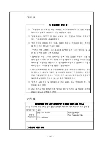 - 395 %u3010%ubd99%uc784 2%u3011%uc11c%uc2dd 1%u3011%uc7a5%uae30%uccb4%ub958%ub97c %uc704%ud55c %uac70%uc8fc %uccb4%ub958%uc790%uaca9(F-2) %ubcc0%uacbd%u00b7%uc5f0%uc7a5 %uc2e0%uccad %uc0ac%uc720%uc11c%u203b %ub3d9 %uc0ac%uc720%uc11c%uc5d0 %ud5c8%uc704 %uae30%uc7ac%ud55c %uacbd%uc6b0 %ucd9c%uc785%uad6d%uad00%ub9ac%ubc95%uc5d0 %uc81c89%uc870%uc5d0 %ub530%ub77c %uccb4%ub958%uc790%uaca9 %ucde8%uc18c %ub4f1%uc758 %ubd88%uc774%uc775%uc744 %ubc1b%uc744 %uc218 %uc788%uc74c%uc2e0%uccad%uc778Applicant%uc131%uba85 Full Name%uc678%uad6d%uc778%ub4f1%ub85d%ubc88%ud638Alien Registration No.%uc8fc%uc18c Address%u25a1 %ucd9c%uc785%uad6d %uc0ac%ud56d %uad00%ub828 %u226a %ucde8%uc5c5%uc81c%ud55c %ubd84%uc57c %u226b%u25cb %uff62%uc0ac%ud589%ud589%uc704 %ub4f1 %uaddc%uc81c %ubc0f %ucc98%ubc8c %ud2b9%ub840%ubc95%uff63 %uc81c2%uc870%uc81c1%ud56d%uc81c1%ud638 %ubc0f %ub3d9%ubc95 %uc2dc%ud589%ub839%uc81c1%uc870%uc7582 %ub4f1%uc5d0%uc11c %uaddc%uc815%ud558%uace0 %uc788%ub294 %uc0ac%ud589%ud589%uc704 %uc601%uc5c5%u25cb %uff62%uc2dd%ud488%uc704%uc0dd%ubc95%uff63 %uc81c36%uc870 %ubc0f %ub3d9%ubc95 %uc2dc%ud589%ub839 %uc81c21%uc870%uc81c8%ud638 %ub4f1%uc5d0%uc11c %uaddc%uc815%ud558%uace0 %uc788%ub294 %ub2e8%ub780%uc8fc%uc810%uc601%uc5c5, %uc720%ud765%uc8fc%uc810%uc601%uc5c5%u25cb %uff62%ud48d%uc18d%uc601%uc5c5%uc758 %uaddc%uc81c%uc5d0 %uad00%ud55c %ubc95%ub960%uff63 %uc81c2%uc870 %ub4f1%uc5d0%uc11c %uaddc%uc815%ud558%uace0 %uc788%ub294 %ud48d%uc18d%uc601%uc5c5 %uc911 %uc120%ub7c9%ud55c %ud48d%uc18d%uc5d0 %ubc18%ud558%ub294 %uc601%uc5c5- %uff62%uc2dd%ud488%uc704%uc0dd%ubc95 %uc2dc%ud589%ub839%uff63 %uc81c21%uc870%uc81c8%ud638 %ub2e4%ubaa9%uc5d0 %ub530%ub978 %ub2e8%ub780%uc8fc%uc810%uc601%uc5c5 %ubc0f %uac19%uc740 %ud638 %ub77c%ubaa9%uc5d0 %ub530%ub978 %uc720%ud765%uc8fc%uc810%uc601%uc5c5- %ubd88%ud2b9%uc815%ud55c %uc0ac%ub78c %uc0ac%uc774%uc758 %uc2e0%uccb4%uc801%uc778 %uc811%ucd09 %ub610%ub294 %uc740%ubc00%ud55c %ubd80%ubd84%uc758 %ub178%ucd9c %ub4f1 %uc131%uc801 %ud589%uc704%uac00 %uc774%ub8e8%uc5b4%uc9c0%uac70%ub098 %uc774%uc640 %uc720%uc0ac%ud55c %ud589%uc704%uac00 %uc774%ub8e8%uc5b4%uc9c8 %uc6b0%ub824%uac00 %uc788%ub294 %uc11c%ube44%uc2a4%ub97c %uc81c%uacf5%ud558%ub294 %uc601%uc5c5%uc73c%ub85c%uc11c %uccad%uc18c%ub144%ubcf4%ud638%uc704%uc6d0%ud68c%uac00 %uacb0%uc815%ud558%uace0 %uc5ec%uc131%uac00%uc871%ubd80%uc7a5%uad00%uc774 %uace0%uc2dc%ud55c %uccad%uc18c%ub144 %ucd9c%uc785%u00b7%uace0%uc6a9%uae08%uc9c0%uc5c5%uc18c- %uccad%uc18c%ub144%uc720%ud574%ub9e4%uccb4%ubb3c %ubc0f %uccad%uc18c%ub144%uc720%ud574%uc57d%ubb3c %ub4f1%uc744 %uc81c%uc791%u00b7%uc0dd%uc0b0%u00b7%uc720%ud1b5%ud558%ub294 %uc601%uc5c5 %ub4f1 %uccad%uc18c%ub144%uc758 %ucd9c%uc785%uacfc %uace0%uc6a9%uc774 %uccad%uc18c%ub144%uc5d0%uac8c %uc720%ud574%ud558%ub2e4%uace0 %uc778%uc815%ub418%ub294 %uc601%uc5c5%uc73c%ub85c%uc11c %ub300%ud1b5%ub839%ub839%uc73c%ub85c %uc815%ud558%ub294 %uae30%uc900%uc5d0 %ub530%ub77c %uccad%uc18c%ub144%ubcf4%ud638%uc704%uc6d0%ud68c%uac00 %uacb0%uc815%ud558%uace0 %uc5ec%uc131%uac00%uc871%ubd80%uc7a5%uad00%uc774 %uace0%uc2dc%ud55c %uccad%uc18c%ub144 %ucd9c%uc785%u00b7%uace0%uc6a9%uae08%uc9c0%uc5c5%uc18c%u25cb %uff62%ud559%uc6d0%uc758 %uc124%ub9bd%u00b7%uc6b4%uc601 %ubc0f %uacfc%uc678%uad50%uc2b5%uc5d0 %uad00%ud55c %ubc95%ub960%uff63 %uc5d0%uc11c %uaddc%uc815%ud558%uace0 %uc788%ub294 %uac1c%uc778%uacfc%uc678 %uad50%uc2b5 %ud589%uc704%u25cb %uae30%ud0c0 %uccb4%ub958%uc790%uaca9%uc758 %ud65c%ub3d9%ubc94%uc704%ub97c %ubc97%uc5b4%ub098 %ubc95%ubb34%ubd80%uc7a5%uad00%uc774 %uadf8 %ucde8%uc5c5%uc744 %uc81c%ud55c%ud560 %ud544%uc694%uac00 %uc788%ub2e4%uace0 %uc778%uc815%ud558%ub294 %ubd84%uc57c