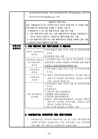 - 399 (%ud55c%uad6d%uc774%ubbfc%uc601%uc8fc%uc801%uaca9%uacfc%uc815),%ud55c%uad6d%uc774%ubbfc%uadc0%ud654%uc801%uaca9%uc2dc%ud5d8 %ud569%uaca9%uc99d(KINAT),%ud55c%uad6d%uc774%ubbfc%uc601%uc8fc%uc801%uaca9%uc2dc%ud5d8 %ud569%uaca9%uc99d(KIPRAT)%ub3c4 %uc778%uc815 <%uccb4%ub958%ud5c8%uac00 %ud2b9%ub840 %ub300%uc0c1>%ucd5c%ucd08 %uc2dc%ud589%uc77c(2021.01.28.) %uc774%uc804%uc5d0 %uc790%ub140%uac00 %uc131%ub144%uc774 %ub428%uc5d0 %ub530%ub77c %uc774 %uc9c0%uce68%uc744 %uc801%uc6a9%ud558%uc5ec %uccb4%ub958%uc790%uaca9 %ubcc0%uacbd%ud5c8%uac00%ub97c %uc2e0%uccad%ud560 %uc218 %uc5c6%uc5c8%ub358 %uc0ac%ub78c %uc911%u3260 %ubc29%ubb38%ub3d9%uac70(F-1) %ub4f1 %ub2e4%ub978 %uccb4%ub958%uc790%uaca9%uc73c%ub85c %uccb4%ub958 %uc911%uc778 %uc0ac%ub78c%u3261 %uae30%uc874 %uccb4%ub958%uc790%uaca9%uc758 %uc5f0%uc7a5 %ub610%ub294 %ub2e4%ub978 %uccb4%ub958%uc790%uaca9%uc73c%ub85c %ubcc0%uacbd%uc744 %uc2e0%uccad%ud558%uc600%uc73c%ub098, %uc790%ub140%uac00 %uc131%ub144%uc774 %ub418%uc5c8%ub2e4%ub294 %uc774%uc720%ub9cc%uc73c%ub85c %ubd88%ud5c8%ucc98%ubd84%uc744 %ubc1b%uc740 %uc0ac%ub78c%u3262 %uae30%uc874 %uccb4%ub958%uc790%uaca9%uc758 %uc5f0%uc7a5 %ub610%ub294 %ub2e4%ub978 %uccb4%ub958%uc790%uaca9%uc73c%ub85c %ubcc0%uacbd%uc744 %uc2e0%uccad%ud558%uc9c0 %uc54a%uc740 %uc0ac%ub78c%u21d2 2022.01.27.%uae4c%uc9c0 %uccb4%ub958%ud5c8%uac00 %uc2e0%uccad %ud5c8%uc6a9%uccb4%ub958%uae30%uac04%uc5f0%uc7a5%ud5c8%uac001. %uc544%ub798 %ud574%ub2f9%uc790%uc5d0 %ub300%ud55c %uccb4%ub958%uae30%uac04%uc5f0%uc7a5 %uc2dc %uc81c%ucd9c%uc11c%ub9582. %uc219%ub828%uc0dd%uc0b0%uae30%ub2a5 %uc678%uad6d%uc778%ub825%uc5d0 %ub300%ud55c %uccb4%ub958%uae30%uac04%uc5f0%uc7a5%u261e%uc219%ub828%uc0dd%uc0b0%uae30%ub2a5 %uac70%uc8fc%uc778%ub825 %uccb4%ub958%uc790%uaca9%uc740 %u201819.10.1.%ubd80%ub85c %ud3d0%uc9c0%ub418%uc5c8%uae30%uc5d0 %uae30%uc874%uc5d0 %ud5c8%uac00%ubc1b%uc740 %uc219%ub828%uc0dd%uc0b0%uae30%ub2a5 %uac70%uc8fc %uc678%uad6d%uc778%ub825%uc740 %uae30%ud0c0 %uc7a5%uae30%uccb4%ub958%uc790%uc5d0 %ub300%ud55c %uac70%uc8fc %uccb4%ub958%uae30%uac04 %uc5f0%uc7a5%ud5c8%uac00%uc758 %uaddc%uc815%uc5d0 %ub530%ub984%uad6d%ubbfc%uc758 %ubbf8%uc131%ub144%uc790%ub140(F-2-2)%u2460%uc2e0%uccad%uc11c(%ubcc4%uc9c0 34%ud638 %uc11c%uc2dd),%uc5ec%uad8c %ubc0f %uc678%uad6d%uc778%ub4f1%ub85d%uc99d,%uc218%uc218%ub8cc%u2461%uac00%uc871%uad00%uacc4 %uc785%uc99d %uc11c%ub958%uc601%uc8fc%uad8c%uc790%uc758 %ubc30%uc6b0%uc790 %ubc0f %ubbf8%uc131%ub144%uc790%ub140(F-2-3)%u2460%uc2e0%uccad%uc11c(%ubcc4%uc9c0 34%ud638 %uc11c%uc2dd),%uc5ec%uad8c %ubc0f %uc678%uad6d%uc778%ub4f1%ub85d%uc99d,%uc218%uc218%ub8cc%u2461%ud63c%uc778%uc0ac%uc2e4%uc774 %ub4f1%uc7ac%ub41c %uac00%uc871%uad00%uacc4 %uae30%ub85d%uc0ac%ud56d%uc5d0 %uad00%ud55c %uc99d%uba85%uc11c%u2462%uccb4%ub958%uc9c0 %uc785%uc99d%uc11c%ub958(%uc784%ub300%ucc28%uacc4%uc57d%uc11c %ub4f1)%ub09c%ubbfc%uc778%uc815%uc790(F-2-4)%u2460%uc2e0%uccad%uc11c(%ubcc4%uc9c0 34%ud638 %uc11c%uc2dd),%uc5ec%uad8c %ubc0f %uc678%uad6d%uc778%ub4f1%ub85d%uc99d,%uc218%uc218%ub8cc%u2461%uccb4%ub958%uc9c0 %uc785%uc99d%uc11c%ub958(%uc784%ub300%ucc28%uacc4%uc57d%uc11c,%uc219%uc18c%uc81c%uacf5 %ud655%uc778%uc11c,%uccb4%ub958%uae30%uac04 %ub9cc%ub8cc%uc608%uace0 %ud1b5%uc9c0%uc6b0%ud3b8%ubb3c,%uacf5%uacf5%uc694%uae08 %ub0a9%ubd80%uc601%uc218%uc99d,%uae30%uc219%uc0ac%ube44 %uc601%uc218%uc99d %ub4f1)%uace0%uc561%ud22c%uc790%uc790(F-2-5)%uae30%ud0c0 %uc7a5%uae30%uccb4%ub958%uc790(F-2-99)%u2460%uc2e0%uccad%uc11c(%ubcc4%uc9c0 34%ud638 %uc11c%uc2dd),%uc5ec%uad8c %ubc0f %uc678%uad6d%uc778%ub4f1%ub85d%uc99d,%uc218%uc218%ub8cc%u2461%uc2e0%uc6d0%ubcf4%uc99d%uc11c%u2462%uc5f0%uac04%uc18c%ub4dd %uad00%ub828 %uc11c%ub958(%ud574%ub2f9%uc790)%u2463%uacbd%uc81c%ud65c%ub3d9 %uc785%uc99d%uc11c%ub958(%ud574%ub2f9%uc790)%u2464%uae30%ubcf8%uc18c%uc591 %uc785%uc99d%uc11c%ub958(%ud574%ub2f9%uc790)%u2465%uccb4%ub958%uc9c0 %uc785%uc99d%uc11c%ub958(%uc784%ub300%ucc28%uacc4%uc57d%uc11c,%uc219%uc18c%uc81c%uacf5 %ud655%uc778%uc11c,%uccb4%ub958%uae30%uac04 %ub9cc%ub8cc%uc608%uace0 %ud1b5%uc9c0%uc6b0%ud3b8%ubb3c,%uacf5%uacf5%uc694%uae08 %ub0a9%ubd80%uc601%uc218%uc99d,%uae30%uc219%uc0ac%ube44 %uc601%uc218%uc99d %ub4f1)%u2466%uae30%ud0c0 %uc2ec%uc0ac%uc5d0 %ud544%uc694%ud558%ub2e4%uace0 %uc778%uc815%ud558%ub294 %uc11c%ub958