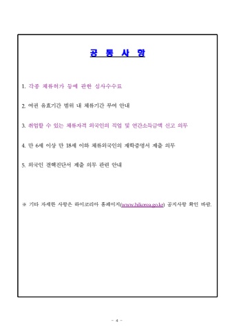 - 4 -%uacf5 %ud1b5 %uc0ac %ud56d1.%uac01%uc885 %uccb4%ub958%ud5c8%uac00 %ub4f1%uc5d0 %uad00%ud55c %uc2ec%uc0ac%uc218%uc218%ub8cc2.%uc5ec%uad8c %uc720%ud6a8%uae30%uac04 %ubc94%uc704 %ub0b4 %uccb4%ub958%uae30%uac04 %ubd80%uc5ec %uc548%ub0b43.%ucde8%uc5c5%ud560 %uc218 %uc788%ub294 %uccb4%ub958%uc790%uaca9 %uc678%uad6d%uc778%uc758 %uc9c1%uc5c5 %ubc0f %uc5f0%uac04%uc18c%ub4dd%uae08%uc561 %uc2e0%uace0 %uc758%ubb344.%ub9cc 6%uc138 %uc774%uc0c1 %ub9cc 18%uc138 %uc774%ud558 %uccb4%ub958%uc678%uad6d%uc778%uc758 %uc7ac%ud559%uc99d%uba85%uc11c %uc81c%ucd9c %uc758%ubb345.%uc678%uad6d%uc778 %uacb0%ud575%uc9c4%ub2e8%uc11c %uc81c%ucd9c %uc758%ubb34 %uad00%ub828 %uc548%ub0b4%u203b%uae30%ud0c0 %uc790%uc138%ud55c %uc0ac%ud56d%uc740 %ud558%uc774%ucf54%ub9ac%uc544 %ud648%ud398%uc774%uc9c0(www.hikorea.go.kr)%uacf5%uc9c0%uc0ac%ud56d %ud655%uc778 %ubc14%ub78c
