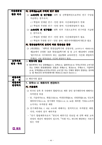 - 40 -%uc2dc%uac04%uc81c%ucde8%uc5c5%ud65c%ub3d9%ud5c8%uac00%uc544.%uc720%ud559%uc0dd(D-2)%uc758 %uc218%uc775%uc801 %uc5f0%uad6c %ud65c%ub3d9%u274d(%uc18c%uc18d%ub300%ud559 %ub0b4 %uc5f0%uad6c%ud65c%ub3d9) %ub300%ud559 %ubc0f %uc0b0%ud559%ud611%ub825%ub2e8%uc73c%ub85c%ubd80%ud130 %uc5f0%uad6c %uc218%ub2f9%uc744%uc9c0%uae09%ubc1b%ub294 %uacbd%uc6b0%ub85c%uc11c,%u2170) %ud559%uc5c5%uacfc %uc5f0%uacc4%ub41c %uc5f0%uad6c%u00b7%uc778%ud134 %ucc38%uc5ec: %uc2dc%uac04%uc81c%ucde8%uc5c5%ud5c8%uac00 %uba74%uc81c%u2171) %ud559%uc5c5%uacfc %ubb34%uad00%ud55c %uc5f0%uad6c%u00b7%uc778%ud134 %ucc38%uc5ec: %uc2dc%uac04%uc81c%ucde8%uc5c5%ud5c8%uac00 %ud544%uc694%u274d(%uc18c%uc18d%ub300%ud559 %uc678 %uc5f0%uad6c%ud65c%ub3d9) %ub300%ud559 %uc678%ubd80 %uae30%uad00%uc73c%ub85c%ubd80%ud130 %uc5f0%uad6c%ube44%ub97c %uc9c0%uae09%ubc1b%ub294 %uacbd%uc6b0%ub85c%uc11c,%u2170) %ud559%uc5c5%uacfc %uc5f0%uacc4%ub41c %uc5f0%uad6c%u00b7%uc778%ud134 %ucc38%uc5ec: %uc2dc%uac04%uc81c%ucde8%uc5c5%ud5c8%uac00 %ud544%uc694%u2171) %ud559%uc5c5%uacfc %ubb34%uad00%ud55c %uc5f0%uad6c%u00b7%uc778%ud134 %ucc38%uc5ec: %uccb4%ub958%uc790%uaca9%uc678%ud65c%ub3d9%ud5c8%uac00(E-3) %ud544%uc694%uc790.%ud604%uc7a5%uc2e4%uc2b5%ud559%uae30%uc81c %uc6b4%uc601%uc5d0 %ub530%ub978 %ud604%uc7a5%uc2e4%uc2b5 %ud65c%ub3d9%u274d (%ub300%uc0c1%ud65c%ub3d9)%u300c%ub300%ud559%uc0dd %ud604%uc7a5%uc2e4%uc2b5%ud559%uae30%uc81c %uc6b4%uc601%uaddc%uc815%u300d(%uad50%uc721%ubd80%uace0%uc2dc %uc81c2022-1%ud638)%uc81c2%uc870%uc5d0%uc11c %uaddc%uc815%ud55c %u2018%ud45c%uc900 %ud604%uc7a5%uc2e4%uc2b5%ud559%uae30%uc81c%u2019%ubc0f %ub3d9 %uace0%uc2dc %uc81c3%uc870%uc5d0%uc11c %uaddc%uc815%ud55c%u2018%ud544%uc218%uc801%uc73c%ub85c %uc774%uc218%ud558%uc5ec%uc57c %ud558%ub294 %uc2e4%uc2b5%ud615%ud0dc %uad50%uc721%uacfc%uc815%u2019%uc740 %uc2dc%uac04%uc81c %ucde8%uc5c5%ud5c8%uac00%uba74%uc81c(%ub2e8,%uc790%uc728 %ud604%uc7a5%uc2e4%uc2b5%uc740 %uc2dc%uac04%uc81c %ucde8%uc5c5%ud5c8%uac00 %ud544%uc694)%uadfc%ubb34%ucc98%uc758%ubcc0%uacbd%u2024%ucd94%uac00%u274d%ud574%ub2f9%uc0ac%ud56d %uc5c6%uc74c%u203b %uc601%ub9ac%ubaa9%uc801%uc774 %uc544%ub2cc %ubb38%ud654%uc608%uc220(D-1), %uc720%ud559(D-2), %uc77c%ubc18%uc5f0%uc218(D-4) %uc790%uaca9%uc18c%uc9c0%uc790%uc758 %uc18c%uc18d%uae30%uad00 %ub610%ub294 %ub2e8%uccb4%uc758 %ubcc0%uacbd(%uba85%uce6d%ubcc0%uacbd %ud3ec%ud568)%uacfc %ucde8%uc7ac(D-5), %uc885%uad50(D-6), %uc8fc%uc7ac(D-7), %uae30%uc5c5%ud22c%uc790(D-8), %ubb34%uc5ed%uacbd%uc601(D-9)%uc790%uaca9%uc18c%uc9c0%uc790%uc758 %uc18c%uc18d%uae30%uad00 %ub610%ub294 %ub2e8%uccb4%uc758 %uba85%uce6d%uc774 %ubcc0%uacbd%ub418%ub294 %uacbd%uc6b0%uc5d0%ub294 %ubc95 %uc81c35%uc870%uc758 %uc678%uad6d%uc778%ub4f1%ub85d%uc0ac%ud56d %ubcc0%uacbd%uc2e0%uace0(%uc2dc%ud589%uaddc%uce59 %uc81c49%uc870%uc758 2)%uccb4%ub958%uc790%uaca9%ubd80%uc5ec%u274d%ud574%ub2f9%uc0ac%ud56d %uc5c6%uc74c%uccb4%ub958%uc790%uaca9%ubcc0%uacbd%ud5c8%uac00%uf000%ubaa9%ucc281. %uc720%ud559(D-2)%uccb4%ub958%uc790%uaca9 %ubcc0%uacbd%ud5c8%uac00%uac00.%uae30%ubcf8%uc6d0%uce59%u274d %uc678%uad6d%uc778 %ub4f1%ub85d %ud6c4 %uad6d%ub0b4%uc5d0%uc11c %ud569%ubc95%uc801%uc73c%ub85c %uccb4%ub958 %uc911%uc778 %uc7a5%uae30%uccb4%ub958%uc790%uc5d0 %ub300%ud574%uc11c%ub294%uc790%uaca9%ubcc0%uacbd %ud5c8%uc6a9- %ub2e8, %uae30%uc220%uc5f0%uc218(D-3), %uacc4%uc808%uadfc%ub85c(E-8), %ube44%uc804%ubb38%ucde8%uc5c5(E-9), %uc120%uc6d0%ucde8%uc5c5(E-10), %uc778%ub3c4%uc801%uccb4%ub958%ud5c8%uac00%uc790(G-1-6), %uc7a5%uae30%uccb4%ub958 %uc544%ub3d9(G-1-8, 13, 14)%uc744 %uc81c%uc678%ud55c %uae30%ud0c0(G-1)%uc790%uaca9%uc18c%uc9c0%uc790%ub294 %uc790%uaca9%ubcc0%uacbd %uc81c%ud55c%u274d%ub2e8%uae30%uccb4%ub958%uc790(B, C %uacc4%uc5f4 %uc790%uaca9)%uc5d0 %ub300%ud574%uc11c%ub294 %uc6d0%uce59%uc801%uc73c%ub85c %uc790%uaca9%ubcc0%uacbd %uc81c%ud55c. %ub2e4%ub9cc, %uc544%ub798%uc758 %uacbd%uc6b0 %uc608%uc678%uc801%uc6a9- %u2460%ub2e8%uae30 %ud569%ubc95%uccb4%ub958%uc790%ub85c%uc11c %u2461%ubcf8%uc778%uc758 %uccb4%ub958%uae30%uac04 %ub9cc%ub8cc%uc77c %ub0b4 %uc9c4%ud559 %uc608%uc815 %uad50%uc721%uacfc%uc815%uc758 %uac1c%uac15%uc774 %uc608%uc815%ub418%uc5b4 %uc788%uc73c%uba70,%u2462%uc544%ub798 %uc5b4%ub290 %ud558%ub098%uc5d0 %ud574%ub2f9%ud558%ub294 %uc0ac%uc720%uac00%uc788%ub294 %uc0ac%ub78c