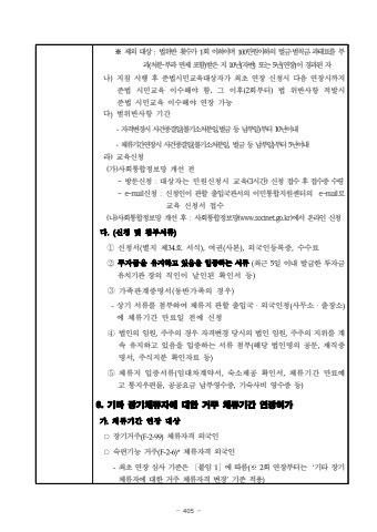 - 405 %u203b %uc81c%uc678 %ub300%uc0c1 :%ubc95%uc704%ubc18 %ud69f%uc218%uac00 1%ud68c %uc774%ud558%uc774%uba70 100%ub9cc%uc6d0%uc774%ud558%uc758 %ubc8c%uae08%u00b7%ubc94%uce59%uae08%uff65%uacfc%ud0dc%ub8cc%ub97c %ubd80%uacfc(%ucc98%ubd84%u00b7%ubd80%uacfc %uba74%uc81c %ud3ec%ud568)%ubc1b%uc740 %uc9c0 10%ub144(%uc790%ubcc0)%ub610%ub294 5%ub144(%uc5f0%uc7a5)%uc774 %uacbd%uacfc%ub41c %uc790%ub098)%uc9c0%uce68 %uc2dc%ud589 %ud6c4 %uc900%ubc95%uc2dc%ubbfc%uad50%uc721%ub300%uc0c1%uc790%uac00 %ucd5c%ucd08 %uc5f0%uc7a5 %uc2e0%uccad%uc2dc %ub2e4%uc74c %uc5f0%uc7a5%uc2dc%uae4c%uc9c0%uc900%ubc95 %uc2dc%ubbfc%uad50%uc721 %uc774%uc218%ud574%uc57c %ud568,%uadf8 %uc774%ud6c4(2%ud68c%ubd80%ud130)%ubc95 %uc704%ubc18%uc0ac%ud56d %uc801%ubc1c%uc2dc%uc900%ubc95 %uc2dc%ubbfc%uad50%uc721 %uc774%uc218%ud574%uc57c %uc5f0%uc7a5 %uac00%ub2a5%ub2e4)%ubc94%uc704%ubc18%uc0ac%ud56d %uae30%uac04 -%uc790%uaca9%ubcc0%uacbd%uc2dc %uc0ac%uac74%uc885%uacb0%uc77c(%ubd88%uae30%uc18c%ucc98%ubd84%uc77c,%ubc8c%uae08 %ub4f1 %ub0a9%ubd80%uc77c)%ubd80%ud130 10%ub144%uc774%ub0b4-%uccb4%ub958%uae30%uac04%uc5f0%uc7a5%uc2dc %uc0ac%uac74%uc885%uacb0%uc77c(%ubd88%uae30%uc18c%ucc98%ubd84%uc77c,%ubc8c%uae08 %ub4f1 %ub0a9%ubd80%uc77c)%ubd80%ud130 5%ub144%uc774%ub0b4%ub77c) %uad50%uc721%uc2e0%uccad(%uac00)%uc0ac%ud68c%ud1b5%ud569%uc815%ubcf4%ub9dd %uac1c%uc120 %uc804- %ubc29%ubb38%uc2e0%uccad: %ub300%uc0c1%uc790%ub294 %ubbfc%uc6d0%uc2e0%uccad%uc2dc %uad50%uc721(3%uc2dc%uac04) %uc2e0%uccad %uc811%uc218 %ud6c4 %uc811%uc218%uc99d %uc218%ub839- e-mail%uc2e0%uccad : %uc2e0%uccad%uc778%uc774 %uad00%ud560 %ucd9c%uc785%uad6d%uad00%uc11c%uc758%uc774%ubbfc%ud1b5%ud569%uc9c0%uc6d0%uc13c%ud130%uc758 e-mail%ub85c%uad50%uc721 %uc2e0%uccad%uc11c %uc811%uc218(%ub098)%uc0ac%ud68c%ud1b5%ud569%uc815%ubcf4%ub9dd %uac1c%uc120 %ud6c4 : %uc0ac%ud68c%ud1b5%ud569%uc815%ubcf4%ub9dd(www.socinet.go.kr)%uc5d0%uc11c%uc628%ub77c%uc778 %uc2e0%uccad%ub2e4.(%uc2e0%uccad %ubc0f %ucca8%ubd80%uc11c%ub958)%u2460%uc2e0%uccad%uc11c(%ubcc4%uc9c0 %uc81c34%ud638 %uc11c%uc2dd),%uc5ec%uad8c(%uc0ac%ubcf8),%uc678%uad6d%uc778%ub4f1%ub85d%uc99d,%uc218%uc218%ub8cc%u2461%ud22c%uc790%uae08%uc744%uc720%uc9c0%ud558%uace0 %uc788%uc74c%uc744 %uc785%uc99d%ud558%ub294 %uc11c%ub958(%ucd5c%uadfc 5%uc77c %uc774%ub0b4 %ubc1c%uae09%ud55c %ud22c%uc790%uae08%uc720%uce58%uae30%uad00 %uc7a5%uc758%uc9c1%uc778%uc774 %ub0a0%uc778%ub41c %ud655%uc778%uc11c %ub4f1)%u2462%uac00%uc871%uad00%uacc4%uc99d%uba85%uc11c(%ub3d9%ubc18%uac00%uc871%uc758 %uacbd%uc6b0)-%uc0c1%uae30 %uc11c%ub958%ub97c %ucca8%ubd80%ud558%uc5ec %uccb4%ub958%uc9c0 %uad00%ud560 %ucd9c%uc785%uad6d%u318d%uc678%uad6d%uc778%uccad(%uc0ac%ubb34%uc18c%u318d%ucd9c%uc7a5%uc18c)%uc5d0 %uccb4%ub958%uae30%uac04 %ub9cc%ub8cc%uc77c %uc804%uc5d0 %uc2e0%uccad%u2463%ubc95%uc778%uc758 %uc784%uc6d0,%uc8fc%uc8fc%uc758 %uacbd%uc6b0 %uc790%uaca9%ubcc0%uacbd %ub2f9%uc2dc%uc758 %ubc95%uc778 %uc784%uc6d0,%uc8fc%uc8fc%uc758 %uc9c0%uc704%ub97c%uacc4%uc18d %uc720%uc9c0%ud558%uace0 %uc788%uc74c%uc744 %uc785%uc99d%ud558%ub294 %uc11c%ub958 %ucca8%ubd80(%ud574%ub2f9 %ubc95%uc778%uba85%uc758 %uacf5%ubb38,%uc7ac%uc9c1%uc99d%uba85%uc11c,%uc8fc%uc2dd%uc9c0%ubd84 %ud655%uc778%uc790%ub8cc %ub4f1)%u2464%uccb4%ub958%uc9c0 %uc785%uc99d%uc11c%ub958(%uc784%ub300%ucc28%uacc4%uc57d%uc11c,%uc219%uc18c%uc81c%uacf5 %ud655%uc778%uc11c,%uccb4%ub958%uae30%uac04 %ub9cc%ub8cc%uc608%uace0 %ud1b5%uc9c0%uc6b0%ud3b8%ubb3c,%uacf5%uacf5%uc694%uae08 %ub0a9%ubd80%uc601%uc218%uc99d,%uae30%uc219%uc0ac%ube44 %uc601%uc218%uc99d %ub4f1)6. %uae30%ud0c0 %uc7a5%uae30%uccb4%ub958%uc790%uc5d0 %ub300%ud55c %uac70%uc8fc %uccb4%ub958%uae30%uac04 %uc5f0%uc7a5%ud5c8%uac00%uac00.%uccb4%ub958%uae30%uac04 %uc5f0%uc7a5 %ub300%uc0c1%u25cb%uc7a5%uae30%uac70%uc8fc(F-2-99)%uccb4%ub958%uc790%uaca9 %uc678%uad6d%uc778%u25cb%uc219%ub828%uae30%ub2a5 %uac70%uc8fc(F-2-6)*%uccb4%ub958%uc790%uaca9 %uc678%uad6d%uc778 -%ucd5c%ucd08 %uc5f0%uc7a5 %uc2ec%uc0ac %uae30%uc900%uc740 %u3014%ubd99%uc784 1%u3015%uc5d0 %ub530%ub984(%u203b2%ud68c %uc5f0%uc7a5%ubd80%ud130%ub294 %u2018%uae30%ud0c0 %uc7a5%uae30%uccb4%ub958%uc790%uc5d0 %ub300%ud55c %uac70%uc8fc %uccb4%ub958%uc790%uaca9 %ubcc0%uacbd%u2019%uae30%uc900 %uc801%uc6a9)