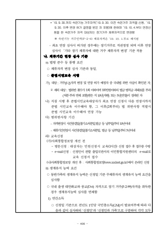 - 406 * %u201919.9.30.%uae4c%uc9c0 %uc219%ub828%uae30%ub2a5 %uac70%uc8fc%uc790%uaca9(%u201819.9.30. %uc774%uc804 %uc219%ub828%uac70%uc8fc %uc790%uaca9%uc744 %uc2e0%uccad, %u201919.9.30. %uc774%ud6c4 %ubcc0%uacbd %ud5c8%uac00 %uacb0%uc815%uc744 %ubc1b%uc740 %uc790 %ud3ec%ud568)%uc5d0 %ud55c%ud558%uba70 %u201919.10.4.%ubd80%ud130 %uc5f0%uc7a5%uc2e0%uccad%uc744 %ud55c %uc219%ub828%uac70%uc8fc %uc790%uaca9 %ub300%uc0c1%uc790%ub294 %uc7a5%uae30%uac70%uc8fc %uccb4%ub958%uc790%uaca9%uc73c%ub85c %ubcc0%uacbd%ud568%u203b %uc219%ub828%uae30%ub2a5 %uac70%uc8fc%uc778%ub825(F-2-6) %uccb4%ub958%uc790%uaca9%uc740 %u201819. 10. 1.%ubd80%ub85c %ud3d0%uc9c0%ub428-%ucd5c%ucd08 %uc5f0%uc7a5 %uc2ec%uc0ac%uc2dc %ud5c8%uac00%ub41c %uacbd%uc6b0%uc5d0%ub294 %uc7a5%uae30%uac70%uc8fc%ub85c %uc9c1%uad8c%uc815%uc815 %ub418%uba70 %uc774%ud6c4 %uc5f0%uc7a5 %uc2ec%uc0ac%uc2dc %u2018%uae30%ud0c0 %uc7a5%uae30 %uccb4%ub958%uc790%uc5d0 %ub300%ud55c %uac70%uc8fc %uccb4%ub958%uc790%uaca9 %ubcc0%uacbd%u2019%uae30%uc900 %uc801%uc6a9%ub098.%uccb4%ub958%uae30%uac04 %uc5f0%uc7a5 %uc2ec%uc0ac %uae30%uc900%ubc95%ub839 %uc900%uc218 %ub4f1 %ud488%ud589 %uc694%uac74%u25cb%uccb4%ub958%uc790%uaca9 %ubcc0%uacbd %uc2ec%uc0ac %uae30%uc900%uacfc %ub3d9%uc77c.%u25cb%uc900%ubc95%uc2dc%ubbfc%uad50%uc721 %uc2dc%ud589%uac00)%ub300%uc0c1 :%uac70%uc8fc(F-2)%uc790%uaca9 %ubcc0%uacbd %ubc0f %uc5f0%uc7a5 %ud5c8%uac00 %uc608%uc815%uc790 %uc911 %uad6d%ub0b4%ubc95 %uc704%ubc18 %uc0ac%uc2e4%uc774%ud655%uc778%ub41c %uc790.%u203b%uc81c%uc678 %ub300%uc0c1 :%ubc95%uc704%ubc18 %ud69f%uc218%uac00 1%ud68c %uc774%ud558%uc774%uba70 100%ub9cc%uc6d0%uc774%ud558%uc758 %ubc8c%uae08%u00b7%ubc94%uce59%uae08%uff65%uacfc%ud0dc%ub8cc%ub97c %ubd80%uacfc(%ucc98%ubd84%u00b7%ubd80%uacfc %uba74%uc81c %ud3ec%ud568)%ubc1b%uc740 %uc9c0 10%ub144(%uc790%ubcc0)%ub610%ub294 5%ub144(%uc5f0%uc7a5)%uc774 %uacbd%uacfc%ub41c %uc790%ub098)%uc9c0%uce68 %uc2dc%ud589 %ud6c4 %uc900%ubc95%uc2dc%ubbfc%uad50%uc721%ub300%uc0c1%uc790%uac00 %ucd5c%ucd08 %uc5f0%uc7a5 %uc2e0%uccad%uc2dc %ub2e4%uc74c %uc5f0%uc7a5%uc2dc%uae4c%uc9c0%uc900%ubc95 %uc2dc%ubbfc%uad50%uc721 %uc774%uc218%ud574%uc57c %ud568,%uadf8 %uc774%ud6c4(2%ud68c%ubd80%ud130)%ubc95 %uc704%ubc18%uc0ac%ud56d %uc801%ubc1c%uc2dc%uc900%ubc95 %uc2dc%ubbfc%uad50%uc721 %uc774%uc218%ud574%uc57c %uc5f0%uc7a5 %uac00%ub2a5%ub2e4)%ubc94%uc704%ubc18%uc0ac%ud56d %uae30%uac04 -%uc790%uaca9%ubcc0%uacbd%uc2dc %uc0ac%uac74%uc885%uacb0%uc77c(%ubd88%uae30%uc18c%ucc98%ubd84%uc77c,%ubc8c%uae08 %ub4f1 %ub0a9%ubd80%uc77c%ubd80%ud130 %ub144%uc774%ub0b4-%uccb4%ub958%uae30%uac04%uc5f0%uc7a5%uc2dc %uc0ac%uac74%uc885%uacb0%uc77c(%ubd88%uae30%uc18c%ucc98%ubd84%uc77c,%ubc8c%uae08 %ub4f1 %ub0a9%ubd80%uc77c)%ubd80%ud130 5%ub144%uc774%ub0b4%ub77c) %uad50%uc721%uc2e0%uccad(%uac00)%uc0ac%ud68c%ud1b5%ud569%uc815%ubcf4%ub9dd %uac1c%uc120 %uc804- %ubc29%ubb38%uc2e0%uccad: %ub300%uc0c1%uc790%ub294 %ubbfc%uc6d0%uc2e0%uccad%uc2dc %uad50%uc721(3%uc2dc%uac04) %uc2e0%uccad %uc811%uc218 %ud6c4 %uc811%uc218%uc99d %uc218%ub839- e-mail%uc2e0%uccad : %uc2e0%uccad%uc778%uc774 %uad00%ud560 %ucd9c%uc785%uad6d%uad00%uc11c%uc758%uc774%ubbfc%ud1b5%ud569%uc9c0%uc6d0%uc13c%ud130%uc758 e-mail%ub85c%uad50%uc721 %uc2e0%uccad%uc11c %uc811%uc218(%ub098)%uc0ac%ud68c%ud1b5%ud569%uc815%ubcf4%ub9dd %uac1c%uc120 %ud6c4 : %uc0ac%ud68c%ud1b5%ud569%uc815%ubcf4%ub9dd(www.socinet.go.kr)%uc5d0%uc11c%uc628%ub77c%uc778 %uc2e0%uccad%uc0dd%uacc4%uc720%uc9c0 %ub2a5%ub825 %uc694%uac74%u25cb%ub3d9%ubc18%uac00%uc871%uc758 %uc0dd%uacc4%uc720%uc9c0 %ub2a5%ub825%uc740 %uc2e0%uccad%uc77c %uae30%uc900 %uc8fc%uccb4%ub958%uc790%uc758 %uc0dd%uacc4%uc720%uc9c0 %ub2a5%ub825 %uc694%uac74%uc744%uc2ec%uc0ac%ud568%u25cb%uad6d%ub0b4 %ucd9c%uc0dd %ub300%ub9cc%ud654%uad50%uc640 %uc885%uad50(D-6)%uc790%uaca9%uc73c%ub85c %uc7a5%uae30 %uac70%uc8fc(F-2-99)%uc790%uaca9%uc744 %ucde8%ub4dd%ud55c %uacbd%uc6b0 %uc0dd%uacc4%uc720%uc9c0%ub2a5%ub825 %uc2ec%uc0ac%ub97c %uba74%uc81c%ud5681)%uc5f0%uac04%uc18c%ub4dd%u25cb%uc2e0%uccad%uc77c %uae30%uc900%uc73c%ub85c %uc804%ub144%ub3c4 1%uc778%ub2f9 %uad6d%ubbfc%ucd1d%uc18c%ub4dd(GNI)%uc774 %ubc1c%ud45c%uc5ec%ubd80%uc5d0 %ub530%ub77c %ub2e4%uc74c%uacfc %uac19%uc774 %uc2ec%uc0ac%ud558%ub418 %u2018%uc2e0%uccad%uc778%u2019%uacfc %u2018%uc2e0%uccad%uc778%uacfc %uac00%uc871%u2019%uc73c%ub85c %uad6c%ubd84%ud558%uc5ec %uac01%uac01 %ubaa8%ub450