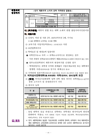 - 41 -%uccb4%ub958%uc790%uaca9%ubcc0%uacbd%ud5c8%uac00%uf000<%ub2e8%uae30 %uccb4%ub958%uc790%uaca9 %uc18c%uc9c0%uc790 %uc720%ud559 %uc790%uaca9%ubcc0%uacbd %uc77c%ub78c%ud45c>%uad6d%uc801%ud604 %uccb4%ub958%uc790%uaca9%uc77c%ubc18%uad6d%uac00%uace0%uc2dc 21%uac1c %uad6d%uac00 + %uc911%uc810%uad00%ub9ac 5%uac1c %uad6d%uac00%ub2e8%uae30B1/ B2 %u25cb%u00d7C-3 C31/C34%uc778%uc99d%ub300%u25cb%u00d7(%u201819.6.11 %ubcc0%uacbd)%ube44%uc778%uc99d%ub300%u25cb%u00d7C38%u25cb%u25cbC32~C33/C35~7,C39~10%u00d7%u00d7%ub098.(%ud5c8%uac00%uad8c%ud55c)%uccb4%ub958%uc9c0 %uad00%ud560 %ub610%ub294 %ub300%ud559 %uc18c%uc7ac%uc9c0 %uad00%ud560 %ucd9c%uc785%uad6d%uc678%uad6d%uc778%uad00%uc11c%uc7a5%ub2e4.%uc81c%ucd9c%uc11c%ub958%u274d %uc2e0%uccad%uc11c, %uc5ec%uad8c %ubc0f %uc0ac%ubcf8 1%ubd80, %ud45c%uc900%uaddc%uaca9%uc0ac%uc9c4 1%ub9e4, %uc218%uc218%ub8cc%u203b GKS %uc7a5%ud559%uc99d%uc11c %uc18c%uc9c0%uc790%ub294 %uc218%uc218%ub8cc %uba74%uc81c%u274d %uad50%uc721%uae30%uad00 %uc0ac%uc5c5%uc790%ub4f1%ub85d%uc99d(%ub610%ub294 %uace0%uc720%ubc88%ud638%uc99d)%uc0ac%ubcf8%u274d %ud45c%uc900%uc785%ud559%ud5c8%uac00%uc11c%u274d %ud559%ub825%uc694%uac74 %ubc0f %uc7ac%uc815%ub2a5%ub825 %uc785%uc99d%uc11c%ub958%u2776%uc5b4%ud559%uc5f0%uc218(D-4)%uc790%uaca9 %u2192 %uc720%ud559(D-2)%uc790%uaca9%uc73c%ub85c %ubcc0%uacbd%ud558%ub294 %uacbd%uc6b0- %uc774%uc804 %uacfc%uc815%uc758 %uc131%uc801(%ucd9c%uc11d/%uc5f0%uc218)%uc99d%uba85%uc11c %uc81c%ucd9c(%uc720%ud559%uc0dd%uc815%ubcf4%uc2dc%uc2a4%ud15c%uc5d0%uc11c %ud655%uc778%ub418%uc9c0 %uc54a%ub294 %uacbd%uc6b0)%u2777%uc815%ubd80%ucd08%uccad%uc7a5%ud559%uc0dd%uc774 %uccb4%ub958%uc790%uaca9 %ubcc0%uacbd%ud5c8%uac00%ub97c %uc2e0%uccad%ud55c %uacbd%uc6b0 - %ud559%ub825%uc99d%uba85%uc11c%ub294 %uc720%ud559%uc0dd %uad6d%uc801%uc5d0 %uad00%uacc4%uc5c6%uc774 %uad6d%ub9bd%uad6d%uc81c%uad50%uc721%uc6d0 %ub610%ub294 %ub300%ud559%uc5d0%uc11c%ubc1c%ud589%ud55c %uc0ac%ubcf8(%uc6d0%ubcf8%ub300%uc870%ud544)%uc9d5%uad6c%ub85c %ub300%uccb4(%uacf5%uc99d %ubd88%uc694)%u274d %uac00%uc871%uad00%uacc4 %uc785%uc99d%uc11c%ub958(%uc7ac%uc815%ub2a5%ub825 %uc785%uc99d%uc11c%ub958%ub85c %ubd80%ubaa8%uc758 %uc794%uace0%uc99d%uba85%uc11c %ub4f1%uc744 %uc81c%ucd9c%ud55c %uacbd%uc6b0)2. %ube44%uc790%uc2ec%uc0ac%uac15%ud654%ub300%ud559(%u820a.%ud558%uc704%ub300%ud559)%uc5b4%ud559(%ud55c%uad6d%uc5b4, %uc601%uc5b4)%ub2a5%ub825 %uc694%uac74%u274d(%ub300%uc0c1)%ube44%uc790%uc2ec%uc0ac%uac15%ud654%ub300%ud559 %uc785%ud559%u2027%uc9c4%ud559 %uc608%uc815 %uc678%uad6d%uc778 %uc720%ud559%uc0dd(D-2-1~8)%uc73c%ub85c %uc7a5%uad00 %uace0%uc2dc%uad6d%uac00 %ubc0f %uc911%uc810%uad00%ub9ac%uad6d%uac00 %uad6d%ubbfc%u274d%ud55c%uad6d%uc5b4 %ub2a5%ub825%uad6c %ubd84%uc0ac%ud68c%ud1b5%ud569%ud504%ub85c%uadf8%ub7a8(KIIP)%ud55c%uad6d%uc5b4%ub2a5%ub825 %uc2dc%ud5d8(TOPIK)%uc138%uc885%ud559%ub2f9%ud55c%uad6d%uc5b4%uacfc%uc815%uc804%ubb38%ud559%uc0ac %ubc0f%ubfcc%ub9ac%uc0b0%uc5c5%uc591%uc131%ud559%uacfc2%ub2e8%uacc4 %uc774%uc0c1 %uc774%uc218 %ub610%ub294 %uc0ac%uc804%ud3c9%uac00 41%uc810 %uc774%uc0c12%uae09 %uc774%uc0c1%ucd08%uae092 %uacfc%uc815 %uc774%uc0c1%ud559%uc0ac(%uc804%uacf5%uc2ec%ud654) %uc774%uc0c14%ub2e8%uacc4 %uc774%uc0c1 %uc774%uc218 %ub610%ub294 %uc0ac%uc804%ud3c9%uac00 81%uc810 %uc774%uc0c14%uae09 %uc774%uc0c1%uc911%uae092 %uacfc%uc815 %uc774%uc0c1(%uc644%ud654) %uc608%uccb4%ub2a5%ud559%uacfc3%ub2e8%uacc4 %uc774%uc0c1 %uc774%uc218 %ub610%ub294 %uc0ac%uc804%ud3c9%uac00 61%uc810 %uc774%uc0c13%uae09 %uc774%uc0c1%uc911%uae091 %uacfc%uc815 %uc774%uc0c1%uad50%ud658%ud559%uc0dd(%uad6d%ub0b4 %ub300%ud559 %ud559%uc704%uac00 %ubd80%uc5ec%ub418%uc9c0 %uc54a%ub294 %uad50%ud658%ud559%uc0dd%uc5d0 %ud55c%ud568)2%ub2e8%uacc4 %uc774%uc0c1 %uc774%uc218 %ub610%ub294 %uc0ac%uc804%ud3c9%uac00 41%uc810 %uc774%uc0c12%uae09 %uc774%uc0c1%ucd08%uae092 %uacfc%uc815 %uc774%uc0c1-%ub3d9%uc77c %ub300%ud559%uc758 %uc0c1%uae09 %uacfc%uc815%uc73c%ub85c %uc9c4%ud559%ud558%ub294 %uc720%ud559%uc0dd%uc740 %ud55c%uad6d%uc5b4%ub2a5%ub825 %ud55c%ub2e8%uacc4 %uc644%ud654%ud558%uc5ec %uc801%uc6a9(%ub2e8, %uc774%ubbf8 %uc644%ud654%ub41c %uae30%uc900%uc774 %uc801%uc6a9%ub41c %uc804%ubb38%ub300%ud559, %ubfcc%ub9ac%uc0b0%uc5c5%uc591%uc131%ud559%uacfc, %uc608%uccb4%ub2a5%ud559%uacfc%ub294 %uc911%ubcf5 %uc801%uc6a9%ud558%uc9c0 %uc54a%uc74c)%u203b %ud604%uc9c0 %uc138%uc885%ud559%ub2f9%uc5d0%uc11c %ubc1c%uae09%ud55c %uae30%ubcf8%uad50%uc721%uacfc%uc815 %uc218%ub8cc%uc99d%uc5d0 %ud55c%ud558%uba70, %uc720%ud559%uc0dd%uc774%uad6d%ub0b4 %uccb4%ub958%ud558%uba74%uc11c%ud574%uc678 %uc138%uc885%ud559%ub2f9%uc758 %uad50%uc721%uacfc%uc815%uc5d0 %uc628%ub77c%uc778%uc73c%ub85c %ucc38%uc5ec%ud55c %uacbd%uc6b0 %uc628%ub77c%uc778 %uc138%uc885%ud559%ub2f9%uc73c%ub85c %ud45c%uae30%ub418%uc9c0%uc54a%ub354%ub77c%ub3c4 %uc218%ub8cc%uc99d %ubd88%uc778%uc815