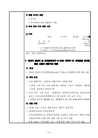- 411 7. %uc790%ub140%uac00 %uc131%ub144%uc774 %ub41c %uc790%ub140%uc591%uc721%uc790(F-6-2)%ub85c %uac70%uc8fc(F-2) %uc790%uaca9%ubcc0%uacbd %ud5c8%uac00%ub97c %ubc1b%uc740 %uc0ac%ub78c%uc758 %uccb4%ub958%uae30%uac04 %uc5f0%uc7a5%uac00.%ub300%uc0c1 %u25cb%uc790%ub140%uac00 %uc131%ub144%uc774 %ub41c %uc790%ub140%uc591%uc721%uc790%ub85c %uac70%uc8fc%uc790%uaca9%ubcc0%uacbd %ud5c8%uac00%ub97c %ubc1b%uc740 %uc0ac%ub78c%ub098.%uc790%uaca9 %uc694%uac74%u25cb%uad6d%ub0b4 %uc0dd%ud65c%uae30%ubc18:%uc2e0%uccad%uc778%uc758 %uc0dd%ud65c%uae30%ubc18%uc774 %uad6d%ub0b4%uc5d0 %ud615%uc131-%uc2e0%uccad%uc77c %uae30%uc900 5%ub144 %uc774%ub0b4 %ud574%uc678%uc5d0%uc11c %uccb4%ub958%ud55c %uae30%uac04%uc774 %uad6d%ub0b4%uc5d0%uc11c %uccb4%ub958%ud55c %uae30%uac04%uc744 %ucd08%uacfc%ud558%uc9c0 %uc54a%uc544%uc57c %ud568%u25cb%uad6d%ub0b4 %uc815%uc8fc %uae30%ubcf8 %uc694%uac74 :%ud488%ud589%ub2e8%uc815,%uc0dd%uacc4%uc720%uc9c0%ub2a5%ub825(%uae30%uc900 %uc911%uc704%uc18c%ub4dd%uc758 40%*),%uae30%ubcf8%uc18c%uc591(%uc0ac%ud68c%ud1b5%ud569%ud504%ub85c%uadf8%ub7a8 4%ub2e8%uacc4 %uc774%uc0c1 %uad50%uc721 %uc2dc%uc218)*%uc2e0%uccad%uc778%uacfc %uc790%ub140 %uc911 %u201c%uc911%uc99d%uc9c8%ud658%u201d %ub610%ub294 %u201c%uc911%uc99d%uc7a5%uc560%u201d%uac00 %uc788%ub294 %uacbd%uc6b0 %uc0dd%uacc4%uc720%uc9c0%ub2a5%ub825 %uc694%uac74%uba74%uc81c%ub2e4.%uc81c%ucd9c %uc11c%ub958%u25cb(%uacf5%ud1b5)%uc5ec%uad8c,%uc218%uc218%ub8cc,%ud1b5%ud569%uc2e0%uccad%uc11c,%uccb4%ub958%uc9c0 %uc785%uc99d%uc11c%ub958%u25cb(%uc0dd%uacc4%uc720%uc9c0%ub2a5%ub825)%uc18c%ub4dd%uae08%uc561%uc99d%uba85 -%uc18c%ub4dd%uae08%uc561%uc99d%uba85%ub9cc%uc73c%ub85c %uc0dd%uacc4%uc720%uc9c0%ub2a5%ub825%uc744 %uc778%uc815%ubc1b%uc9c0 %ubabb%ud560 %uacbd%uc6b0,%uac1d%uad00%uc801 %uc99d%ube59%uc11c%ub958(%uae09%uc5ec%ub0b4%uc5ed,%ub9e4%ucd9c%uff65%ube44%uc6a9 %uad00%ub828 %uc11c%ub958 %ub4f1)%ucd94%uac00 %uc81c%ucd9c-%uba74%uc81c %ub300%uc0c1%uc740 %u201c%uc911%uc99d%uc9c8%ud658%u201d%ub610%ub294 %u201c%uc911%uc99d%uc7a5%uc560%u201d%uad00%ub828 %uc11c%ub958 %ucd94%uac00 %uc81c%ucd9c%u25a1 %uc0dd%ud65c %uadfc%uac70%uc9c0 %uad00%ub828%u25cb %uc8fc%uac70%uc9c0%u25cb %uc8fc%uac70%uc9c0%uc5d0%uc11c %ud568%uaed8 %uc0dd%ud65c%ud558%ub294 %uc0ac%ub78c%u25a1 %uad6d%ub0b4 %uacc4%uc18d %uac70%uc8fc %ud76c%ub9dd %uc0ac%uc720%u25a1 %uae30%ud0c0 Date: %ub144 YYYY %uc6d4 MM %uc77c DD%uc7a5%uc2e0 %uccad %uc778 Applicant (%uc11c%uba85 %ub610%ub294 %uc778)(Sign or stamp)%u25cb%u25cb%u25cb%ucd9c%uc785%uad6d%u00b7%uc678%uad6d%uc778%uccad(%uc0ac%ubb34%uc18c%u00b7%ucd9c%uc7a5%uc18c)%uc7a5 %uadc0%ud558To Chief, %u25cb%u25cb%u25cbImmigration(Branch) Office%ucca8%ubd80 : %uad00%ub828 %uc18c%uba85%uc790%ub8cc %ub4f1