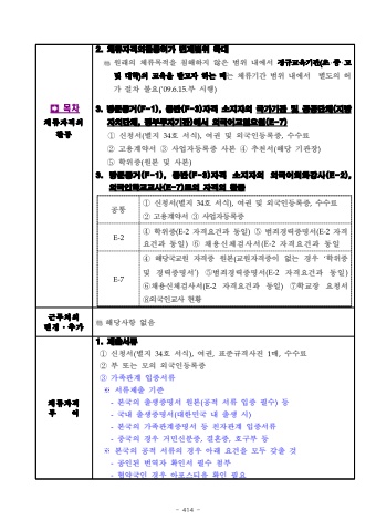 - 414 %uf000%ubaa9%ucc28%uccb4%ub958%uc790%uaca9%uc678%ud65c%ub3d92. %uccb4%ub958%uc790%uaca9%uc678%ud65c%ub3d9%ud5c8%uac00 %uba74%uc81c%ubc94%uc704 %ud655%ub300%uc6d0%ub798%uc758 %uccb4%ub958%ubaa9%uc801%uc744 %uce68%ud574%ud558%uc9c0 %uc54a%uc740 %ubc94%uc704 %ub0b4%uc5d0%uc11c %uc815%uaddc%uad50%uc721%uae30%uad00(%ucd08%u2027%uc911%u2027%uace0%ubc0f %ub300%ud559)%uc758 %uad50%uc721%uc744 %ubc1b%uace0%uc790 %ud558%ub294 %ub54c%ub294 %uccb4%ub958%uae30%uac04 %ubc94%uc704 %ub0b4%uc5d0%uc11c %ubcc4%ub3c4%uc758 %ud5c8%uac00 %uc808%ucc28 %ubd88%uc694(%u201809.6.15.%ubd80 %uc2dc%ud589)3. %ubc29%ubb38%ub3d9%uac70(F-1), %ub3d9%ubc18(F-3)%uc790%uaca9 %uc18c%uc9c0%uc790%uc758 %uad6d%uac00%uae30%uad00 %ubc0f %uacf5%uacf5%ub2e8%uccb4(%uc9c0%ubc29%uc790%uce58%ub2e8%uccb4, %uc815%ubd80%ud22c%uc790%uae30%uad00)%uc5d0%uc11c %uc678%uad6d%uc5b4%uad50%uc5f4%uc694%uc6d0(E-7) %u2460%uc2e0%uccad%uc11c(%ubcc4%uc9c0 34%ud638 %uc11c%uc2dd),%uc5ec%uad8c %ubc0f %uc678%uad6d%uc778%ub4f1%ub85d%uc99d,%uc218%uc218%ub8cc%u2461%uace0%uc6a9%uacc4%uc57d%uc11c %u2462%uc0ac%uc5c5%uc790%ub4f1%ub85d%uc99d %uc0ac%ubcf8 %u2463%ucd94%ucc9c%uc11c(%ud574%ub2f9 %uae30%uad00%uc7a5)%u2464%ud559%uc704%uc99d(%uc6d0%ubcf8 %ubc0f %uc0ac%ubcf8)3. %ubc29%ubb38%ub3d9%uac70(F-1), %ub3d9%ubc18(F-3)%uc790%uaca9 %uc18c%uc9c0%uc790%uc758 %uc678%uad6d%uc5b4%ud68c%ud654%uac15%uc0ac(E-2), %uc678%uad6d%uc778%ud559%uad50%uad50%uc0ac(E-7)%ub85c%uc758 %uc790%uaca9%uc678 %ud65c%ub3d9%uacf5%ud1b5%u2460%uc2e0%uccad%uc11c(%ubcc4%uc9c0 34%ud638 %uc11c%uc2dd),%uc5ec%uad8c %ubc0f %uc678%uad6d%uc778%ub4f1%ub85d%uc99d,%uc218%uc218%ub8cc%u2461%uace0%uc6a9%uacc4%uc57d%uc11c %u2462%uc0ac%uc5c5%uc790%ub4f1%ub85d%uc99dE-2%u2463%ud559%uc704%uc99d(E-2%uc790%uaca9%uc694%uac74%uacfc %ub3d9%uc77c)%u2464%ubc94%uc8c4%uacbd%ub825%uc99d%uba85%uc11c(E-2%uc790%uaca9%uc694%uac74%uacfc %ub3d9%uc77c)%u2465%ucc44%uc6a9%uc2e0%uccb4%uac80%uc0ac%uc11c(E-2%uc790%uaca9%uc694%uac74%uacfc %ub3d9%uc77c %u2463%ud574%ub2f9%uad6d%uad50%uc6d0 %uc790%uaca9%uc99d %uc6d0%ubcf8(%uad50%uc6d0%uc790%uaca9%uc99d%uc774 %uc5c6%ub294 %uacbd%uc6b0 %u2018%ud559%uc704%uc99d %ubc0f%uacbd%ub825%uc99d%uba85%uc11c%ubc94%uc8c4%uacbd%ub825%uc99d%uba85%uc11c%uc790%uaca9%uc694%uac74%uacfc %ub3d9%uc77c%u2465%ucc44%uc6a9%uc2e0%uccb4%uac80%uc0ac%uc11c(E-2%uc790%uaca9%uc694%uac74%uacfc %ub3d9%uc77c)%u2466%ud559%uad50%uc7a5 %uc694%uccad%uc11c%u2467%uc678%uad6d%uc778%uad50%uc0ac %ud604%ud669%ubcc0%uacbd%u2024%ucd94%uac00%ud574%ub2f9%uc0ac%ud56d %uc5c6%uc74c%uccb4%ub958%uc790%uaca9%ubd80%uc5ec1. %uc81c%ucd9c%uc11c%ub958%u2460%uc2e0%uccad%uc11c(%ubcc4%uc9c0 34%ud638 %uc11c%uc2dd),%uc5ec%uad8c,%ud45c%uc900%uaddc%uaca9%uc0ac%uc9c4 1%ub9e4,%uc218%uc218%ub8cc%u2461%ubd80 %ub610%ub294 %ubaa8%uc758 %uc678%uad6d%uc778%ub4f1%ub85d%uc99d%u2462%uac00%uc871%uad00%uacc4 %uc785%uc99d%uc11c%ub958%u203b%uc11c%ub958%uc81c%ucd9c %uae30%uc900-%ubcf8%uad6d%uc758 %ucd9c%uc0dd%uc99d%uba85%uc11c %uc6d0%ubcf8(%uacf5%uc801 %uc11c%ub958 %uc785%uc99d %ud544%uc218)%ub4f1-%uad6d%ub0b4 %ucd9c%uc0dd%uc99d%uba85%uc11c(%ub300%ud55c%ubbfc%uad6d %ub0b4 %ucd9c%uc0dd %uc2dc)-%ubcf8%uad6d%uc758 %uac00%uc871%uad00%uacc4%uc99d%uba85%uc11c %ub4f1 %uce5c%uc790%uad00%uacc4 %uc785%uc99d%uc11c%ub958-%uc911%uad6d%uc758 %uacbd%uc6b0 %uac70%ubbfc%uc2e0%ubd84%uc99d,%uacb0%ud63c%uc99d,%ud638%uad6c%ubd80 %ub4f1%u203b%ubcf8%uad6d%uc758 %uacf5%uc801 %uc11c%ub958%uc758 %uacbd%uc6b0 %uc544%ub798 %uc694%uac74%uc744 %ubaa8%ub450 %uac16%ucd9c %uac83-%uacf5%uc778%ub41c %ubc88%uc5ed%uc790 %ud655%uc778%uc11c %ud544%uc218 %ucca8%ubd80-%ud611%uc57d%uad6d%uc778 %uacbd%uc6b0 %uc544%ud3ec%uc2a4%ud2f0%uc720 %ud655%uc778 %ud544%uc694