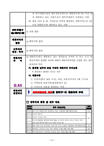 - 419 %ub978 %uc5f0%uad6c%uac1c%ubc1c%uc2dc%uc124%uc758 %ud544%uc218%uc804%ubb38%uc778%ub825%uc73c%ub85c %ub300%ud55c%ubbfc%uad6d%uc5d0 3%ub144 %uc774%uc0c1 %uacc4%uc18d %uccb4%ub958%ud558%uace0 %uc788%ub294 %uc0ac%ub78c%uc73c%ub85c%uc11c %ubc95%ubb34%ubd80%uc7a5%uad00%uc774 %uc778%uc815%ud558%ub294 %uc0ac%ub78c18.%ubcc4%ud45c 1%uc7582%uc911 24.%uac70%uc8fc(F-2)%ub2e4%ubaa9%uc5d0 %ud574%ub2f9%ud558%ub294 %uccb4%ub958%uc790%uaca9%uc73c%ub85c 2%ub144 %uc774%uc0c1 %ub300%ud55c%ubbfc%uad6d%uc5d0 %uccb4%ub958%ud558%uace0 %uc788%ub294 %uc0ac%ub78c1%ud68c%uc5d0%ubd80%uc5ec%ud560%uc218%uc788%ub294%uccb4%ub958%uae30%uac04%uc0c1%ud55c%uc0c1%ud55c %uc5c6%uc74c%uccb4%ub958%uc790%uaca9%uc678%ud65c%ub3d9%ud574%ub2f9%uc0ac%ud56d %uc5c6%uc74c%uadfc%ubb34%ucc98%uc758%ubcc0%uacbd%u2024%ucd94%uac00%ud574%ub2f9%uc0ac%ud56d %uc5c6%uc74c%uccb4%ub958%uc790%uaca9%ubd80%uc5ec%uf000%ub300%ud55c%ubbfc%uad6d%uc5d0%uc11c %uccb4%ub958%ud558%uace0 %uc788%ub294 %uc601%uc8fc(F-5)%uc790%uaca9%uc758 %ubd80 %ub610%ub294 %ubaa8%uac00 %ub300%ud55c%ubbfc%uad6d%uc5d0%uc11c %ucd9c%uc0dd%ud55c %uc790%ub140%uc5d0 %ub300%ud558%uc5ec %uccb4%ub958%uc790%uaca9%ubd80%uc5ec%ub97c %uc2e0%uccad%ud55c %uacbd%uc6b0 %uc601%uc8fc(F-5)%uc790%uaca9 %ubd80%uc5ec%uac00.%ucd9c%uc0dd%ud55c %ub0a0%ubd80%ud130 90%uc77c %uc774%ub0b4%uc5d0 %uccb4%ub958%uc790%uaca9 %ubd80%uc5ec%uc2e0%uccad%u203b %ud574%uc678%uc5d0%uc11c %ucd9c%uc0dd%ud55c %uc790%ub140%ub294 %uc81c%uc678%ub098.%uc81c%ucd9c%uc11c%ub958%u2460%uc2e0%uccad%uc11c(%ubcc4%uc9c0 34%ud638 %uc11c%uc2dd),%uc5ec%uad8c,%ud45c%uc900%uaddc%uaca9%uc0ac%uc9c4 %ub9e4%uc218%uc218%ub8cc%u2461%uac00%uc871%uad00%uacc4 %uc785%uc99d%uc11c%ub958(%ucd9c%uc0dd%uc99d%uba85%uc11c %ub4f1)%u2462%uad6d%uc801%uad6d%uc758 %uc2e0%ubd84%uc744 %uc99d%uba85%ud558%ub294 %uc11c%ub958%uccb4%ub958%uc790%uaca9%ubcc0%uacbd%ud5c8%uac00%u25a1%uc601%uc8fc%uc790%uaca9 %uc885%ub958 %ubc0f %uc138%ubd80 %uc57d%ud638%uc678%uad6d%uc801%ub3d9%ud3ec%ub97c %uc81c%uc678%ud55c %uc601%uc8fc(F-5) %uccb4%ub958%uc790%uaca9 %ubd80%uc5ec%uc601%uc8fc%uc790%uaca9%uc138%ubd80%uc57d%ud638%uc601%uc8fc %ub300%uc0c1(%uba85%uce6d)%uc2dc%ud589%ub839%ubcc4%ud45c1%uc7583F-5-15%ub144 %uc774%uc0c1 %ub300%ud55c%ubbfc%uad6d%uc5d0 %uccb4%ub958%ud558%uace0 %uc788%ub294 %uc0ac%ub78c(%uc774%ud558 %u201c%uc77c%ubc18 %uc601%uc8fc%uc790%u201d%ub77c %ud568)1%ud638F-5-2%uad6d%ubbfc%uc758 %ubc30%uc6b0%uc7902%ud638F-5-3%uad6d%ubbfc%uc758 %ubbf8%uc131%ub144 %uc790%ub140F-5-4%uc601%uc8fc%uc790%uaca9(%uc810%uc8fc%uc81c %uc601%uc8fc%uc790%uaca9 %ucde8%ub4dd %uc81c%uc678)%uc18c%uc9c0%uc790%uc758 %ubc30%uc6b0%uc790 %ub610%ub294 %ubbf8%uc131%ub144 %uc790%ub140(%uc774%ud558 %u201c%uc77c%ubc18 %uc601%uc8fc%uc790%uc758 %ubc30%uc6b0%uc790 %ub610%ub294 %ubbf8%uc131%ub144 %uc790%ub140%u201d%ub77c %ud568)F-5-550%ub9cc %ub2ec%ub7ec %uc774%uc0c1 %ud22c%uc790%uc790%ub85c %uad6d%ubbfc 5%uc778 %uc774%uc0c1 %uace0%uc6a9%ud55c %uc0ac%ub78c(%uc774%ud558 %u201c%uace0%uc561 %ud22c%uc790%uc790%u201d%ub77c %ud568)3%ud638F-5-6%uc7ac%uc678%ub3d9%ud3ec %uc790%uaca9%uc73c%ub85c 2%ub144 %uc774%uc0c1 %uccb4%ub958%ud55c %uc0ac%ub78c(%u203b %ubcc4%ub3c4 %uc9c0%uce68 %uc801%uc6a9)4%ud638F-5-7%uc678%uad6d%uc801%ub3d9%ud3ec%ub85c%uc11c %uad6d%uc801%ucde8%ub4dd %uc694%uac74%uc744 %uac16%ucd98 %uc0ac%ub78c(%u203b %ubcc4%ub3c4 %uc9c0%uce68 %uc801%uc6a9)5%ud638