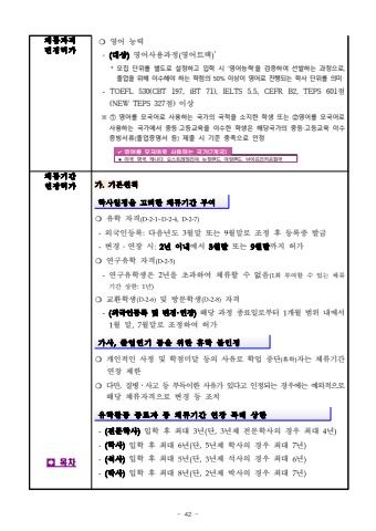 - 42 -%uccb4%ub958%uc790%uaca9%ubcc0%uacbd%ud5c8%uac00%u274d%uc601%uc5b4 %ub2a5%ub825- (%ub300%uc0c1)%uc601%uc5b4%uc0ac%uc6a9%uacfc%uc815(%uc601%uc5b4%ud2b8%ub799)** %ubaa8%uc9d1 %ub2e8%uc704%ub97c %ubcc4%ub3c4%ub85c %uc124%uc815%ud558%uace0 %uc785%ud559 %uc2dc %u2018%uc601%uc5b4%ub2a5%ub825%u2019%uc744 %uac80%uc99d%ud558%uc5ec %uc120%ubc1c%ud558%ub294 %uacfc%uc815%uc73c%ub85c, %uc878%uc5c5%uc744 %uc704%ud574 %uc774%uc218%ud574%uc57c %ud558%ub294 %ud559%uc810%uc758 50% %uc774%uc0c1%uc774 %uc601%uc5b4%ub85c %uc9c4%ud589%ub418%ub294 %ud559%uc0ac %ub2e8%uc704%ub97c %uc758%ubbf8-TOEFL 530(CBT 197, iBT 71), IELTS 5.5, CEFR B2, TEPS 601%uc810(NEW TEPS 327%uc810) %uc774%uc0c1%u203b %u2780 %uc601%uc5b4%ub97c %ubaa8%uad6d%uc5b4%ub85c %uc0ac%uc6a9%ud558%ub294 %uad6d%uac00%uc758 %uad6d%uc801%uc744 %uc18c%uc9c0%ud55c %ud559%uc0dd %ub610%ub294 %u2781%uc601%uc5b4%ub97c %ubaa8%uad6d%uc5b4%ub85c%uc0ac%uc6a9%ud558%ub294 %uad6d%uac00%uc5d0%uc11c %uc911%ub4f1%u2027%uace0%ub4f1%uad50%uc721%uc744 %uc774%uc218%ud55c %ud559%uc0dd%uc740 %ud574%ub2f9%uad6d%uac00%uc758 %uc911%ub4f1%u2027%uace0%ub4f1%uad50%uc721 %uc774%uc218%uc99d%ube59%uc11c%ub958(%uc878%uc5c5%uc99d%uba85%uc11c %ub4f1) %uc81c%ucd9c %uc2dc %uae30%uc900 %ucda9%uc871%uc73c%ub85c %uc778%uc815%u2714 %uc601%uc5b4%ub97c %ubaa8%uad6d%uc5b4%ub85c %uc0ac%uc6a9%ud558%ub294 %uad6d%uac00(7%uac1c%uad6d)%u25aa %ubbf8%uad6d, %uc601%uad6d, %uce90%ub098%ub2e4, %uc624%uc2a4%ud2b8%ub808%uc77c%ub9ac%uc544, %ub274%uc9c8%ub79c%ub4dc, %uc544%uc77c%ub79c%ub4dc, %ub0a8%uc544%ud504%ub9ac%uce74%uacf5%ud654%uad6d%uccb4%ub958%uae30%uac04%uc5f0%uc7a5%ud5c8%uac00%uf000%ubaa9%ucc28%uac00.%uae30%ubcf8%uc6d0%uce59%ud559%uc0ac%uc77c%uc815%uc744 %uace0%ub824%ud55c %uccb4%ub958%uae30%uac04 %ubd80%uc5ec%u274d%uc720%ud559 %uc790%uaca9(D-2-1~D-2-4,D-2-7)-%uc678%uad6d%uc778%ub4f1%ub85d:%ub2e4%uc74c%ub144%ub3c4 3%uc6d4%ub9d0 %ub610%ub294 9%uc6d4%ub9d0%ub85c %uc870%uc815 %ud6c4 %ub4f1%ub85d%uc99d %ubc1c%uae09-%ubcc0%uacbd%u2024%uc5f0%uc7a5 %uc2dc:2%ub144 %uc774%ub0b4%uc5d0%uc11c 3%uc6d4%ub9d0%ub610%ub294 9%uc6d4%ub9d0%uae4c%uc9c0 %ud5c8%uac00%u274d%uc5f0%uad6c%uc720%ud559 %uc790%uaca9(D-2-5)-%uc5f0%uad6c%uc720%ud559%uc0dd%uc740 2%ub144%uc744 %ucd08%uacfc%ud558%uc5ec %uccb4%ub958%ud560 %uc218 %uc5c6%uc74c%ud68c %ubd80%uc5ec%ud560 %uc218 %uc788%ub294 %uccb4%ub958%uae30%uac04 %uc0c1%ud55c:1%ub144)%u274d%uad50%ud658%ud559%uc0dd(D-2-6)%ubc0f %ubc29%ubb38%ud559%uc0dd(D-2-8)%uc790%uaca9-(%uc678%uad6d%uc778%ub4f1%ub85d %ubc0f %ubcc0%uacbd%u00b7%uc5f0%uc7a5)%ud574%ub2f9 %uacfc%uc815 %uc885%ub8cc%uc77c%ub85c%ubd80%ud130 1%uac1c%uc6d4 %ubc94%uc704 %ub0b4%uc5d0%uc11c1%uc6d4 %ub9d0,7%uc6d4%ub9d0%ub85c %uc870%uc815%ud558%uc5ec %ud5c8%uac00%uac00%uc0ac,%uc878%uc5c5%uc5f0%uae30 %ub4f1%uc744 %uc704%ud55c %ud734%ud559 %ubd88%uc778%uc815%u274d%uac1c%uc778%uc801%uc778 %uc0ac%uc815 %ubc0f %ud559%uc810%ubbf8%ub2ec %ub4f1%uc758 %uc0ac%uc720%ub85c %ud559%uc5c5 %uc911%ub2e8(%ud734%ud559)%uc790%ub294 %uccb4%ub958%uae30%uac04%uc5f0%uc7a5 %uc81c%ud55c %u274d%ub2e4%ub9cc,%uc9c8%ubcd1%u2024%uc0ac%uace0 %ub4f1 %ubd80%ub4dd%uc774%ud55c %uc0ac%uc720%uac00 %uc788%ub2e4%uace0 %uc778%uc815%ub418%ub294 %uacbd%uc6b0%uc5d0%ub294 %uc608%uc678%uc801%uc73c%ub85c%ud574%ub2f9 %uccb4%ub958%uc790%uaca9%uc73c%ub85c %ubcc0%uacbd %ub4f1 %uc870%uce58%uc720%ud559%ud65c%ub3d9 %uc885%ub8cc%uc790 %ub4f1 %uccb4%ub958%uae30%uac04 %uc5f0%uc7a5 %ud2b9%ub840 %uc0c1%ud55c-(%uc804%ubb38%ud559%uc0ac)%uc785%ud559 %ud6c4 %ucd5c%ub300 3%ub144(%ub2e8,3%ub144%uc81c %uc804%ubb38%ud559%uc0ac%uc758 %uacbd%uc6b0 %ucd5c%ub300 4%ub144)-(%ud559%uc0ac)%uc785%ud559 %ud6c4 %ucd5c%ub300 6%ub144(%ub2e8,5%ub144%uc81c %ud559%uc0ac%uc758 %uacbd%uc6b0 %ucd5c%ub300 7%ub144)-(%uc11d%uc0ac)%uc785%ud559 %ud6c4 %ucd5c%ub300 5%ub144(%ub2e8,3%ub144%uc81c %uc11d%uc0ac%uc758 %uacbd%uc6b0 %ucd5c%ub300 6%ub144)-(%ubc15%uc0ac)%uc785%ud559 %ud6c4 %ucd5c%ub300 8%ub144(%ub2e8,2%ub144%uc81c %ubc15%uc0ac%uc758 %uacbd%uc6b0 %ucd5c%ub300 7%ub144)