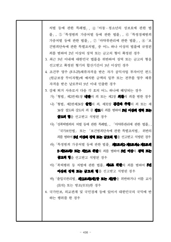 - 436 %ucc98%ubc8c %ub4f1%uc5d0 %uad00%ud55c %ud2b9%ub840%ubc95%u300d,%u2463%u300c%uc544%ub3d9%u2024%uccad%uc18c%ub144%uc758 %uc131%ubcf4%ud638%uc5d0 %uad00%ud55c %ubc95%ub960%u300d,%u2464%u300c%ud2b9%uc815%ubc94%uc8c4 %uac00%uc911%ucc98%ubc8c %ub4f1%uc5d0 %uad00%ud55c %ubc95%ub960%u300d,%u2465%u300c%ud2b9%uc815%uacbd%uc81c%ubc94%uc8c4 %uac00%uc911%ucc98%ubc8c %ub4f1%uc5d0 %uad00%ud55c %ubc95%ub960%u300d,%u2466%u300c%ub9c8%uc57d%ub958%uad00%ub9ac%uc5d0 %uad00%ud55c %ubc95%ub960%u300d,%u2467%u300c%ubcf4%uac74%ubc94%uc8c4%ub2e8%uc18d%uc5d0 %uad00%ud55c %ud2b9%ubcc4%uc870%uce58%ubc95%u300d%uc911 %uc5b4%ub290 %ud558%ub098 %uc774%uc0c1%uc758 %ubc95%ub960%uc5d0 %uaddc%uc815%ub41c %uc8c4%ub97c %ubc94%ud558%uc5ec 2%ub144 %uc774%uc0c1%uc758 %uc9d5%uc5ed %ub610%ub294 %uae08%uace0%uc758 %ud615%uc774 %ud655%uc815%ub41c %uacbd%uc6b03.%ucd5c%uadfc 5%ub144 %uc774%ub0b4%uc5d0 %ub300%ud55c%ubbfc%uad6d %ubc95%ub960%uc744 %uc704%ubc18%ud558%uc5ec %uc9d5%uc5ed %ub610%ub294 %uae08%uace0%uc758 %ud615%uc744 %uc120%uace0%ubc1b%uace0 %ud655%uc815%ub41c %ud615%uae30%uc758 %ud569%uc0b0%uae30%uac04%uc774 3%ub144 %uc774%uc0c1%uc778 %uacbd%uc6b04.%uc870%uac74%ubd80 %uc601%uc8fc (F-5-25)%uccb4%ub958%uc790%uaca9%uc744 %ubc1b%uc740 %uc790%uac00 %uacf5%uc775%uc0ac%uc5c5 %ud22c%uc790%uc774%ubbfc %ud380%ub4dc(%uc6d0%uae08%ubcf4%uc7a5 %ubb34%uc774%uc790%ud615)%uc5d0 %uc608%uce58%ud55c %uae08%uc561%uc758 %uc77c%ubd80 %ub610%ub294 %uc804%ubd80%ub97c %uc601%uc8fc %uccb4%ub958%uc790%uaca9%uc744 %ubc1b%uc740 %ub0a0%ub85c%ubd80%ud130 5%ub144 %uc774%ub0b4 %uc778%ucd9c%ud55c %uacbd%uc6b05.%uac15%uc81c %ud1f4%uac70 %uc0ac%uc720%ub85c%uc11c %ub2e4%uc74c %uac01 %ud638%uc758 %uc5b4%ub290 %ud558%ub098%uc5d0 %ud574%ub2f9%ub418%ub294 %uacbd%uc6b0%uac00)%u300c%ud615%ubc95%u300d%uc81c2%ud3b8%uc81c1%uc7a5 %ub0b4%ub780%uc758 %uc8c4 %ub610%ub294 %uc81c2%uc7a5 %uc678%ud658%uc758 %uc8c4%ub97c %ubc94%ud55c %uacbd%uc6b0%ub098)%u300c%ud615%ubc95%u300d%uc81c2%ud3b8%uc81c24%uc7a5 %uc0b4%uc778%uc758 %uc8c4,%uc81c32%uc7a5 %uac15%uac04%uacfc %ucd94%ud589%uc758 %uc8c4 %ub610%ub294 %uc81c38%uc7a5%uc808%ub3c4%uc640 %uac15%ub3c4%uc758 %uc8c4 %uc911 %uac15%ub3c4%uc758 %uc8c4%ub97c %ubc94%ud558%uc5ec 5%ub144 %uc774%uc0c1%uc758 %uc9d5%uc5ed %ub610%ub294 %uae08%uace0%uc758%ud615%uc744%uc120%uace0%ubc1b%uace0 %uc11d%ubc29%ub41c %uacbd%uc6b0%ub2e4%uc131%ud3ed%ub825%ubc94%uc8c4%uc758 %ucc98%ubc8c %ub4f1%uc5d0 %uad00%ud55c %ud2b9%ub840%ubc95%ub9c8%uc57d%ub958%uad00%ub9ac%uc5d0 %uad00%ud55c %ubc95%ub960%u300c%uad6d%uac00%ubcf4%uc548%ubc95%u300d%ub610%ub294 %u300c%ubcf4%uac74%ubc94%uc8c4%ub2e8%uc18d%uc5d0 %uad00%ud55c %ud2b9%ubcc4%uc870%uce58%ubc95%u300d%uc704%ubc18%uc758 %uc8c4%ub97c%ubc94%ud558%uc5ec5%ub144 %uc774%uc0c1%uc758 %uc9d5%uc5ed%ub610%ub294 %uae08%uace0%uc758 %ud615%uc744 %uc120%uace0%ubc1b%uace0 %uc11d%ubc29%ub41c %uacbd%uc6b0%ub77c)%u300c%ud2b9%uc815%ubc94%uc8c4 %uac00%uc911%ucc98%ubc8c %ub4f1%uc5d0 %uad00%ud55c %ubc95%ub960%u300d%uc81c5%uc870%uc7582%u00b7%uc81c5%uc870%uc7584%u00b7%uc81c5%uc870%uc7585%u00b7%uc81c5%uc870%uc7589%ub610%ub294 %uc81c11%uc870 %uc704%ubc18%uc758 %uc8c4%ub97c %ubc94%ud558%uc5ec 5%ub144 %uc774%uc0c1%uc758 %uc9d5%uc5ed %ub610%ub294 %uae08%uace0%uc758%ud615%uc744%uc120%uace0%ubc1b%uace0 %uc11d%ubc29%ub41c %uacbd%uc6b0%ub9c8)%u300c%ud3ed%ub825%ud589%uc704 %ub4f1 %ucc98%ubc8c%uc5d0 %uad00%ud55c %ubc95%ub960%u300d%uc81c4%uc870 %uc704%ubc18%uc758 %uc8c4%ub97c %ubc94%ud558%uc5ec 5%ub144 %uc774%uc0c1%uc758%uc9d5%uc5ed %ub610%ub294%uae08%uace0%uc758 %ud615%uc744 %uc120%uace0%ubc1b%uace0 %uc11d%ubc29%ub41c %uacbd%uc6b0%ubc14)%u300c%ucd9c%uc785%uad6d%uad00%ub9ac%ubc95%u300d%uc81c12%uc870%uc7583%uc81c1%ud56d %ub610%ub294 %uc81c2%ud56d%uc744 %uc704%ubc18%ud558%uac70%ub098 %uc774%ub97c %uad50%uc0ac(%u654e%u5506)%ub610%ub294 %ubc29%uc870(%u5e47%u52a9)%ud55c %uacbd%uc6b06.%uad6d%uac00%uc548%ubcf4,%uc678%uad50%uad00%uacc4 %ubc0f %uad6d%ubbfc%uacbd%uc81c %ub4f1%uc5d0 %uc788%uc5b4%uc11c %ub300%ud55c%ubbfc%uad6d%uc758 %uad6d%uc775%uc5d0 %ubc18%ud558%ub294 %ud589%uc704%ub97c %ud55c %uacbd%uc6b0
