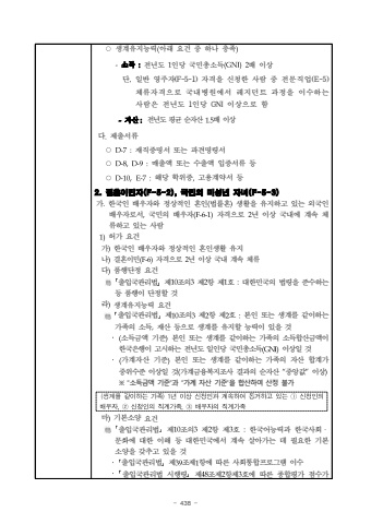 - 438 %u25cb%uc0dd%uacc4%uc720%uc9c0%ub2a5%ub825(%uc544%ub798 %uc694%uac74 %uc911 %ud558%ub098 %ucda9%uc871)-%uc18c%ub4dd :%uc804%ub144%ub3c4 1%uc778%ub2f9 %uad6d%ubbfc%ucd1d%uc18c%ub4dd(GNI)2%ubc30 %uc774%uc0c1%ub2e8, %uc77c%ubc18 %uc601%uc8fc%uc790(F-5-1) %uc790%uaca9%uc744 %uc2e0%uccad%ud55c %uc0ac%ub78c %uc911%uc804%ubb38%uc9c1%uc5c5(E-5) %uccb4%ub958%uc790%uaca9%uc73c%ub85c %uad6d%ub0b4%ubcd1%uc6d0%uc5d0%uc11c %ub808%uc9c0%ub358%ud2b8 %uacfc%uc815%uc744 %uc774%uc218%ud558%ub294%uc0ac%ub78c%uc740%uc804%ub144%ub3c4 1%uc778%ub2f9 GNI %uc774%uc0c1%uc73c%ub85c %ud568-%uc790%uc0b0:%uc804%ub144%ub3c4 %ud3c9%uade0 %uc21c%uc790%uc0b01.5%ubc30 %uc774%uc0c1%ub2e4.%uc81c%ucd9c%uc11c%ub958%u25cbD-7:%uc7ac%uc9c1%uc99d%uba85%uc11c %ub610%ub294 %ud30c%uacac%uba85%ub839%uc11c %u25cbD-8,D-9:%ub9e4%ucd9c%uc561 %ub610%ub294 %uc218%ucd9c%uc561 %uc785%uc99d%uc11c%ub958 %ub4f1%u25cbD-10,E-7:%ud574%ub2f9 %ud559%uc704%uc99d,%uace0%uc6a9%uacc4%uc57d%uc11c %ub4f12. %uacb0%ud63c%uc774%ubbfc%uc790(F-5-2), %uad6d%ubbfc%uc758 %ubbf8%uc131%ub144 %uc790%ub140(F-5-3)%uac00.%ud55c%uad6d%uc778 %ubc30%uc6b0%uc790%uc640 %uc815%uc0c1%uc801%uc778 %ud63c%uc778(%ubc95%ub960%ud63c)%uc0dd%ud65c%uc744 %uc720%uc9c0%ud558%uace0 %uc788%ub294 %uc678%uad6d%uc778 %ubc30%uc6b0%uc790%ub85c%uc11c,%uad6d%ubbfc%uc758 %ubc30%uc6b0%uc790(F-6-1)%uc790%uaca9%uc73c%ub85c 2%ub144 %uc774%uc0c1 %uad6d%ub0b4%uc5d0 %uacc4%uc18d %uccb4%ub958%ud558%uace0 %uc788%ub294 %uc0ac%ub78c1)%ud5c8%uac00 %uc694%uac74%uac00)%ud55c%uad6d%uc778 %ubc30%uc6b0%uc790%uc640 %uc815%uc0c1%uc801%uc778 %ud63c%uc778%uc0dd%ud65c %uc720%uc9c0%ub098)%uacb0%ud63c%uc774%ubbfc(F-6)%uc790%uaca9%uc73c%ub85c 2%ub144 %uc774%uc0c1 %uad6d%ub0b4 %uacc4%uc18d %uccb4%ub958%ub2e4)%ud488%ud589%ub2e8%uc815 %uc694%uac74%uff62%ucd9c%uc785%uad6d%uad00%ub9ac%ubc95%uff63%uc81c10%uc870%uc7583%uc81c2%ud56d %uc81c1%ud638 :%ub300%ud55c%ubbfc%uad6d%uc758 %ubc95%ub839%uc744 %uc900%uc218%ud558%ub294 %ub4f1 %ud488%ud589%uc774 %ub2e8%uc815%ud560 %uac83%ub77c)%uc0dd%uacc4%uc720%uc9c0%ub2a5%ub825 %uc694%uac74%uff62%ucd9c%uc785%uad6d%uad00%ub9ac%ubc95%uff63%uc81c10%uc870%uc7583%uc81c2%ud56d %uc81c2%ud638 :%ubcf8%uc778 %ub610%ub294 %uc0dd%uacc4%ub97c %uac19%uc774%ud558%ub294 %uac00%uc871%uc758 %uc18c%ub4dd,%uc7ac%uc0b0 %ub4f1%uc73c%ub85c %uc0dd%uacc4%ub97c %uc720%uc9c0%ud560 %ub2a5%ub825%uc774 %uc788%uc744 %uac83%uff65(%uc18c%ub4dd%uae08%uc561 %uae30%uc900)%ubcf8%uc778 %ub610%ub294 %uc0dd%uacc4%ub97c %uac19%uc774%ud558%ub294 %uac00%uc871%uc758 %uc18c%ub4dd%ud569%uc0b0%uae08%uc561%uc774 %ud55c%uad6d%uc740%ud589%uc774 %uace0%uc2dc%ud558%ub294 %uc804%ub144%ub3c4 %uc77c%uc778%ub2f9 %uad6d%ubbfc%ucd1d%uc18c%ub4dd(GNI)%uc774%uc0c1%uc77c %uac83%uff65(%uac00%uacc4%uc790%uc0b0 %uae30%uc900)%ubcf8%uc778 %ub610%ub294 %uc0dd%uacc4%ub97c %uac19%uc774%ud558%ub294 %uac00%uc871%uc758 %uc790%uc0b0 %ud569%uacc4%uac00 %uc911%uc704%uc218%uc900 %uc774%uc0c1%uc77c %uac83(%uac00%uacc4%uae08%uc735%ubcf5%uc9c0%uc870%uc0ac %uacb0%uacfc%uc758 %uc21c%uc790%uc0b0 %u201c%uc911%uc559%uac12%u201d%uc774%uc0c1)%u203b %u201c%uc18c%ub4dd%uae08%uc561 %uae30%uc900%u201d%uacfc %u201c%uac00%uacc4 %uc790%uc0b0 %uae30%uc900%u201d%uc744 %ud569%uc0b0%ud558%uc5ec %uc0b0%uc815 %ubd88%uac00%ub9c8)%uae30%ubcf8%uc18c%uc591%uc694%uac74%uff62%ucd9c%uc785%uad6d%uad00%ub9ac%ubc95%uff63%uc81c10%uc870%uc7583%uc81c2%ud56d %uc81c3%ud638 :%ud55c%uad6d%uc5b4%ub2a5%ub825%uacfc %ud55c%uad6d%uc0ac%ud68c%u318d%ubb38%ud654%uc5d0 %ub300%ud55c %uc774%ud574 %ub4f1 %ub300%ud55c%ubbfc%uad6d%uc5d0%uc11c %uacc4%uc18d %uc0b4%uc544%uac00%ub294 %ub370 %ud544%uc694%ud55c %uae30%ubcf8%uc18c%uc591%uc744 %uac16%ucd94%uace0 %uc788%uc744 %uac83%uff65%uff62%ucd9c%uc785%uad6d%uad00%ub9ac%ubc95%uff63%uc81c39%uc870%uc81c1%ud56d%uc5d0 %ub530%ub978 %uc0ac%ud68c%ud1b5%ud569%ud504%ub85c%uadf8%ub7a8 %uc774%uc218%uff65%uff62%ucd9c%uc785%uad6d%uad00%ub9ac%ubc95 %uc2dc%ud589%ub839%uff63%uc81c48%uc870%uc81c2%ud56d%uc81c3%ud638%uc5d0 %ub530%ub978 %uc885%ud569%ud3c9%uac00 %uc810%uc218%uac00 (%uc0dd%uacc4%ub97c%uac19%uc774%ud558%ub294%uac00%uc871)1%ub144%uc774%uc0c1%uc2e0%uccad%uc778%uacfc%uacc4%uc18d%ud558%uc5ec%ub3d9%uac70%ud558%uace0%uc788%ub294%u2460%uc2e0%uccad%uc778%uc758%ubc30%uc6b0%uc790,%u2461%uc2e0%uccad%uc778%uc758%uc9c1%uacc4%uac00%uc871,%u2462%ubc30%uc6b0%uc790%uc758%uc9c1%uacc4%uac00%uc871