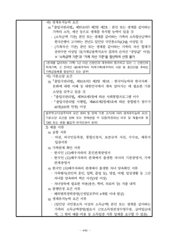 - 440 %ub77c)%uc0dd%uacc4%uc720%uc9c0%ub2a5%ub825 %uc694%uac74%uff62%ucd9c%uc785%uad6d%uad00%ub9ac%ubc95%uff63%uc81c10%uc870%uc7583%uc81c2%ud56d %uc81c2%ud638 :%ubcf8%uc778 %ub610%ub294 %uc0dd%uacc4%ub97c %uac19%uc774%ud558%ub294 %uac00%uc871%uc758 %uc18c%ub4dd,%uc7ac%uc0b0 %ub4f1%uc73c%ub85c %uc0dd%uacc4%ub97c %uc720%uc9c0%ud560 %ub2a5%ub825%uc774 %uc788%uc744 %uac83%uff65(%uc18c%ub4dd%uae08%uc561 %uae30%uc900)%ubcf8%uc778 %ub610%ub294 %uc0dd%uacc4%ub97c %uac19%uc774%ud558%ub294 %uac00%uc871%uc758 %uc18c%ub4dd%ud569%uc0b0%uae08%uc561%uc774 %ud55c%uad6d%uc740%ud589%uc774 %uace0%uc2dc%ud558%ub294 %uc804%ub144%ub3c4 %uc77c%uc778%ub2f9 %uad6d%ubbfc%ucd1d%uc18c%ub4dd(GNI)%uc774%uc0c1%uc77c %uac83%uff65(%uac00%uacc4%uc790%uc0b0 %uae30%uc900)%ubcf8%uc778 %ub610%ub294 %uc0dd%uacc4%ub97c %uac19%uc774%ud558%ub294 %uac00%uc871%uc758 %uc790%uc0b0 %ud569%uacc4%uac00 %uc911%uc704%uc218%uc900 %uc774%uc0c1%uc77c %uac83(%uac00%uacc4%uae08%uc735%ubcf5%uc9c0%uc870%uc0ac %uacb0%uacfc%uc758 %uc21c%uc790%uc0b0 %u201c%uc911%uc559%uac12%u201d%uc774%uc0c1)%u203b %u201c%uc18c%ub4dd%uae08%uc561 %uae30%uc900%u201d%uacfc %u201c%uac00%uacc4 %uc790%uc0b0 %uae30%uc900%u201d%uc744 %ud569%uc0b0%ud558%uc5ec %uc0b0%uc815 %ubd88%uac00%ub9c8)%uae30%ubcf8%uc18c%uc591%uc694%uac74%uff62%ucd9c%uc785%uad6d%uad00%ub9ac%ubc95%uff63%uc81c10%uc870%uc7583%uc81c2%ud56d %uc81c3%ud638 :%ud55c%uad6d%uc5b4%ub2a5%ub825%uacfc %ud55c%uad6d%uc0ac%ud68c%u318d%ubb38%ud654%uc5d0 %ub300%ud55c %uc774%ud574 %ub4f1 %ub300%ud55c%ubbfc%uad6d%uc5d0%uc11c %uacc4%uc18d %uc0b4%uc544%uac00%ub294 %ub370 %ud544%uc694%ud55c %uae30%ubcf8%uc18c%uc591%uc744 %uac16%ucd94%uace0 %uc788%uc744 %uac83%uff65%uff62%ucd9c%uc785%uad6d%uad00%ub9ac%ubc95%uff63%uc81c39%uc870%uc81c1%ud56d%uc5d0 %ub530%ub978 %uc0ac%ud68c%ud1b5%ud569%ud504%ub85c%uadf8%ub7a8 %uc774%uc218%uff65%uff62%ucd9c%uc785%uad6d%uad00%ub9ac%ubc95 %uc2dc%ud589%ub839%uff63%uc81c48%uc870%uc81c2%ud56d%uc81c3%ud638%uc5d0 %ub530%ub978 %uc885%ud569%ud3c9%uac00 %uc810%uc218%uac00 60%uc810(100%uc810 %ub9cc%uc810)%uc774%uc0c12)%uc81c%ucd9c %uc11c%ub958%uacf5%ud1b5 %uc11c%ub958%uff65%uc5ec%uad8c,%uc678%uad6d%uc778%ub4f1%ub85d%uc99d,%ud1b5%ud569%uc2e0%uccad%uc11c,%ud45c%uc900%uaddc%uaca9 %uc0ac%uc9c4,%uc218%uc218%ub8cc,%uccb4%ub958%uc9c0 %uc785%uc99d%uc11c%ub958%uac00%uc871%uad00%uacc4 %ud655%uc778 %uc11c%ub958%uff65%ud55c%uad6d%uc778 (%u524d)%ubc30%uc6b0%uc790%uc640%uc758 %ud63c%uc778%uad00%uacc4%uc99d%uba85%uc11c%uff65%ud55c%uad6d%uc778 (%u524d)%ubc30%uc6b0%uc790%uc640%uc758 %uad00%uacc4%uc5d0%uc11c %ucd9c%uc0dd%ud55c %uc790%ub140%uc758 %uae30%ubcf8%uc99d%uba85%uc11c,%uac00%uc871%uad00%uacc4%uc99d%uba85%uc11c%ud55c%uad6d%uc778 (%u524d)%ubc30%uc6b0%uc790%uc640%uc758 %uad00%uacc4%uc5d0%uc11c %ucd9c%uc0dd%ud55c %uc790%ub140 %uc591%uc721%ud655%uc778 %uc11c%ub958%uff65%uac00%uc871%ud589%uc0ac(%uce5c%uc778%ucc99 %ud63c%uc778,%uc785%ud559,%uc878%uc5c5 %ub4f1),%uba85%uc808,%uc5ec%ud589,%uc77c%uc0c1%uc0dd%ud65c %ub4f1 %uadf8%uac04 %uc790%ub140%ub97c %uc591%uc721%ud558%uba70 %ucc0d%uc740 %uc0ac%uc9c4(3%uc7a5 %uc774%uc0c1)%uff65%uc790%ub140%uc591%uc721%uc5d0 %ud544%uc694%ud55c %ube44%uc6a9(%uc6a9%ub3c8,%ud559%ube44,%uc758%ub8cc%ube44 %ub4f1)%uc9c0%ucd9c %ub0b4%uc5ed%ud488%ud589%ub2e8%uc815 %uc694%uac74 %uc11c%ub958%uff65%ud574%uc678%ubc94%uc8c4%uacbd%ub825%uc99d%uba85(%uc2e0%uccad%uc77c%ub85c%ubd80%ud130 6%uac1c%uc6d4 %uc774%ub0b4 %ubc1c%uae09)%uc0dd%uacc4%uc720%uc9c0%ub2a5%ub825 %uc694%uac74 %uc11c%ub958%uff65(%uc77c%uc778%ub2f9 %uad6d%ubbfc%ucd1d%uc18c%ub4dd %uc774%uc0c1%uc758 %uc18c%ub4dd%uae08%uc561)%ubcf8%uc778 %ub610%ub294 %uc0dd%uacc4%ub97c %uac19%uc774%ud558%ub294 %uac00%uc871%uc758 %uc18c%ub4dd%uae08%uc561%uc99d%uba85(%ud544%uc694%uc2dc %uadfc%ub85c%uc18c%ub4dd%uc6d0%ucc9c%uc9d5%uc218%uc601%uc218%uc99d,%uae09%uc5ec%uc785%uae08%ub0b4%uc5ed,%uadf8 %ubc16%uc758 %ub9e4%ucd9c%uff65%ube44%uc6a9 %ub4f1 %uc18c%ub4dd%uc785%uc99d %uc11c%ub958 %uc77c%uccb4%ub97c %uc694%uad6c%ud560 %uc218 %uc788%uc74c)(%uc0dd%uacc4%ub97c%uac19%uc774%ud558%ub294%uac00%uc871)1%ub144%uc774%uc0c1%uc2e0%uccad%uc778%uacfc%uacc4%uc18d%ud558%uc5ec%ub3d9%uac70%ud558%uace0%uc788%ub294%u2460%uc2e0%uccad%uc778%uc758%uc9c1%uacc4%uac00%uc871,%u2461%ud55c%uad6d%uc778(%u524d)%ubc30%uc6b0%uc790%uc758%uc9c1%uacc4%uac00%uc871(%ubc30%uc6b0%uc790%uc758%uc0ac%ub9dd%ub4f1%ud63c%uc778%ub2e8%uc808%ud6c4%uc5d0%ub3c4%uac00%uc871%uacf5%ub3d9%uccb4%ub97c%ud615%uc131%ud558%uace0%uc788%ub294%uacbd%uc6b0)%ubc95%ubb34%ubd80%uace0%uc2dc(%uc601%uc8fc%uc790%uaca9%uc694%uac74%uc644%ud654%ubc0f%uba74%uc81c%uae30%uc900%uace0%uc2dc)%uc5d0%ub530%ub77c%uc0dd%uacc4%uc720%uc9c0%ub2a5%ub825%uc694%uac74%uff65%uae30%ubcf8%uc18c%uc591%uc694%uac74%uc744%uc644%ud654%ub610%ub294%uba74%uc81c%ubc1b%uc744%uc218%uc788%uc74c(%uc801%uc6a9%ub300%uc0c1%uc5ec%ubd80%ubc0f%uc81c%ucd9c%uc11c%ub958%ub4f1