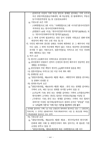 - 441 %uff65(%uc911%uc704%uc218%uc900 %uc774%uc0c1%uc758 %uac00%uacc4 %uc790%uc0b0)%ubcf8%uc778%uacfc %uc0dd%uacc4%ub97c %uac19%uc774%ud558%ub294 %uac00%uc871 %ubaa8%ub450%uc758 %uc790%uc0b0 %uc99d%ube59%uc11c%ub958(%uc785%ucd9c%uae08%uac70%ub798%ub0b4%uc5ed,%uc608%uff65%uc801%uae08%uc99d%uba85,%uc804%uff65%uc6d4%uc138%uacc4%uc57d%uc11c,%ubd80%ub3d9%uc0b0%ub4f1%uae30%uc0ac%ud56d%uc804%ubd80%uc99d%uba85 %ub4f1)%ubc0f %uc2e0%uc6a9%uc815%ubcf4%uc870%ud68c%uc11c%uae30%ubcf8%uc18c%uc591 %uc694%uac74 %uc11c%ub958%uff65(%uc0ac%ud68c%ud1b5%ud569%ud504%ub85c%uadf8%ub7a8 %uc774%uc218)%u201c%uc0ac%ud68c%ud1b5%ud569%ud504%ub85c%uadf8%ub7a8 %uc774%uc218%uc99d%u201d(%ud55c%uad6d%uc774%ubbfc%uc601%uc8fc%uc801%uaca9%uacfc%uc815 %ub610%ub294 %ud55c%uad6d%uc774%ubbfc%uadc0%ud654%uc801%uaca9%uacfc%uc815)%uff65(%uc885%ud569%ud3c9%uac00 60%uc810 %uc774%uc0c1)%u201c%ud55c%uad6d%uc774%ubbfc%uc601%uc8fc%uc801%uaca9%uc2dc%ud5d8 %ud569%uaca9%uc99d%u201d(KIPRAT)%ub610%ub294 %u201c%ud55c%uad6d%uc774%ubbfc%uadc0%ud654%uc801%uaca9%uc2dc%ud5d8 %ud569%uaca9%uc99d%u201d(KINAT)%uadf8 %ubc16%uc5d0 %uc2ec%uc0ac%uc5d0 %ud544%uc694%ud558%ub2e4%uace0 %uccad%uc7a5 %ub4f1%uc774 %uc778%uc815%ud55c %uc11c%ub958(%uc694%uac74 %uc644%ud654%uff65%uba74%uc81c %ub300%uc0c1%uc790%uc758 %ud574%ub2f9 %uc0ac%uc720 %uc18c%uba85 %uc790%ub8cc %ub4f1)%ub4f1%ub2e4.%uad6d%ubbfc%uc778 %ubc30%uc6b0%uc790%uc640 %ud63c%uc778%ud55c %uc0c1%ud0dc%ub85c %uad6d%ub0b4%uc5d0 %uccb4%ub958%ud558%ub358 %uc911 %uadf8 %ubc30%uc6b0%uc790%uc758 %uc0ac%ub9dd%uc774%ub098 %uc2e4%uc885,%uadf8 %ubc16%uc5d0 %uc790%uc2e0%uc5d0%uac8c %ucc45%uc784%uc774 %uc5c6%ub294 %uc0ac%uc720%ub85c %uc815%uc0c1%uc801%uc778 %ud63c%uc778%uad00%uacc4%ub97c %uc720%uc9c0%ud560 %uc218 %uc5c6%ub294 %uc0ac%ub78c%uc73c%ub85c%uc11c,%uacb0%ud63c%uc774%ubbfc(F-6)%uc790%uaca9%uc73c%ub85c 2%ub144 %uc774%uc0c1 %uad6d%ub0b4%uc5d0 %uacc4%uc18d %uccb4%ub958%ud558%uace0 %uc788%ub294 %uc0ac%ub78c1)%ud5c8%uac00 %uc694%uac74%uac00)%ud55c%uad6d%uc778 (%u524d)%ubc30%uc6b0%uc790%uc758 %uadc0%ucc45%uc0ac%uc720%ub85c %ud63c%uc778%uad00%uacc4 %ub2e8%uc808%ud63c%uc778%uad00%uacc4%uac00 %ub2e8%uc808%ub418%uae30 %uc804%uae4c%uc9c0 %uc2e0%uccad%uc778%uacfc %ud55c%uad6d%uc778 %ubc30%uc6b0%uc790%uac00 %uc815%uc0c1%uc801%uc778 %ud63c%uc778%uc0dd%ud65c%uc744 %uc720%uc9c0%ud558%uc600%uace0,%ud63c%uc778%ub2e8%uc808%uc758 %uc8fc%ub41c %ucc45%uc784%uc774 %ud55c%uad6d%uc778 (%u524d)%ubc30%uc6b0%uc790%uc5d0%uac8c %uc788%uc74c%uc744 %ud655%uc778%ub098)%uacb0%ud63c%uc774%ubbfc(F-6)%uc790%uaca9%uc73c%ub85c 2%ub144 %uc774%uc0c1 %uad6d%ub0b4 %uacc4%uc18d %uccb4%ub958%ub2e4)%ud488%ud589%ub2e8%uc815 %uc694%uac74%uff62%ucd9c%uc785%uad6d%uad00%ub9ac%ubc95%uff63%uc81c10%uc870%uc7583%uc81c2%ud56d %uc81c1%ud638 :%ub300%ud55c%ubbfc%uad6d%uc758 %ubc95%ub839%uc744 %uc900%uc218%ud558%ub294 %ub4f1 %ud488%ud589%uc774 %ub2e8%uc815%ud560 %uac83%ub77c)%uc0dd%uacc4%uc720%uc9c0%ub2a5%ub825 %uc694%uac74%uff62%ucd9c%uc785%uad6d%uad00%ub9ac%ubc95%uff63%uc81c10%uc870%uc7583%uc81c2%ud56d %uc81c2%ud638 :%ubcf8%uc778 %ub610%ub294 %uc0dd%uacc4%ub97c %uac19%uc774%ud558%ub294 %uac00%uc871%uc758 %uc18c%ub4dd,%uc7ac%uc0b0 %ub4f1%uc73c%ub85c %uc0dd%uacc4%ub97c %uc720%uc9c0%ud560 %ub2a5%ub825%uc774 %uc788%uc744 %uac83%uff65(%uc18c%ub4dd%uae08%uc561 %uae30%uc900)%ubcf8%uc778 %ub610%ub294 %uc0dd%uacc4%ub97c %uac19%uc774%ud558%ub294 %uac00%uc871%uc758 %uc18c%ub4dd%ud569%uc0b0%uae08%uc561%uc774 %ud55c%uad6d%uc740%ud589%uc774 %uace0%uc2dc%ud558%ub294 %uc804%ub144%ub3c4 %uc77c%uc778%ub2f9 %uad6d%ubbfc%ucd1d%uc18c%ub4dd(GNI)%uc774%uc0c1%uc77c %uac83%uff65(%uac00%uacc4%uc790%uc0b0 %uae30%uc900)%ubcf8%uc778 %ub610%ub294 %uc0dd%uacc4%ub97c %uac19%uc774%ud558%ub294 %uac00%uc871%uc758 %uc790%uc0b0 %ud569%uacc4%uac00 %uc911%uc704%uc218%uc900 %uc774%uc0c1%uc77c %uac83(%uac00%uacc4%uae08%uc735%ubcf5%uc9c0%uc870%uc0ac %uacb0%uacfc%uc758 %uc21c%uc790%uc0b0 %u201c%uc911%uc559%uac12%u201d%uc774%uc0c1)%u203b %u201c%uc18c%ub4dd%uae08%uc561 %uae30%uc900%u201d%uacfc %u201c%uac00%uacc4 %uc790%uc0b0 %uae30%uc900%u201d%uc744 %ud569%uc0b0%ud558%uc5ec %uc0b0%uc815 %ubd88%uac00%ub9c8)%uae30%ubcf8%uc18c%uc591%uc694%uac74%uff62%ucd9c%uc785%uad6d%uad00%ub9ac%ubc95%uff63%uc81c10%uc870%uc7583%uc81c2%ud56d %uc81c3%ud638 :%ud55c%uad6d%uc5b4%ub2a5%ub825%uacfc %ud55c%uad6d%uc0ac%ud68c%u318d%ubb38%ud654%uc5d0 %ub300%ud55c %uc774%ud574 %ub4f1 %ub300%ud55c%ubbfc%uad6d%uc5d0%uc11c %uacc4%uc18d %uc0b4%uc544%uac00%ub294 %ub370 %ud544%uc694%ud55c %uae30%ubcf8%uc18c%uc591%uc744 %uac16%ucd94%uace0 %uc788%uc744 %uac83%uff65%uff62%ucd9c%uc785%uad6d%uad00%ub9ac%ubc95%uff63%uc81c39%uc870%uc81c1%ud56d%uc5d0 %ub530%ub978 %uc0ac%ud68c%ud1b5%ud569%ud504%ub85c%uadf8%ub7a8 %uc774%uc218(%uc0dd%uacc4%ub97c%uac19%uc774%ud558%ub294%uac00%uc871)1%ub144%uc774%uc0c1%uc2e0%uccad%uc778%uacfc%uacc4%uc18d%ud558%uc5ec%ub3d9%uac70%ud558%uace0%uc788%ub294%u2460%uc2e0%uccad%uc778%uc758%uc9c1%uacc4%uac00%uc871,%u2461%ud55c%uad6d%uc778(%u524d)%ubc30%uc6b0%uc790%uc758%uc9c1%uacc4%uac00%uc871(%ubc30%uc6b0%uc790%uc758%uc0ac%ub9dd%ub4f1%ud63c%uc778%ub2e8%uc808%ud6c4%uc5d0%ub3c4%uac00%uc871%uacf5%ub3d9%uccb4%ub97c%ud615%uc131%ud558%uace0%uc788%ub294%uacbd%uc6b0)