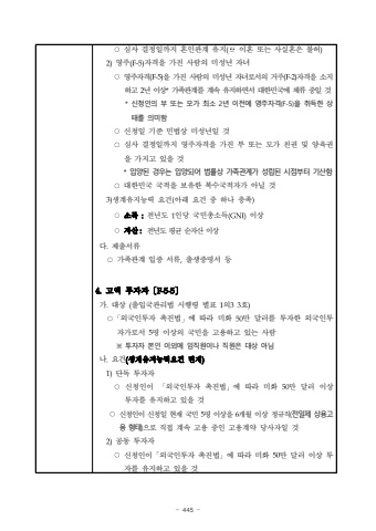 - 445 %u25cb%uc2ec%uc0ac %uacb0%uc815%uc77c%uae4c%uc9c0 %ud63c%uc778%uad00%uacc4 %uc720%uc9c0(%u203b%uc774%ud63c %ub610%ub294 %uc0ac%uc2e4%ud63c%uc740 %ubd88%ud5c8)2)%uc601%uc8fc(F-5)%uc790%uaca9%uc744 %uac00%uc9c4 %uc0ac%ub78c%uc758 %ubbf8%uc131%ub144 %uc790%ub140%u25cb%uc601%uc8fc%uc790%uaca9(F-5)%uc744 %uac00%uc9c4 %uc0ac%ub78c%uc758 %ubbf8%uc131%ub144 %uc790%ub140%ub85c%uc11c%uc758 %uac70%uc8fc(F-2)%uc790%uaca9%uc744 %uc18c%uc9c0%ud558%uace0 2%ub144 %uc774%uc0c1*%uac00%uc871%uad00%uacc4%ub97c %uacc4%uc18d %uc720%uc9c0%ud558%uba74%uc11c %ub300%ud55c%ubbfc%uad6d%uc5d0 %uccb4%ub958 %uc911%uc77c %uac83* %uc2e0%uccad%uc778%uc758 %ubd80 %ub610%ub294 %ubaa8%uac00 %ucd5c%uc18c 2%ub144 %uc774%uc804%uc5d0 %uc601%uc8fc%uc790%uaca9(F-5)%uc744 %ucde8%ub4dd%ud55c %uc0c1%ud0dc%ub97c %uc758%ubbf8%ud568 %u25cb%uc2e0%uccad%uc77c %uae30%uc900 %ubbfc%ubc95%uc0c1 %ubbf8%uc131%ub144%uc77c %uac83%u25cb%uc2ec%uc0ac %uacb0%uc815%uc77c%uae4c%uc9c0 %uc601%uc8fc%uc790%uaca9%uc744 %uac00%uc9c4 %ubd80 %ub610%ub294 %ubaa8%uac00 %uce5c%uad8c %ubc0f %uc591%uc721%uad8c%uc744 %uac00%uc9c0%uace0 %uc788%uc744 %uac83* %uc785%uc591%ub41c %uacbd%uc6b0%ub294 %uc785%uc591%ub418%uc5b4 %ubc95%ub960%uc0c1 %uac00%uc871%uad00%uacc4%uac00 %uc131%ub9bd%ub41c %uc2dc%uc810%ubd80%ud130 %uae30%uc0b0%ud568%u25cb%ub300%ud55c%ubbfc%uad6d %uad6d%uc801%uc744 %ubcf4%uc720%ud55c %ubcf5%uc218%uad6d%uc801%uc790%uac00 %uc544%ub2d0 %uac833)%uc0dd%uacc4%uc720%uc9c0%ub2a5%ub825 %uc694%uac74(%uc544%ub798 %uc694%uac74 %uc911 %ud558%ub098 %ucda9%uc871)%u25cb%uc18c%ub4dd :%uc804%ub144%ub3c4 1%uc778%ub2f9 %uad6d%ubbfc%ucd1d%uc18c%ub4dd(GNI)%uc774%uc0c1%u25cb%uc790%uc0b0:%uc804%ub144%ub3c4 %ud3c9%uade0 %uc21c%uc790%uc0b0%uc774%uc0c1%ub2e4.%uc81c%ucd9c%uc11c%ub958%u25cb%uac00%uc871%uad00%uacc4 %uc785%uc99d %uc11c%ub958,%ucd9c%uc0dd%uc99d%uba85%uc11c %ub4f14.%uace0%uc561 %ud22c%uc790%uc790%u3014F-5-5%u3015%uac00.%ub300%uc0c1 (%ucd9c%uc785%uad6d%uad00%ub9ac%ubc95 %uc2dc%ud589%ub839 %ubcc4%ud45c 1%uc7583%ud638%u25cb%u300c%uc678%uad6d%uc778%ud22c%uc790 %ucd09%uc9c4%ubc95%u300d%uc5d0 %ub530%ub77c %ubbf8%ud654 50%ub9cc %ub2ec%ub7ec%ub97c %ud22c%uc790%ud55c %uc678%uad6d%uc778%ud22c%uc790%uac00%ub85c%uc11c 5%uba85 %uc774%uc0c1%uc758 %uad6d%ubbfc%uc744 %uace0%uc6a9%ud558%uace0 %uc788%ub294 %uc0ac%ub78c%u203b %ud22c%uc790%uc790 %ubcf8%uc778 %uc774%uc678%uc5d0 %uc784%uc9c1%uc6d0%uc774%ub098 %uc9c1%uc6d0%uc740 %ub300%uc0c1 %uc544%ub2d8%ub098.%uc694%uac74(%uc0dd%uacc4%uc720%uc9c0%ub2a5%ub825%uc694%uac74 %uba74%uc81c)1)%ub2e8%ub3c5 %ud22c%uc790%uc790%u25cb%uc2e0%uccad%uc778%uc774 %u300c%uc678%uad6d%uc778%ud22c%uc790 %ucd09%uc9c4%ubc95%u300d%uc5d0 %ub530%ub77c %ubbf8%ud654 50%ub9cc %ub2ec%ub7ec %uc774%uc0c1 %ud22c%uc790%ub97c%uc720%uc9c0%ud558%uace0 %uc788%uc744 %uac83%u25cb%uc2e0%uccad%uc778%uc774 %uc2e0%uccad%uc77c %ud604%uc7ac %uad6d%ubbfc 5%uba85 %uc774%uc0c1%uc744 6%uac1c%uc6d4%uc774%uc0c1%uc815%uaddc%uc9c1(%uc804%uc77c%uc81c %uc0c1%uc6a9%uace0%uc6a9 %ud615%ud0dc)%uc73c%ub85c %uc9c1%uc811 %uacc4%uc18d %uace0%uc6a9 %uc911%uc778 %uace0%uc6a9%uacc4%uc57d %ub2f9%uc0ac%uc790%uc77c %uac832)%uacf5%ub3d9 %ud22c%uc790%uc790%u25cb%uc2e0%uccad%uc778%uc774%u300c%uc678%uad6d%uc778%ud22c%uc790 %ucd09%uc9c4%ubc95%u300d%uc5d0 %ub530%ub77c %ubbf8%ud654 50%ub9cc %ub2ec%ub7ec %uc774%uc0c1 %ud22c%uc790%ub97c %uc720%uc9c0%ud558%uace0 %uc788%uc744 %uac83