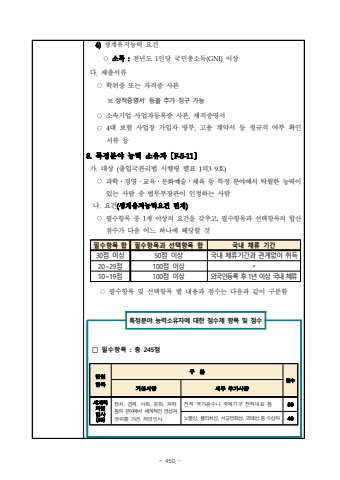 - 450 4)%uc0dd%uacc4%uc720%uc9c0%ub2a5%ub825 %uc694%uac74%u25cb%uc18c%ub4dd :%uc804%ub144%ub3c4 1%uc778%ub2f9 %uad6d%ubbfc%ucd1d%uc18c%ub4dd(GNI)%uc774%uc0c1%ub2e4.%uc81c%ucd9c%uc11c%ub958%u25cb%ud559%uc704%uc99d %ub610%ub294 %uc790%uaca9%uc99d %uc0ac%ubcf8 %u203b %uc131%uc801%uc99d%uba85%uc11c%u2019 %ub4f1%uc744 %ucd94%uac00 %uc9d5%uad6c %uac00%ub2a5%u25cb%uc18c%uc18d%uae30%uc5c5 %uc0ac%uc5c5%uc790%ub4f1%ub85d%uc99d %uc0ac%ubcf8,%uc7ac%uc9c1%uc99d%uba85%uc11c%u25cb4%ub300 %ubcf4%ud5d8 %uc0ac%uc5c5%uc7a5 %uac00%uc785%uc790 %uba85%ubd80,%uace0%uc6a9 %uacc4%uc57d%uc11c %ub4f1 %uc815%uaddc%uc9c1 %uc5ec%ubd80 %ud655%uc778%uc11c%ub958 %ub4f18.%ud2b9%uc815%ubd84%uc57c %ub2a5%ub825 %uc18c%uc720%uc790%u3014F-5-11%u3015%uac00.%ub300%uc0c1 (%ucd9c%uc785%uad6d%uad00%ub9ac%ubc95 %uc2dc%ud589%ub839 %ubcc4%ud45c 1%uc75839%ud638)%u25cb%uacfc%ud559%u2024%uacbd%uc601%u2024%uad50%uc721%u2024%ubb38%ud654%uc608%uc220%u2024%uccb4%uc721 %ub4f1 %ud2b9%uc815 %ubd84%uc57c%uc5d0%uc11c %ud0c1%uc6d4%ud55c %ub2a5%ub825%uc774%uc788%ub294 %uc0ac%ub78c %uc911 %ubc95%ubb34%ubd80%uc7a5%uad00%uc774 %uc778%uc815%ud558%ub294 %uc0ac%ub78c%ub098.%uc694%uac74(%uc0dd%uacc4%uc720%uc9c0%ub2a5%ub825%uc694%uac74 %uba74%uc81c)%u25cb%ud544%uc218%ud56d%ubaa9 %uc911 1%uac1c %uc774%uc0c1%uc758 %uc694%uac74%uc744 %uac16%ucd94%uace0,%ud544%uc218%ud56d%ubaa9%uacfc %uc120%ud0dd%ud56d%ubaa9%uc758 %ud569%uc0b0 %uc810%uc218%uac00%ub2e4%uc74c %uc5b4%ub290 %ud558%ub098%uc5d0 %ud574%ub2f9%ud560 %uac83%ud544%uc218%ud56d%ubaa9 %ud569%ud544%uc218%ud56d%ubaa9%uacfc %uc120%ud0dd%ud56d%ubaa9 %ud569%uad6d%ub0b4 %uccb4%ub958 %uae30%uac0430%uc810 %uc774%uc0c150%uc810 %uc774%uc0c1%uad6d%ub0b4 %uccb4%ub958%uae30%uac04%uacfc %uad00%uacc4%uc5c6%uc774 %ucde8%ub4dd20~29%uc810100%uc810 %uc774%uc0c1%u300310~19%uc810100%uc810 %uc774%uc0c1%uc678%uad6d%uc778%ub4f1%ub85d %ud6c4 1%ub144 %uc774%uc0c1 %uad6d%ub0b4 %uccb4%ub958%u25cb%ud544%uc218%ud56d%ubaa9 %ubc0f %uc120%ud0dd%ud56d%ubaa9 %ubcc4 %ub0b4%uc6a9%uacfc %uc810%uc218%ub294 %ub2e4%uc74c%uacfc %uac19%uc774 %uad6c%ubd84%ud568%ud2b9%uc815%ubd84%uc57c %ub2a5%ub825%uc18c%uc720%uc790%uc5d0 %ub300%ud55c %uc810%uc218%uc81c %ud56d%ubaa9 %ubc0f %uc810%uc218%u25a1 %ud544%uc218%ud56d%ubaa9 : %ucd1d 245%uc810%ub2e8%uc77c%ud56d%ubaa9%uad6c %ubd84%uc810%uc218%uae30%ubcf8%uc0ac%ud56d%uc138%ubd80 %ucd94%uac00%uc0ac%ud56d%uc138%uacc4%uc801 %uc800%uba85%uc778%uc0ac(50)%uc815%uce58, %uacbd%uc81c, %uc0ac%ud68c, %ubb38%ud654, %uacfc%ud559%ub4f1%uc758 %ubd84%uc57c%uc5d0%uc11c %uc138%uacc4%uc801%uc778 %uba85%uc131%uacfc%uad8c%uc704%ub97c %uac00%uc9c4 %uc800%uba85%uc778%uc0ac%uc804%uc9c1 %uad6d%uac00%uc6d0%uc218%ub098 %uad6d%uc81c%uae30%uad6c %uc804%uc9c1%ub300%ud45c %ub4f150%ub178%ubca8%uc0c1, %ud4f0%ub9ac%ucc98%uc0c1, %uc11c%uc6b8%ud3c9%ud654%uc0c1, %uad34%ud14c%uc0c1 %ub4f1 %uc218%uc0c1%uc79040